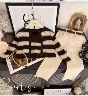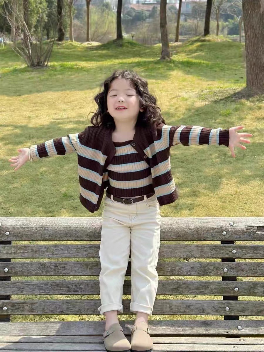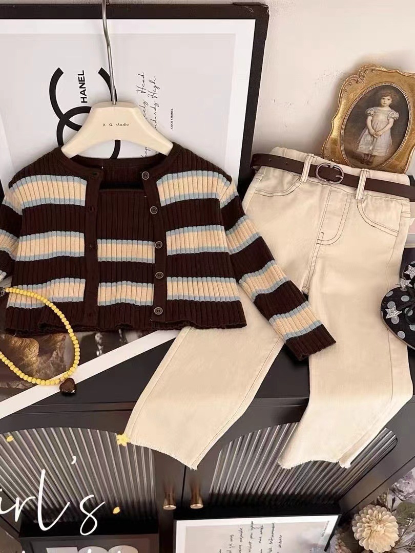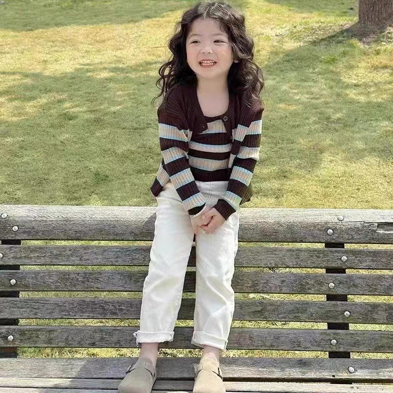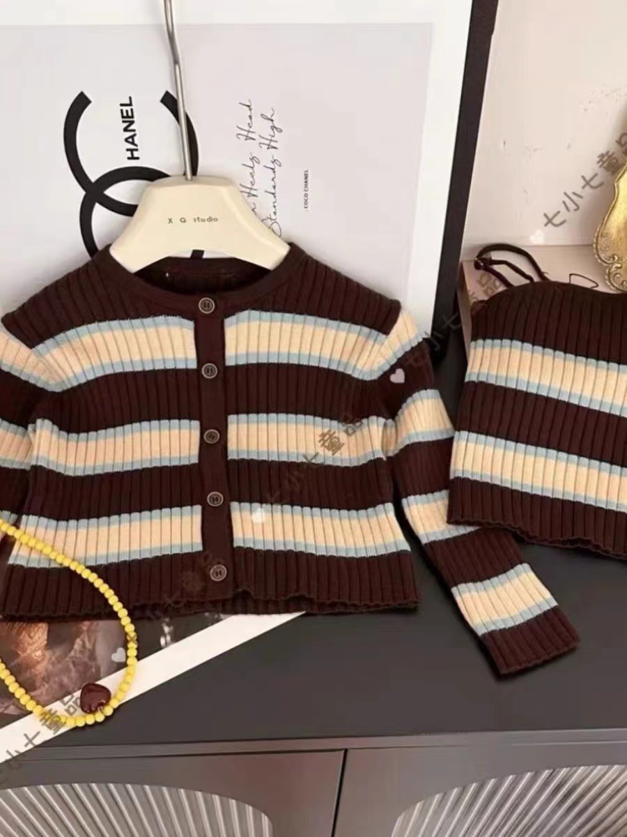 한국 스타일 소녀의 명암 컬러 스트라이프 투피스 세트 2024 가을 아기 소녀의 스타일 슬림 핏 니트 카디건 슬링 세트스토어 가기