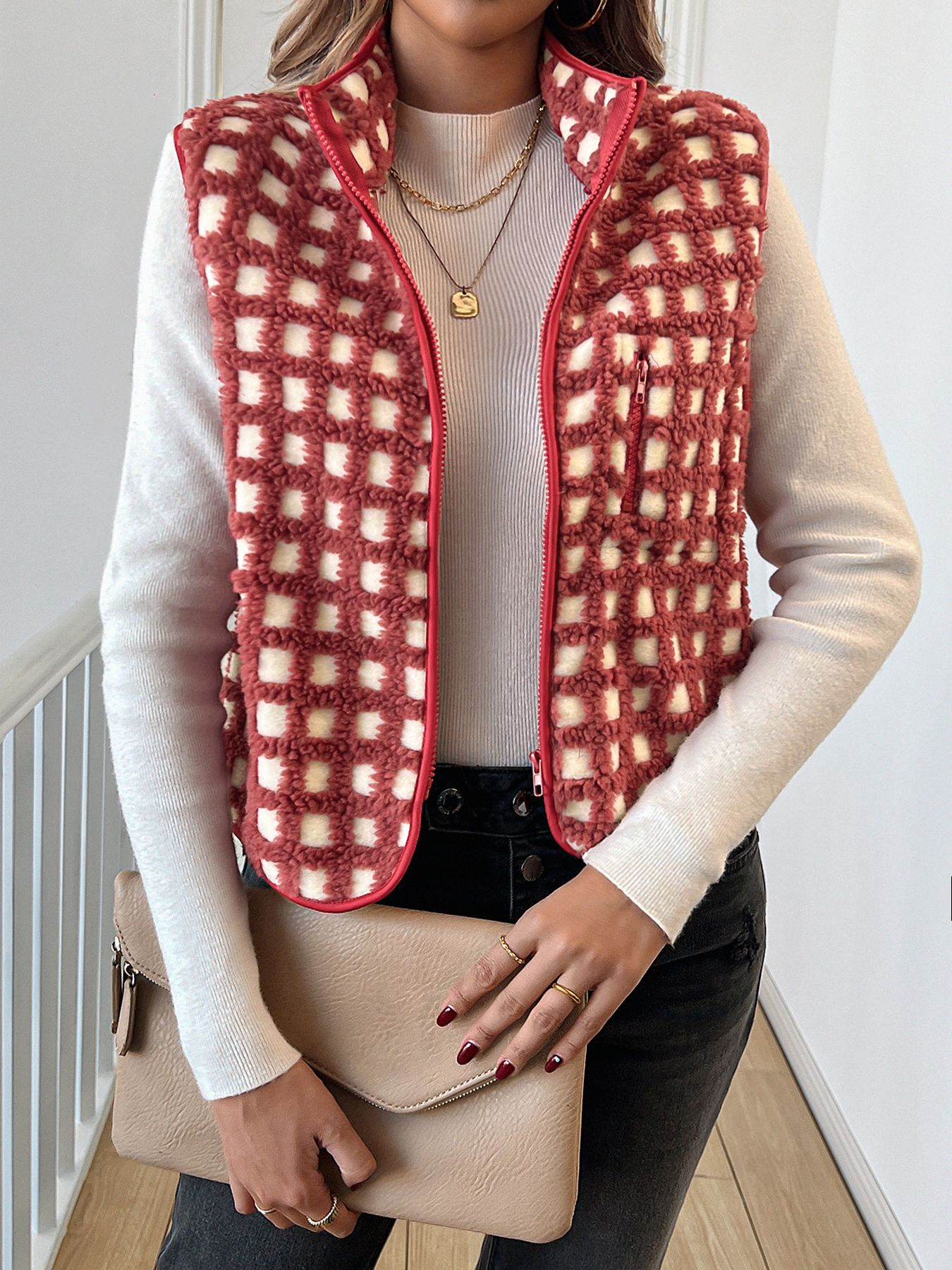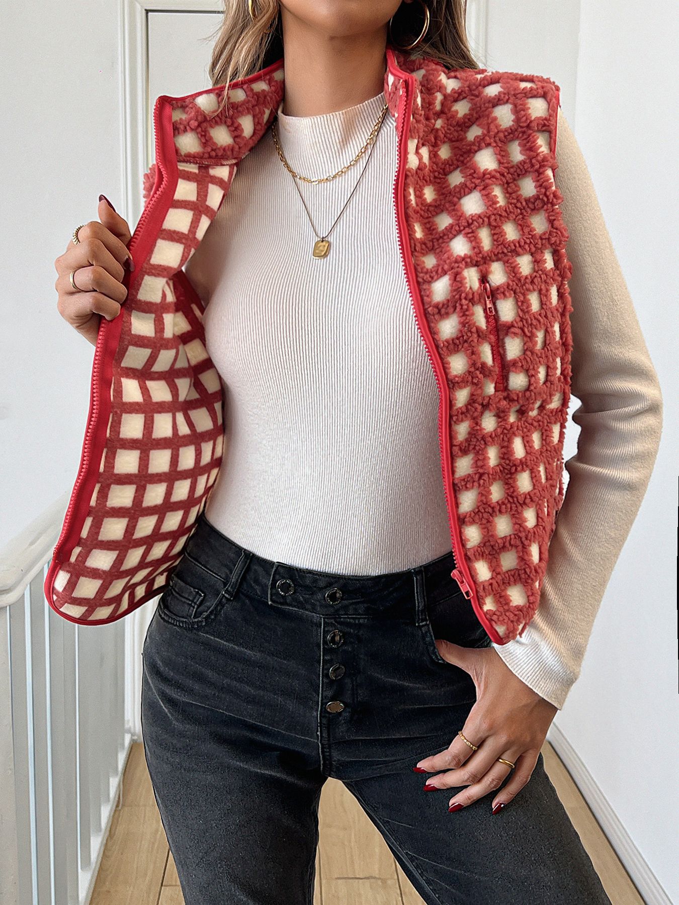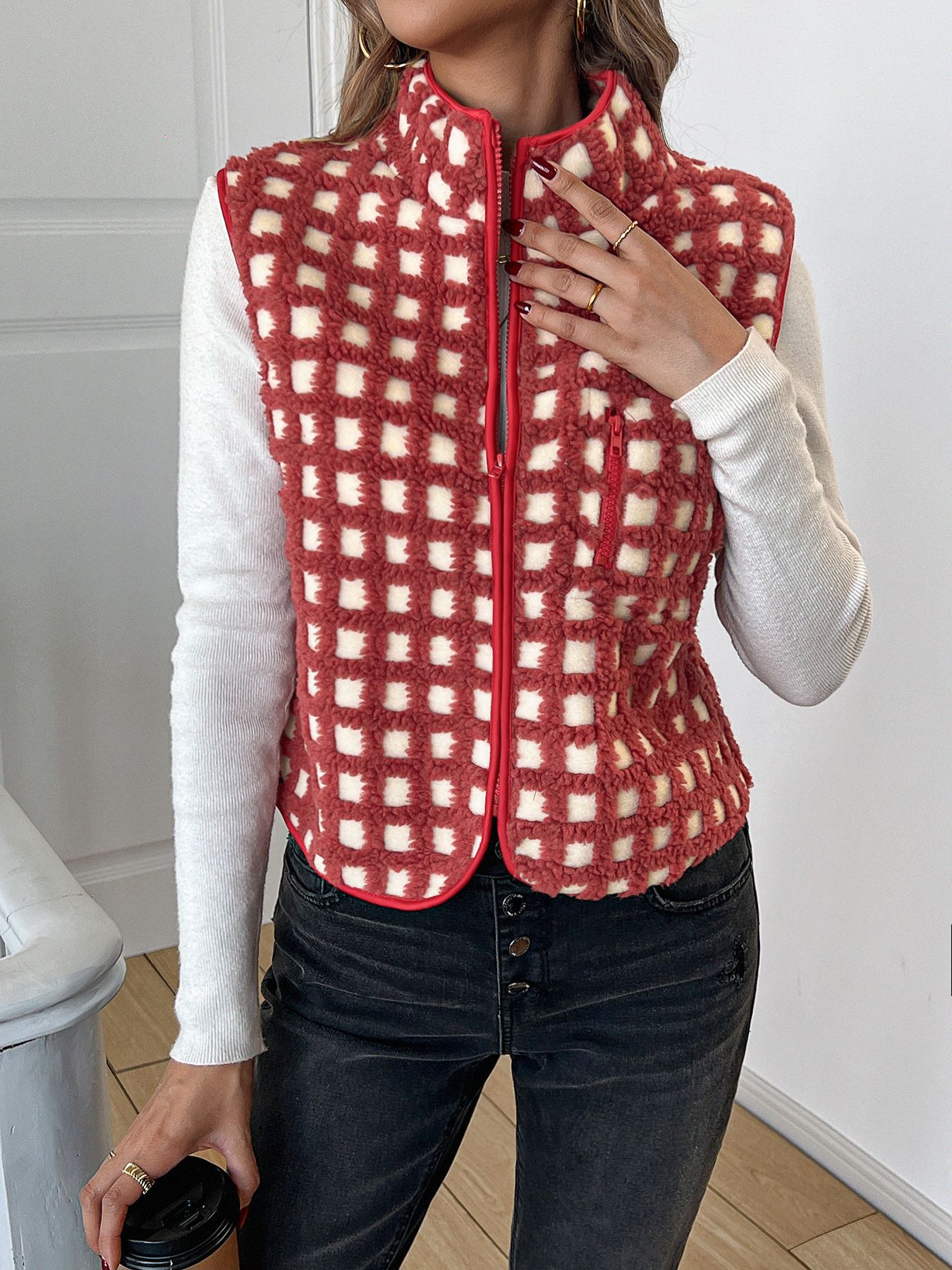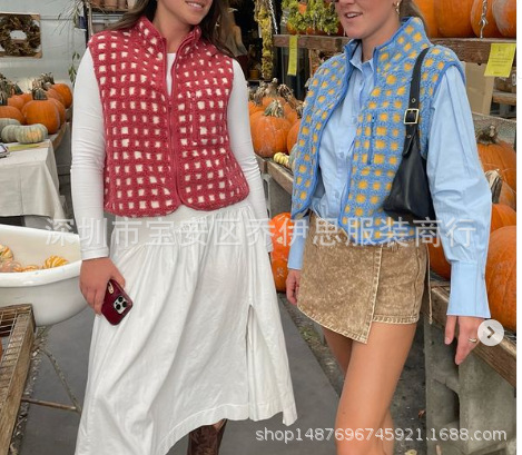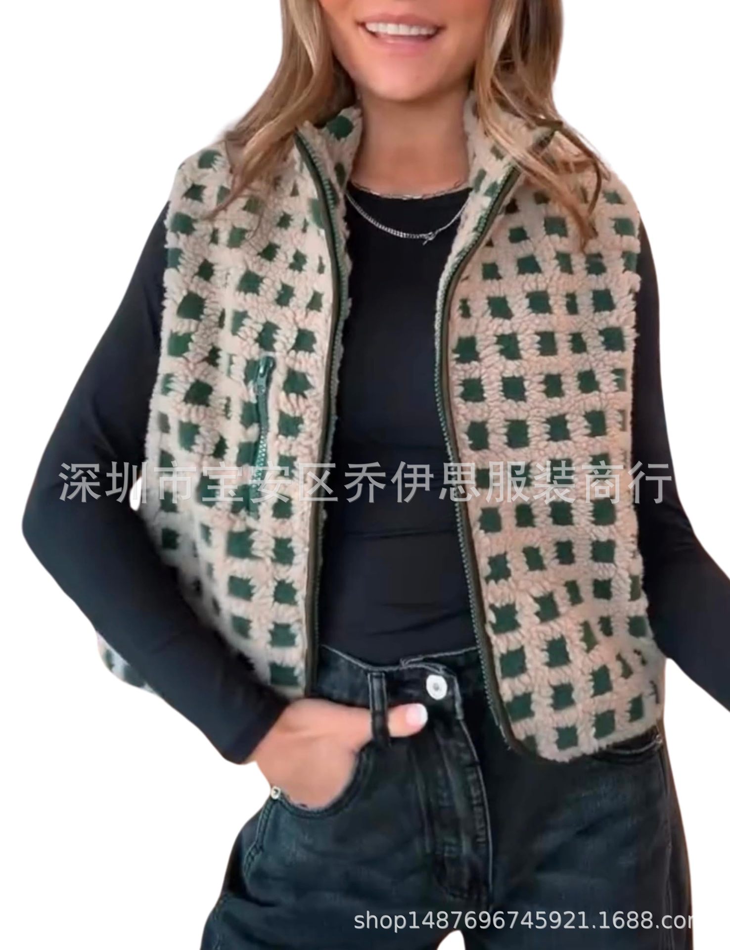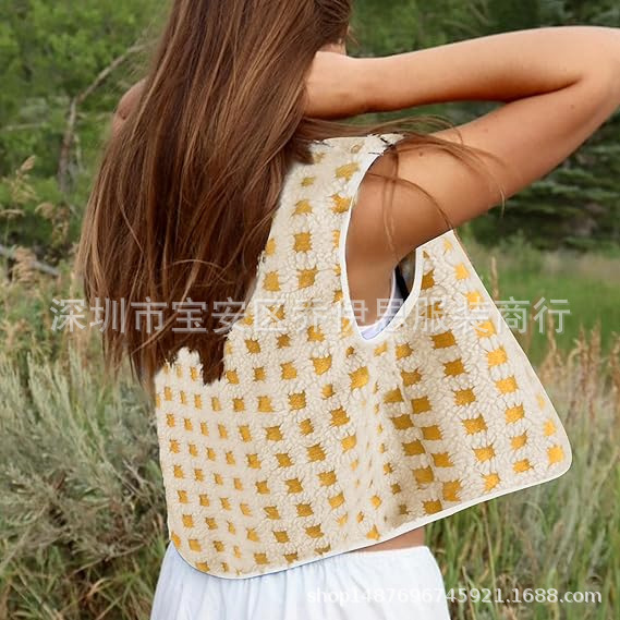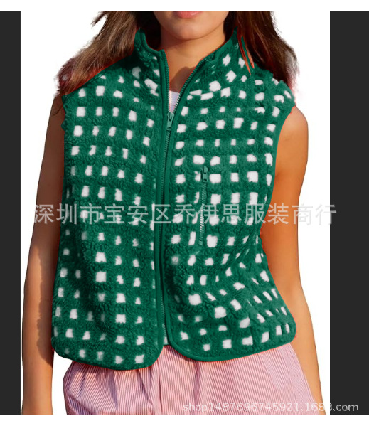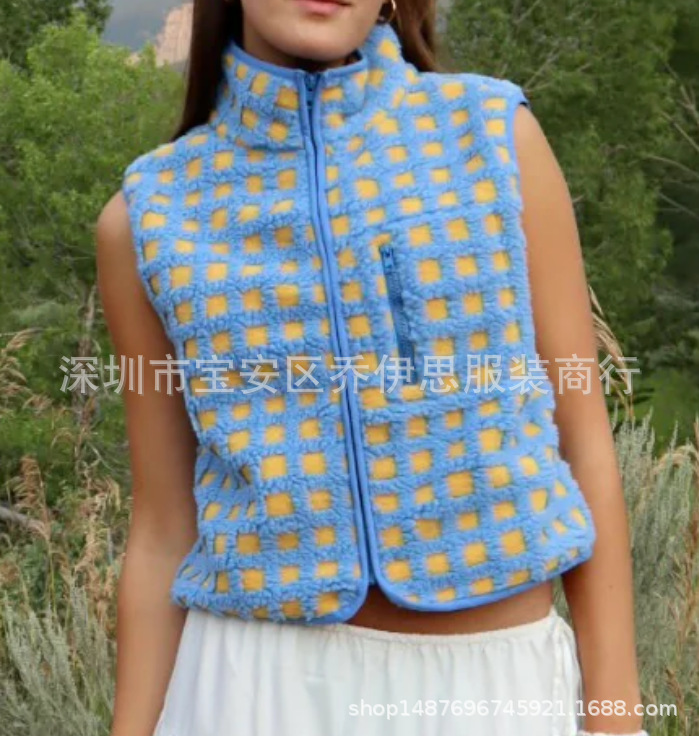 2025 가을 겨울 신상품 체크무늬 플러시 조끼 스탠드 칼라 조끼 민소매 조끼 여성용 재고 있음스토어 가기