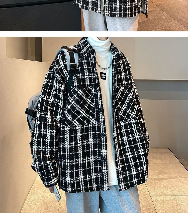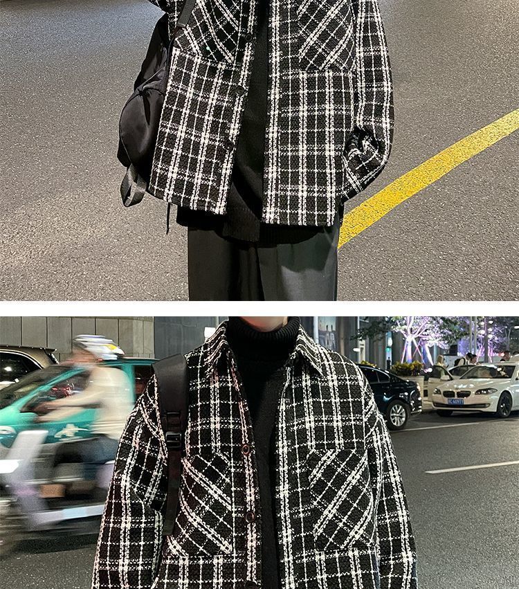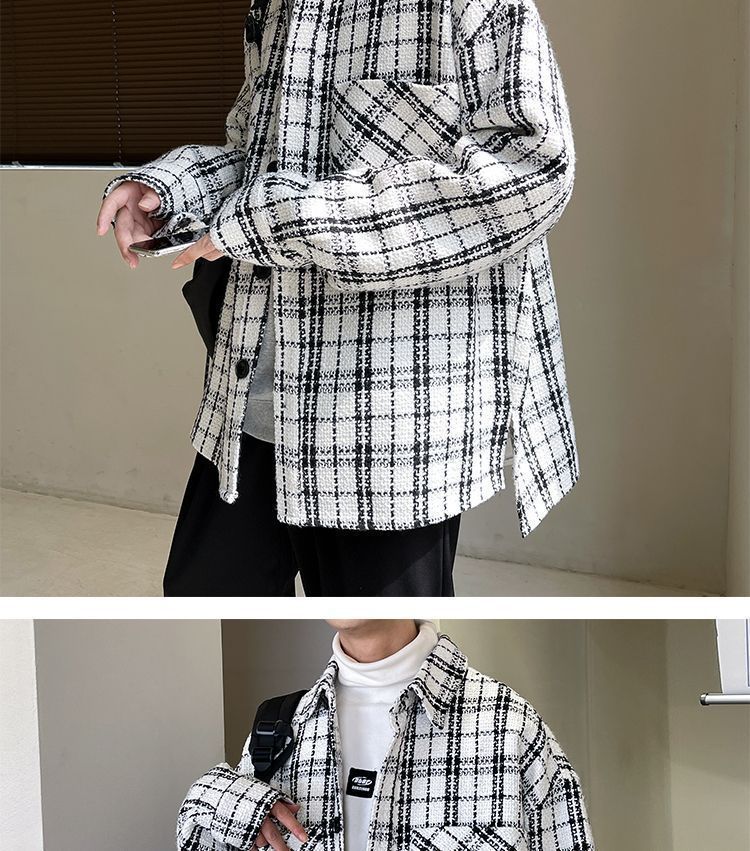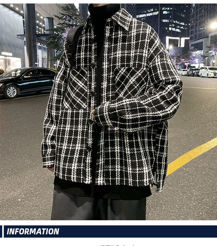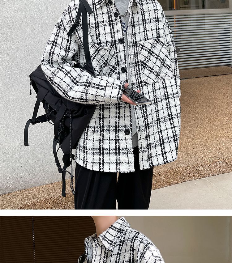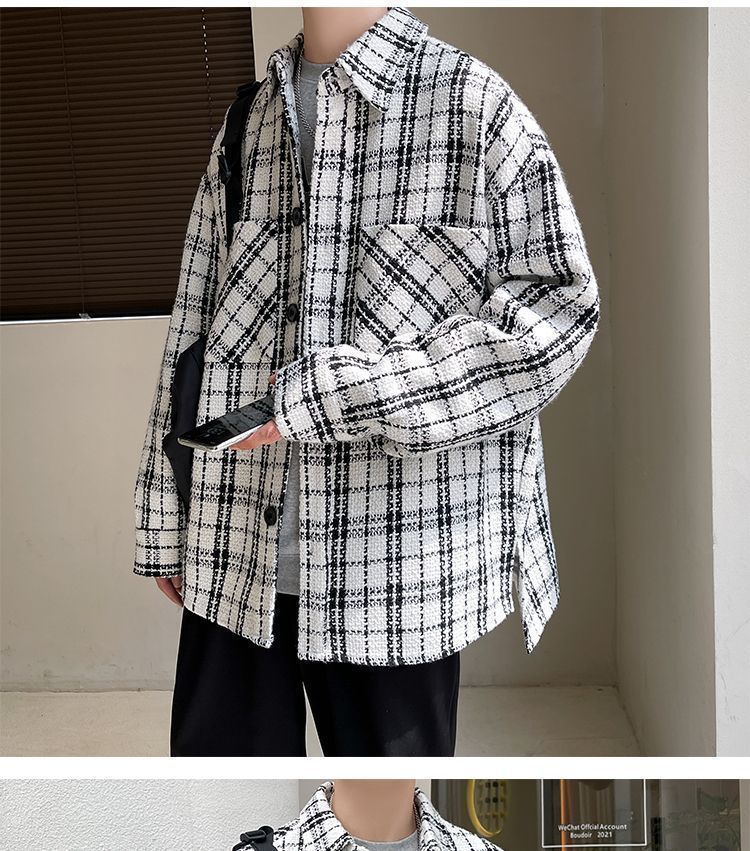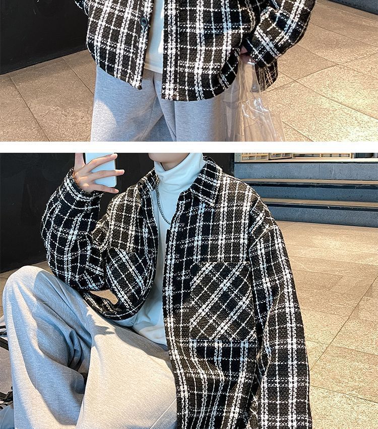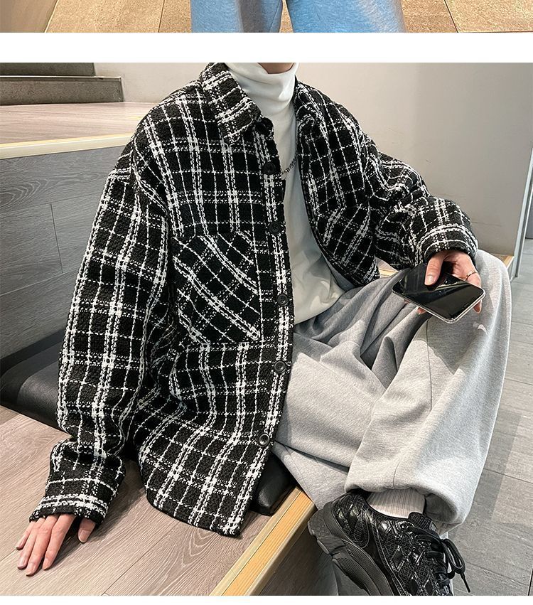 남성용 샤넬 스타일 울 재킷 가을과 겨울 감각 격자 무늬 트렌디 한 브랜드 셔츠 옷깃 트렌디 한 루즈 재킷