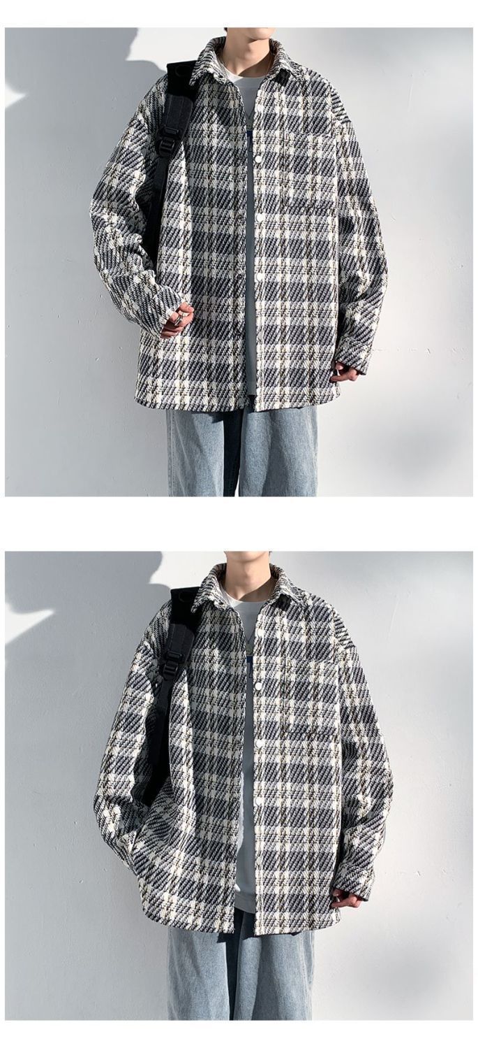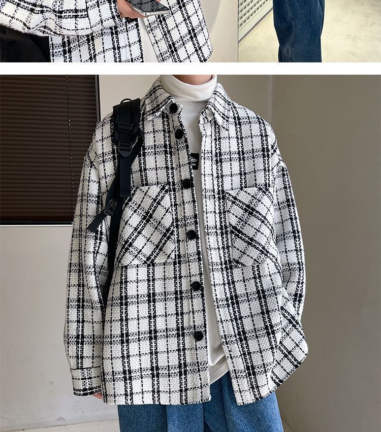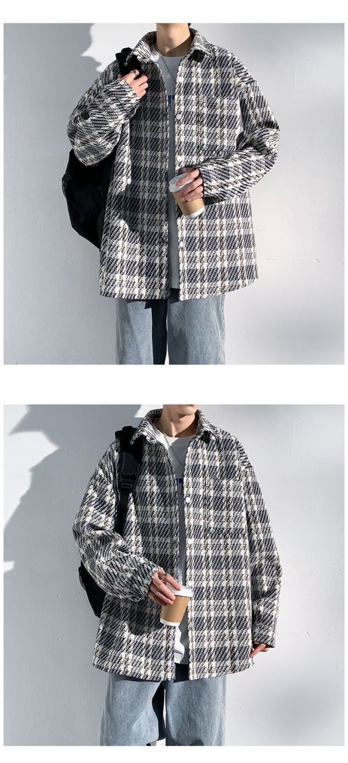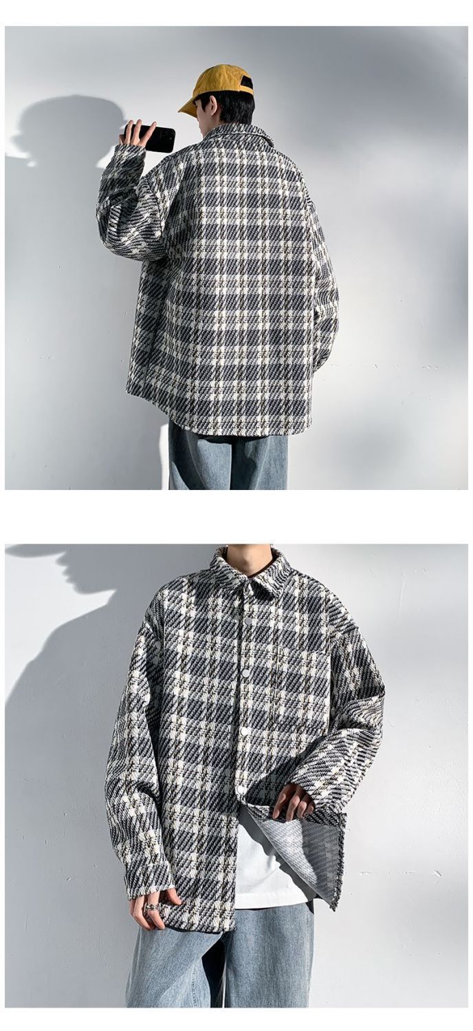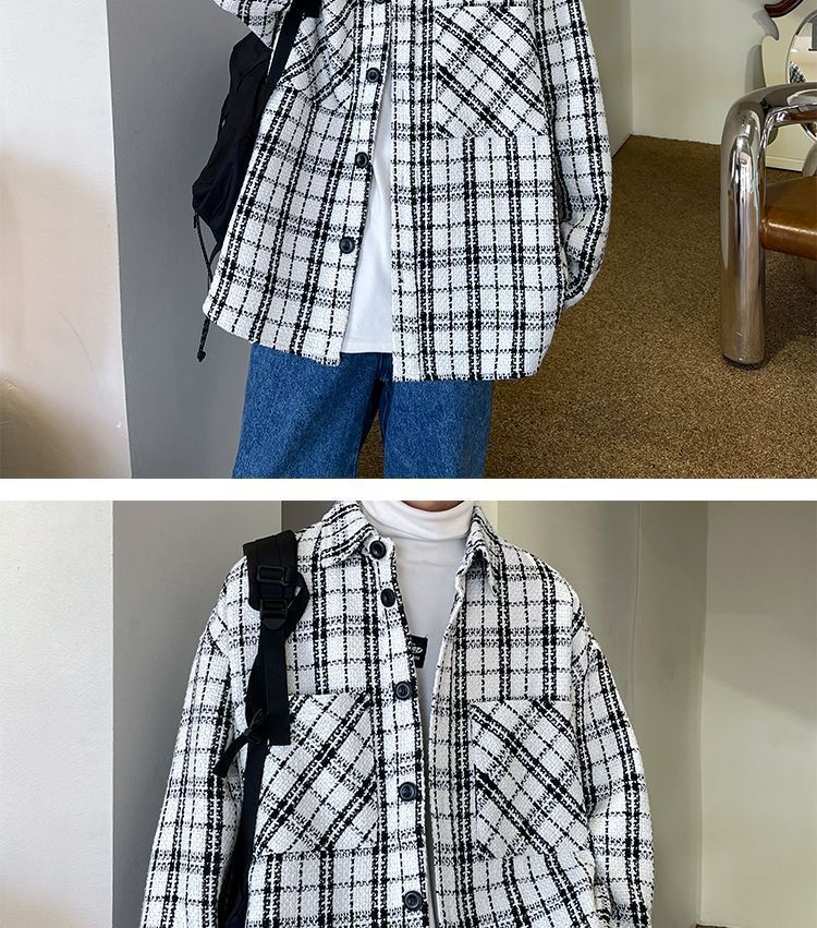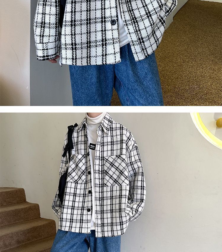 남성용 샤넬 스타일 울 재킷 가을과 겨울 감각 격자 무늬 트렌디 한 브랜드 셔츠 옷깃 트렌디 한 루즈 재킷