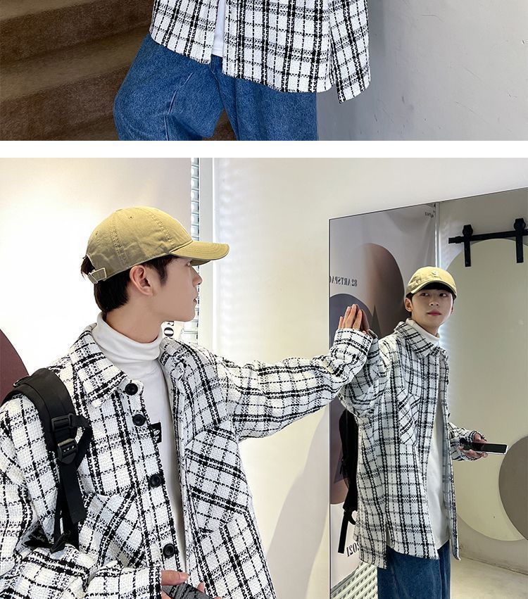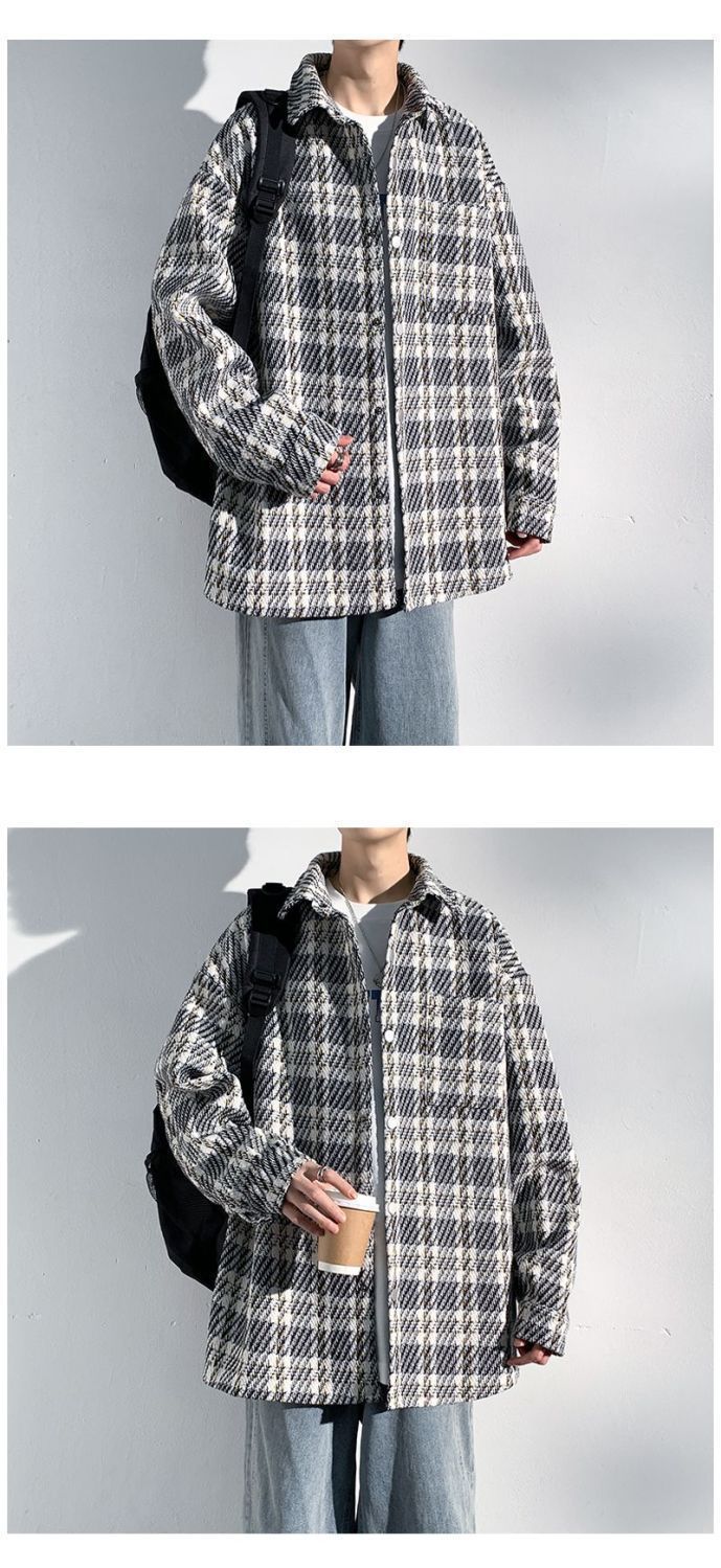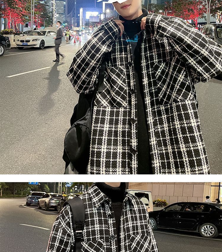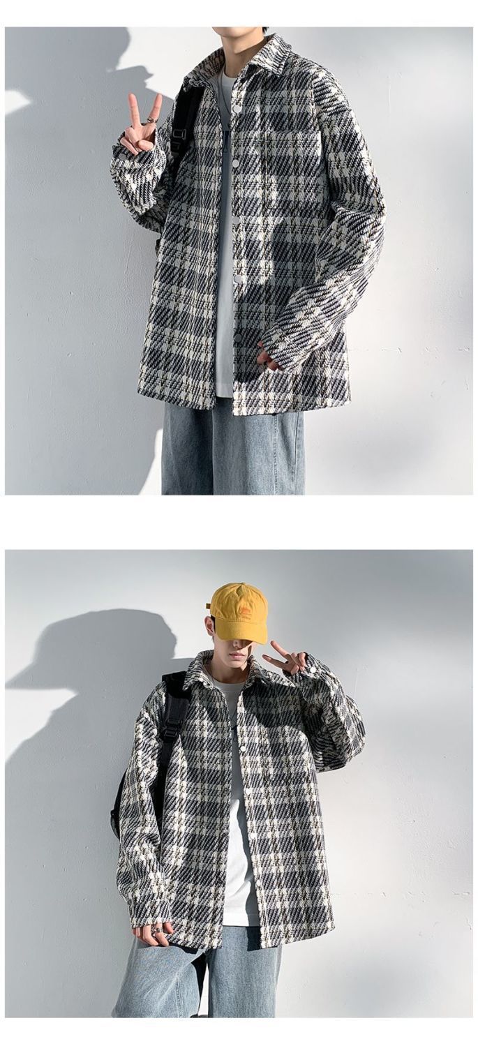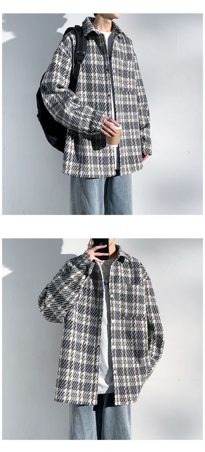 남성용 샤넬 스타일 울 재킷 가을과 겨울 감각 격자 무늬 트렌디 한 브랜드 셔츠 옷깃 트렌디 한 루즈 재킷