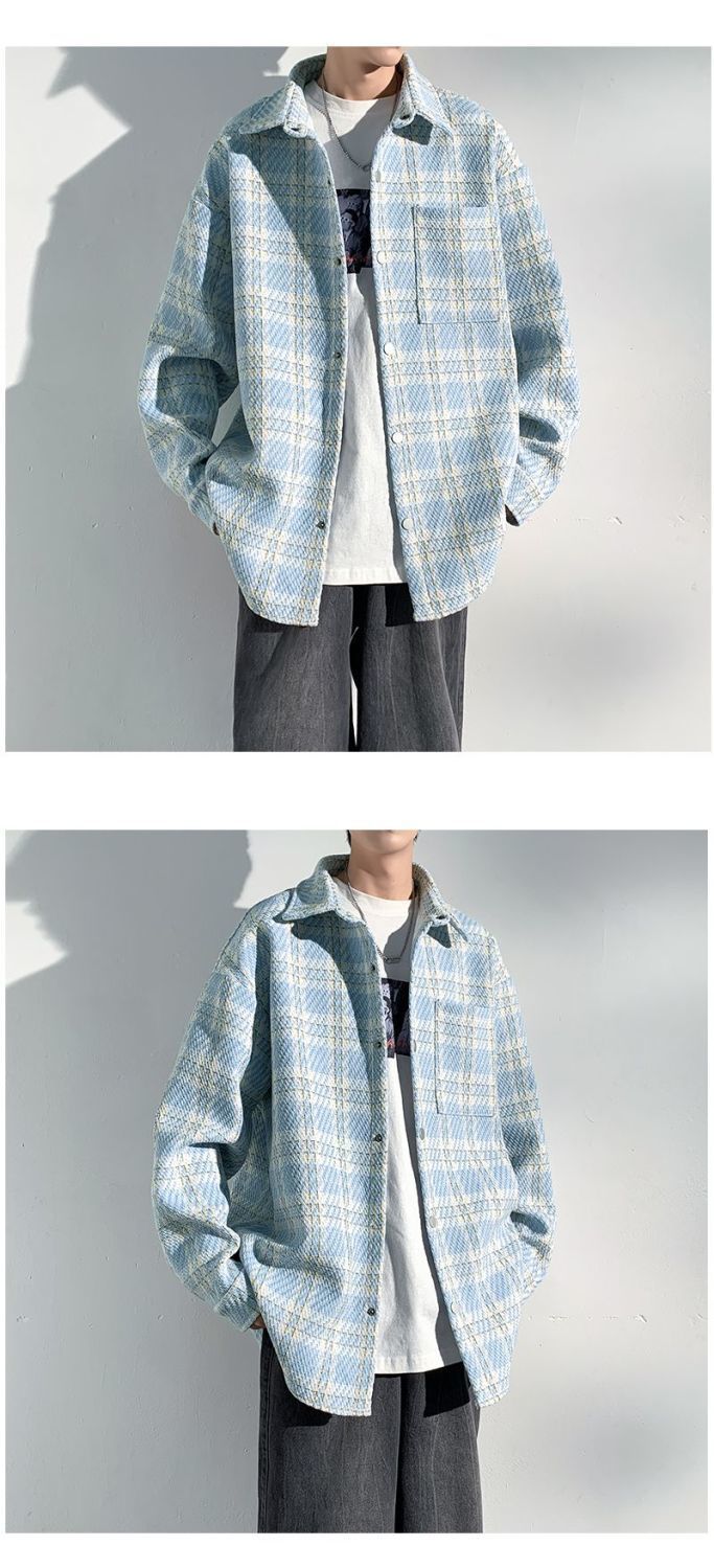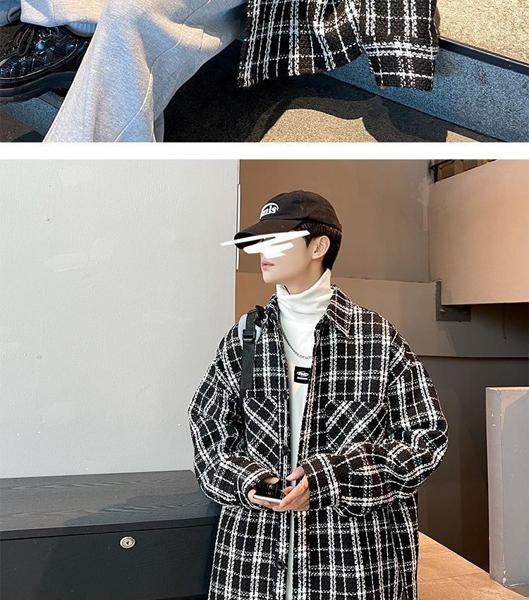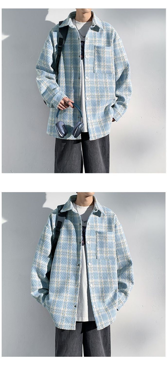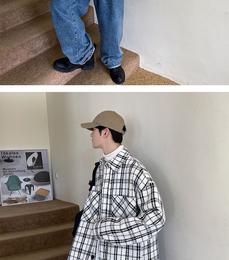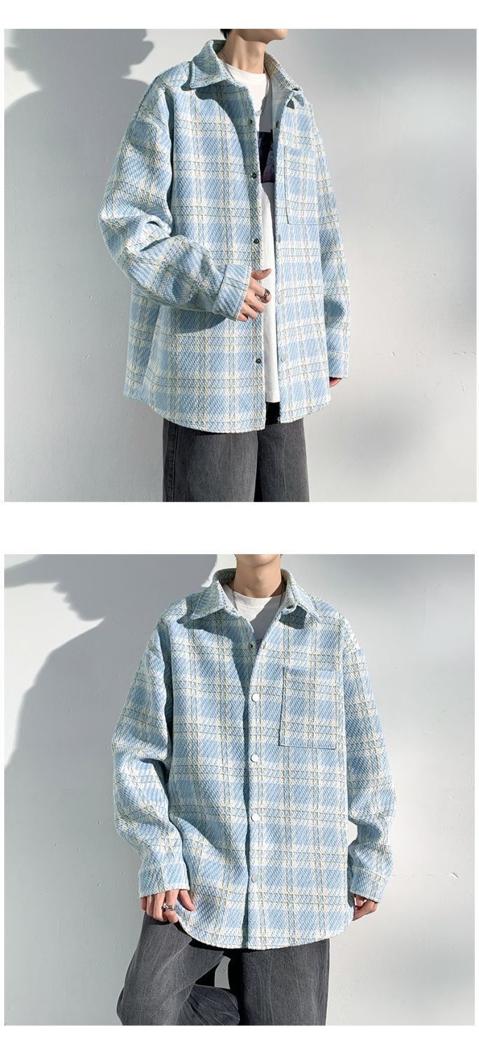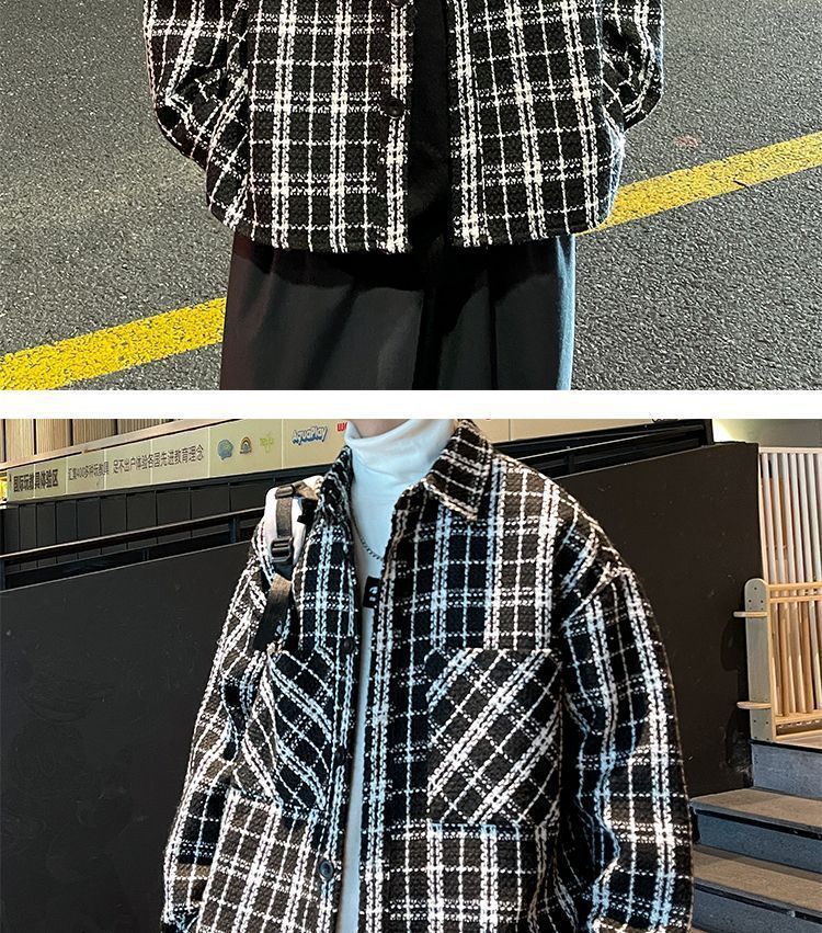 남성용 샤넬 스타일 울 재킷 가을과 겨울 감각 격자 무늬 트렌디 한 브랜드 셔츠 옷깃 트렌디 한 루즈 재킷
