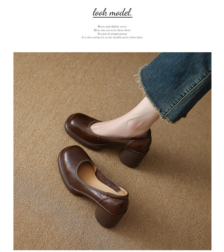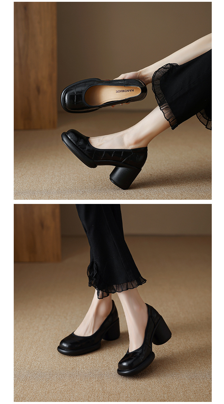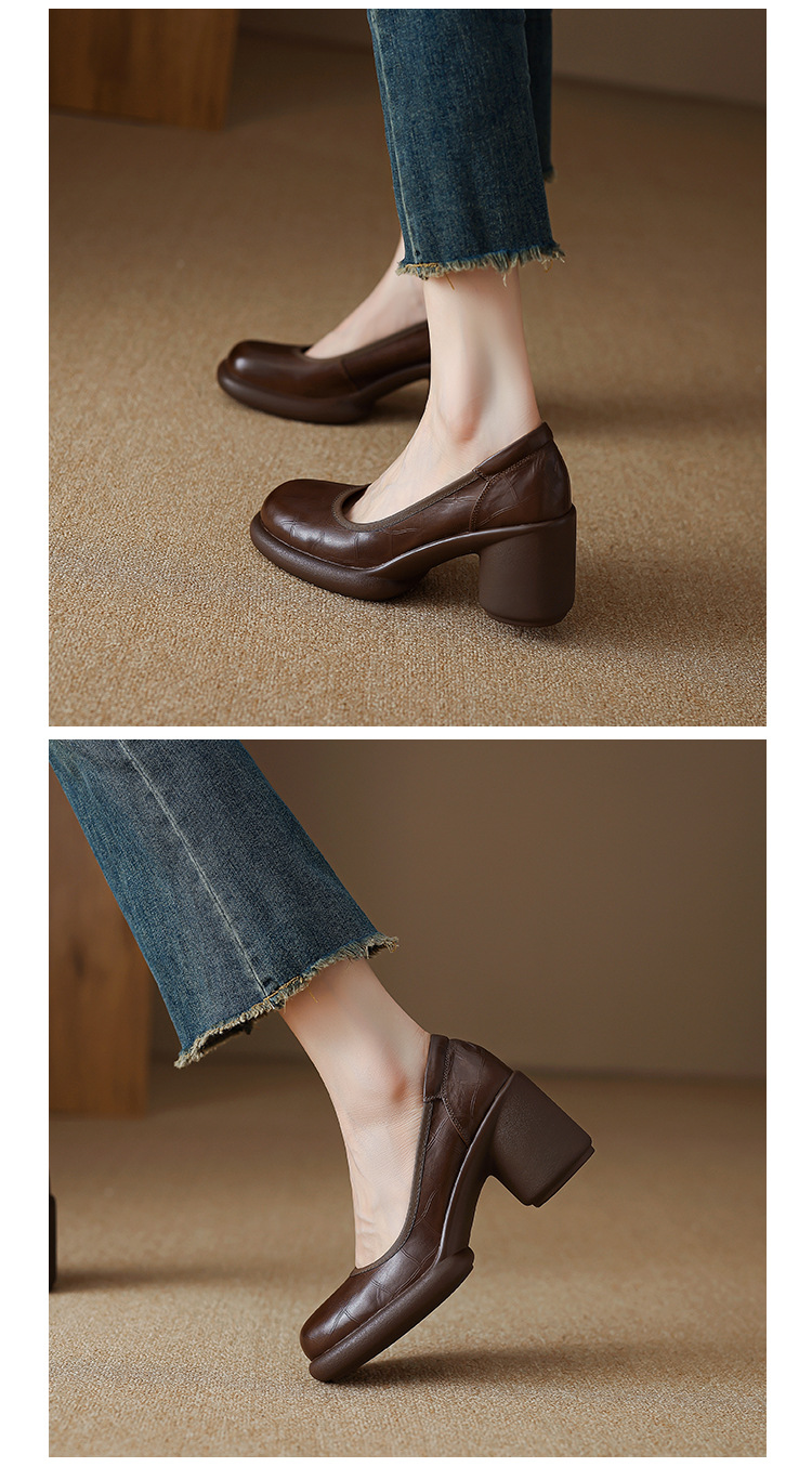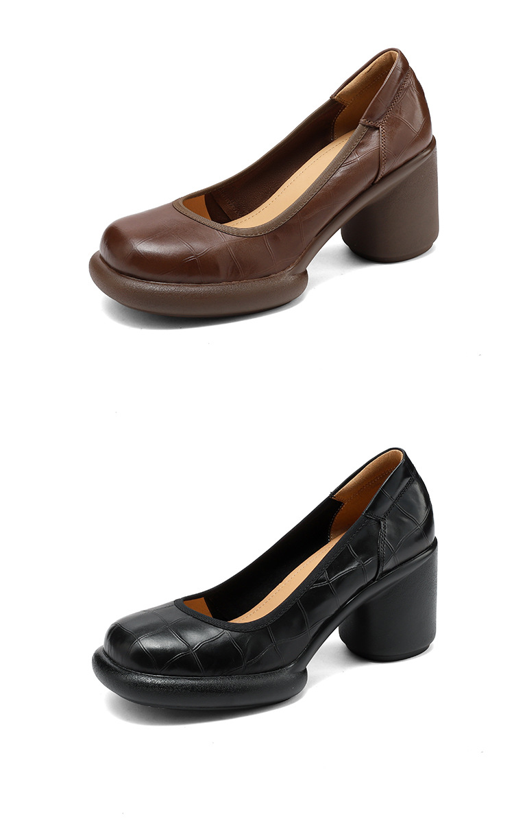 2024 새로운 빈티지 두꺼운 뒤꿈치 신발 여성 돌 패턴 Cowhide 라운드 발가락 얕은 프랑스 통근 빈티지 하이힐 신발