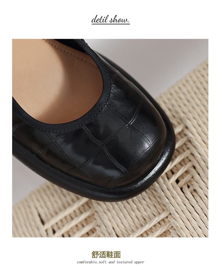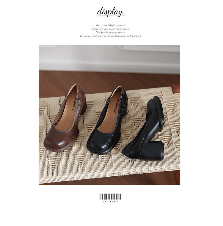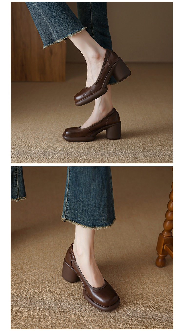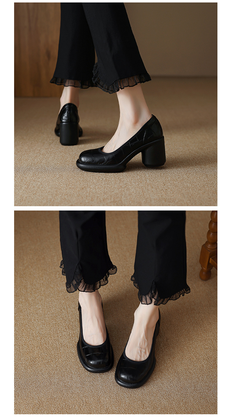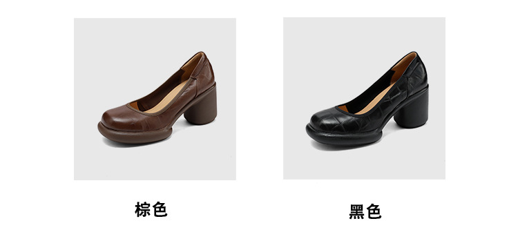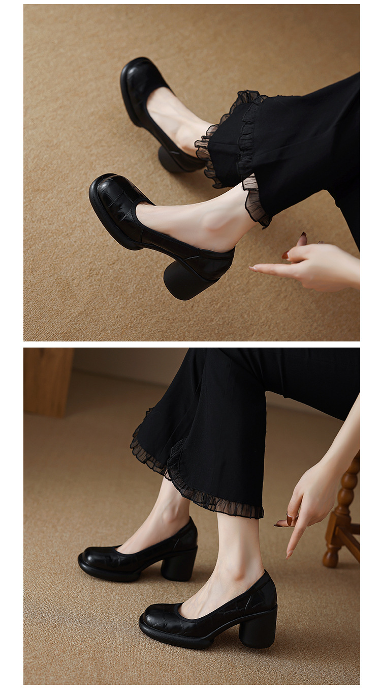 2024 새로운 빈티지 두꺼운 뒤꿈치 신발 여성 돌 패턴 Cowhide 라운드 발가락 얕은 프랑스 통근 빈티지 하이힐 신발