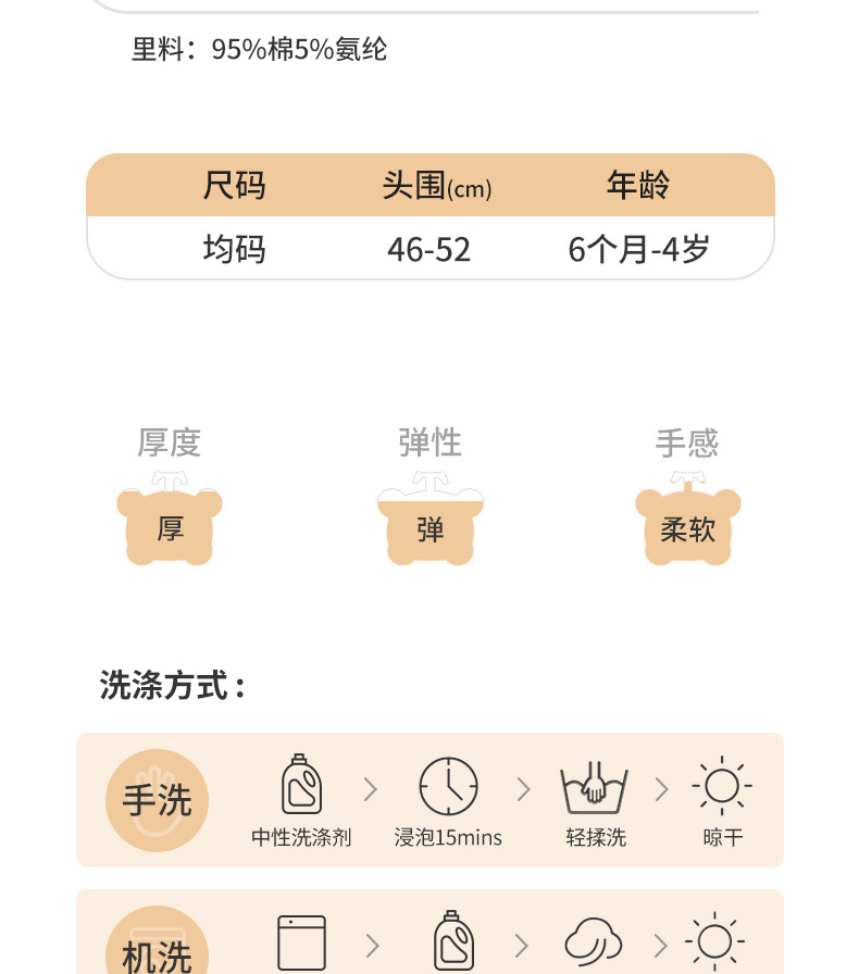 • 프리 사이즈: 신축성 있는 모자 둘레(46-54cm) 6개월~4세에게 권장
