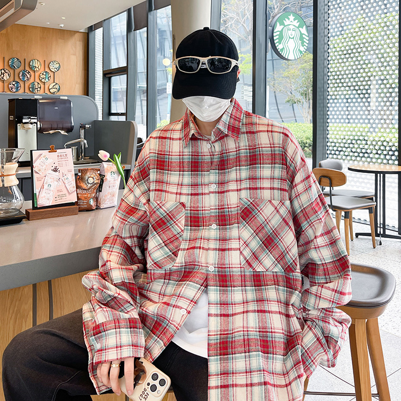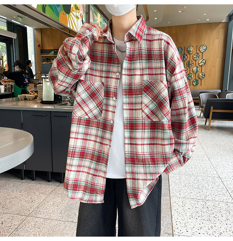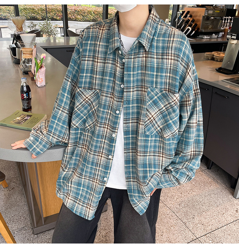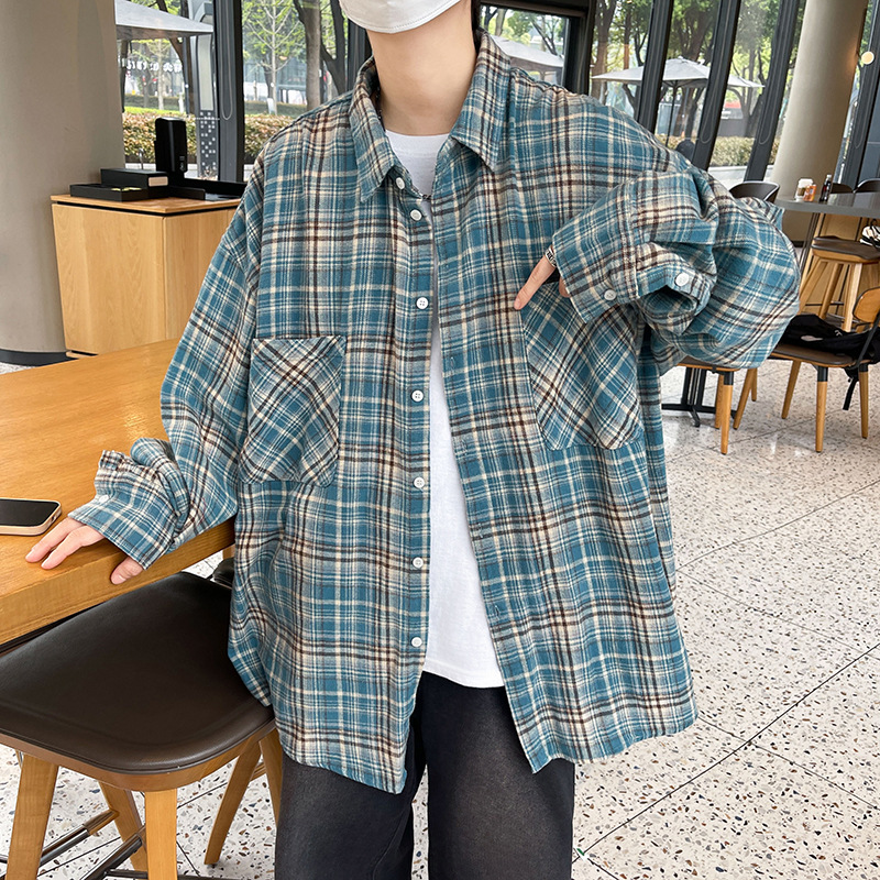 가을 새로운 도착 남성 일본 스타일 빈티지 격자 무늬 POLO 칼라 긴 소매 재킷 게으른 스타일 연인을위한 얇은 재킷스토어 가기