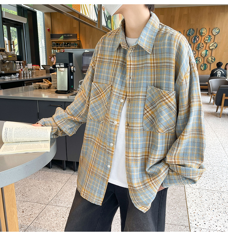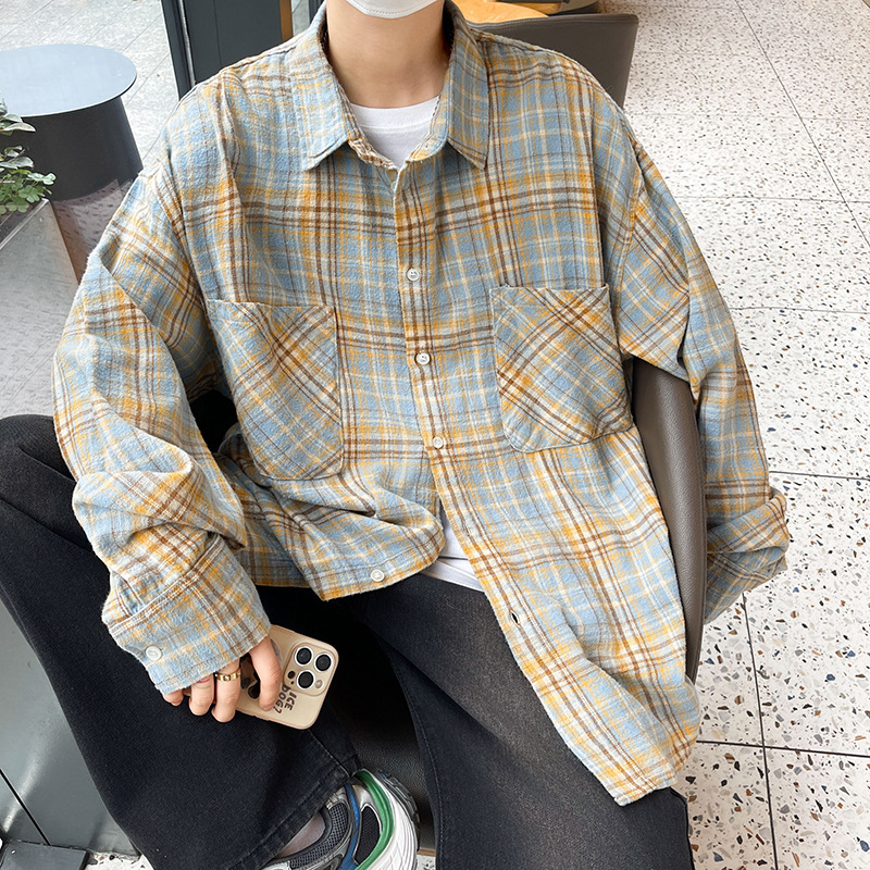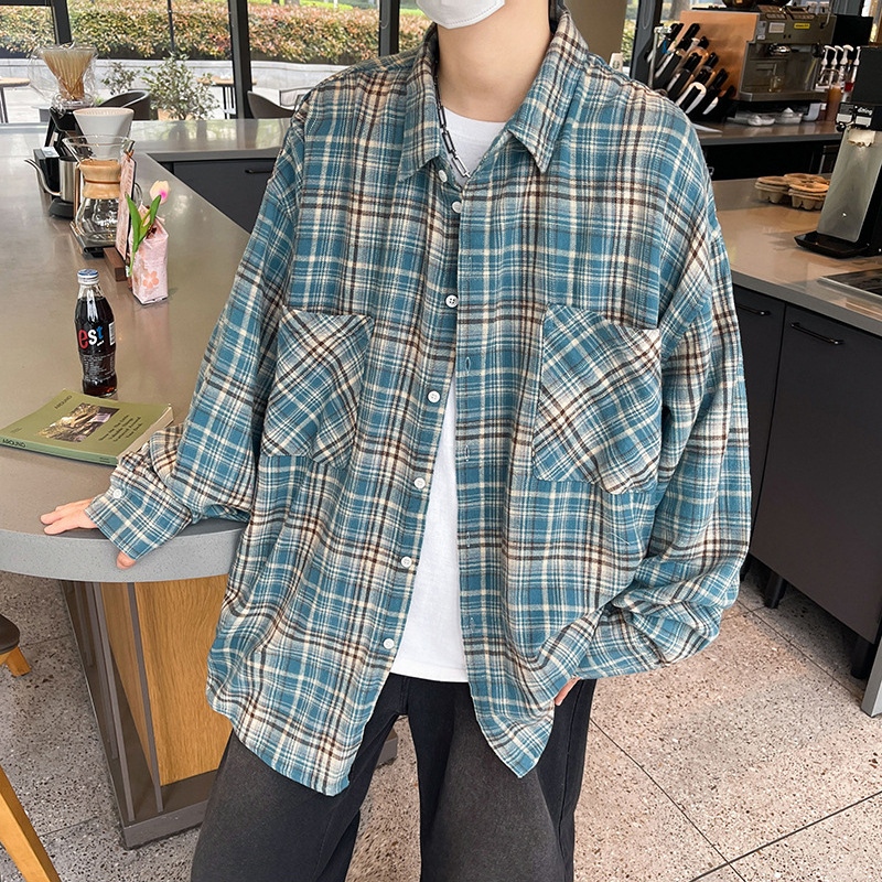 가을 새로운 도착 남성 일본 스타일 빈티지 격자 무늬 POLO 칼라 긴 소매 재킷 게으른 스타일 연인을위한 얇은 재킷