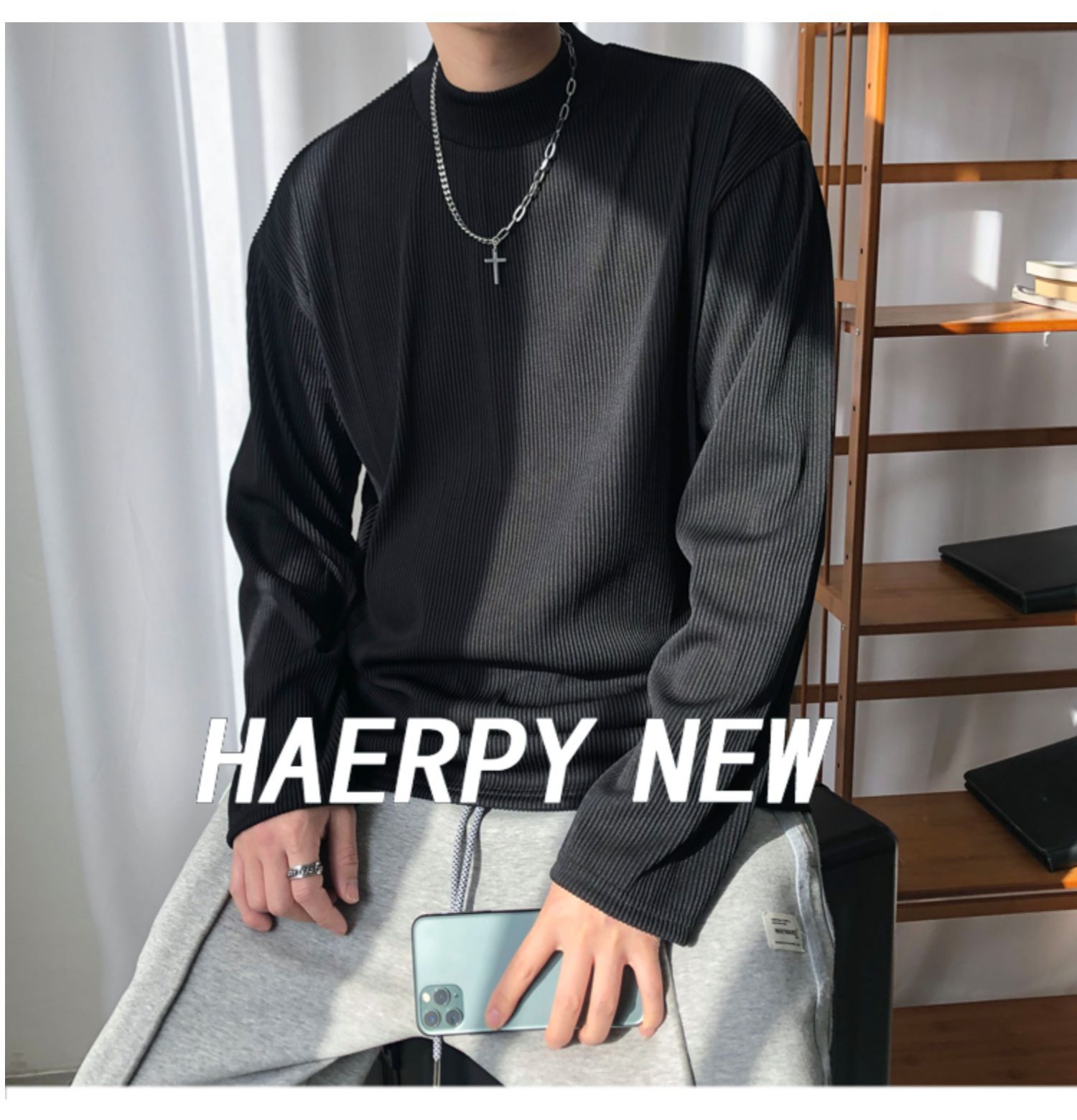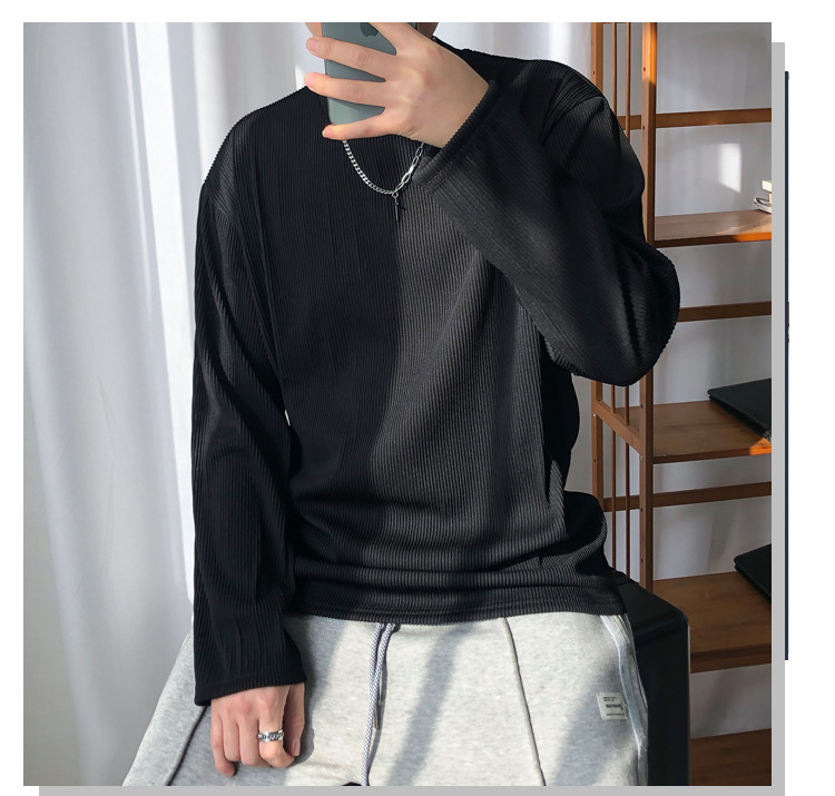 아메리칸 스타일 세미 하이 칼라 주름 티셔츠 남성용 아이스 실크 주름 질감 감각 느슨한 긴 소매 작은 목 내베이스 셔츠 트렌디스토어 가기