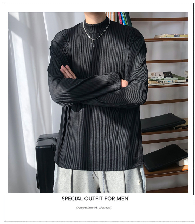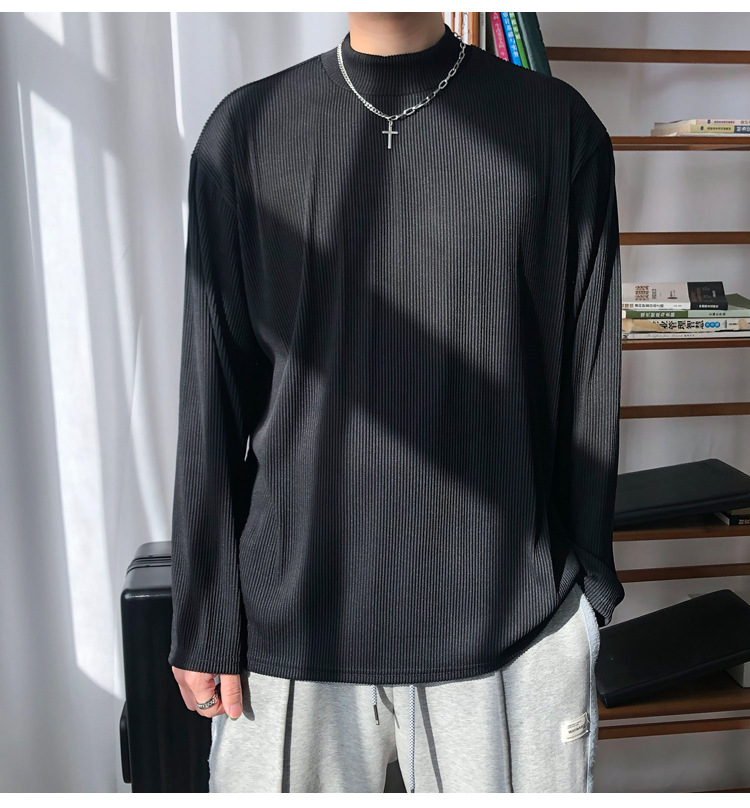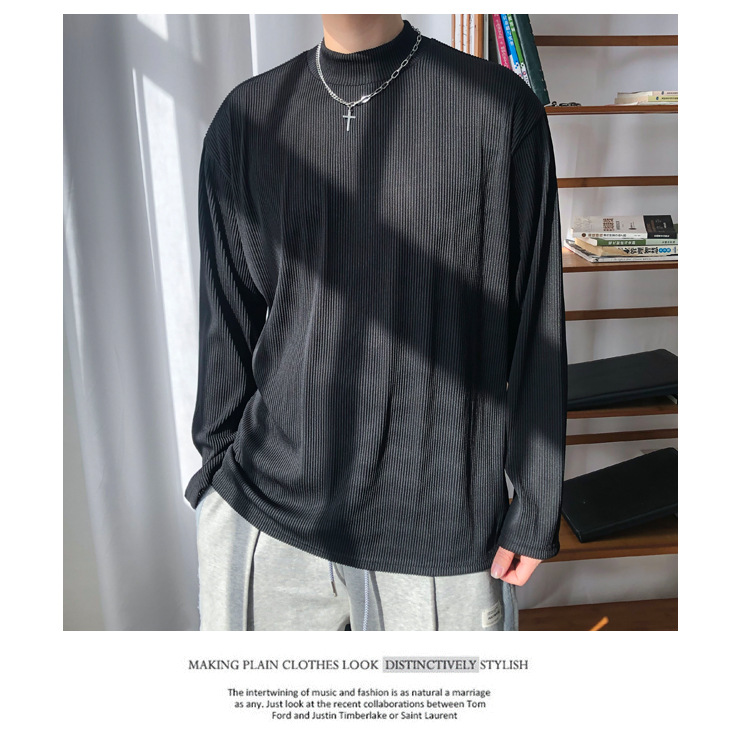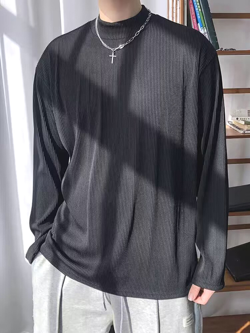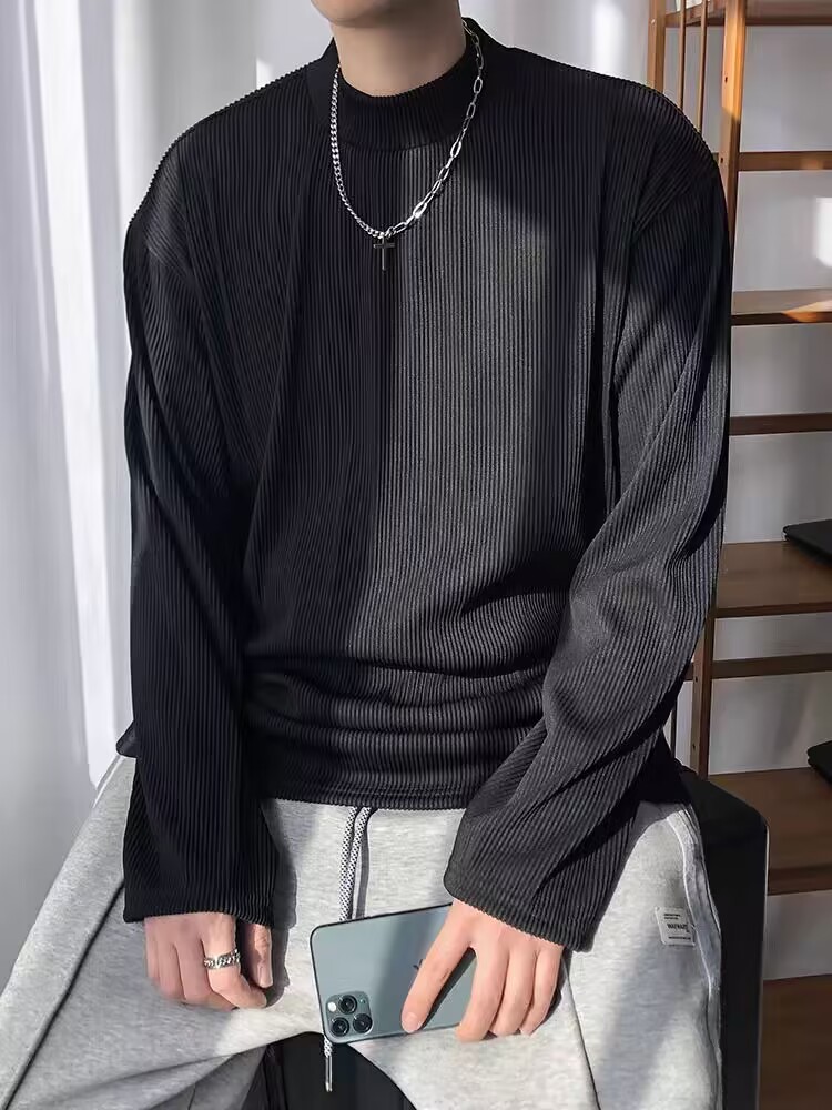 아메리칸 스타일 세미 하이 칼라 주름 티셔츠 남성용 아이스 실크 주름 질감 감각 느슨한 긴 소매 작은 목 내베이스 셔츠 트렌디
