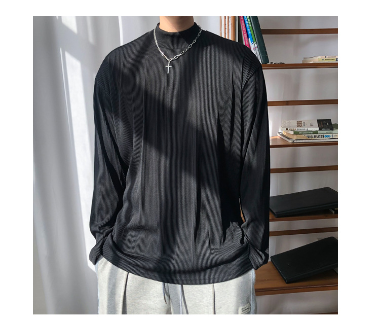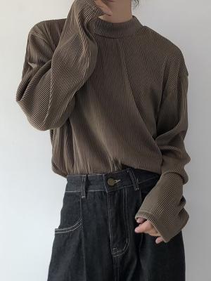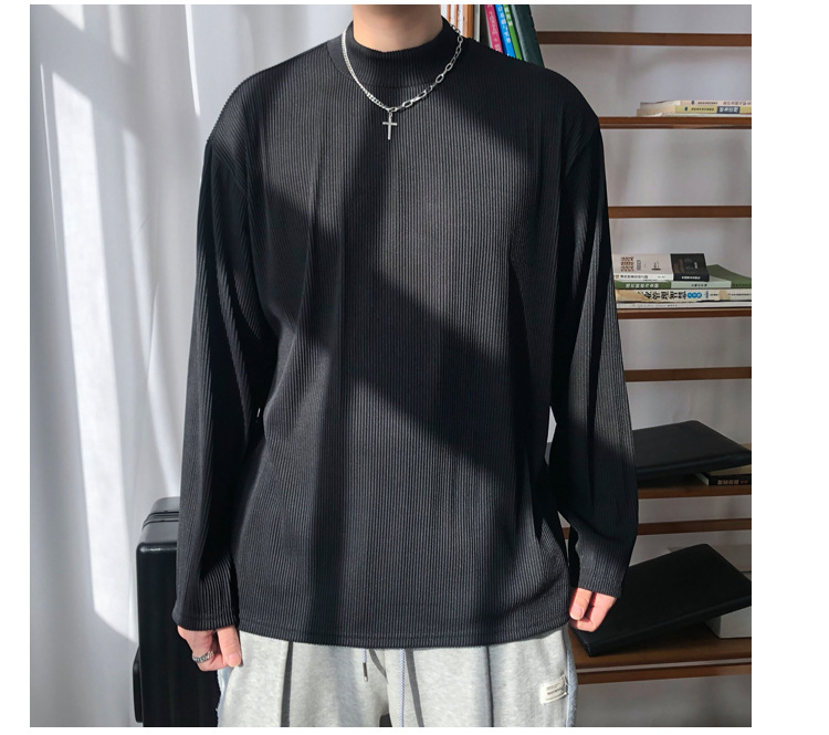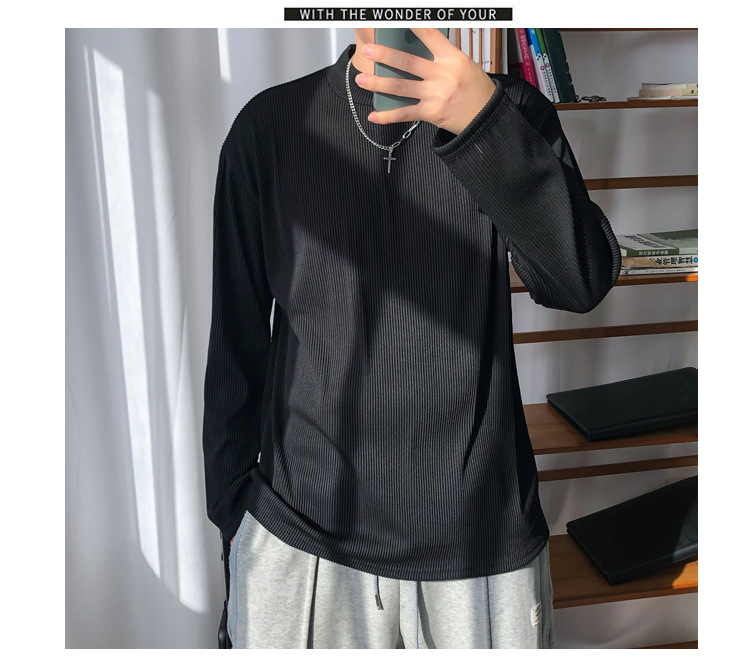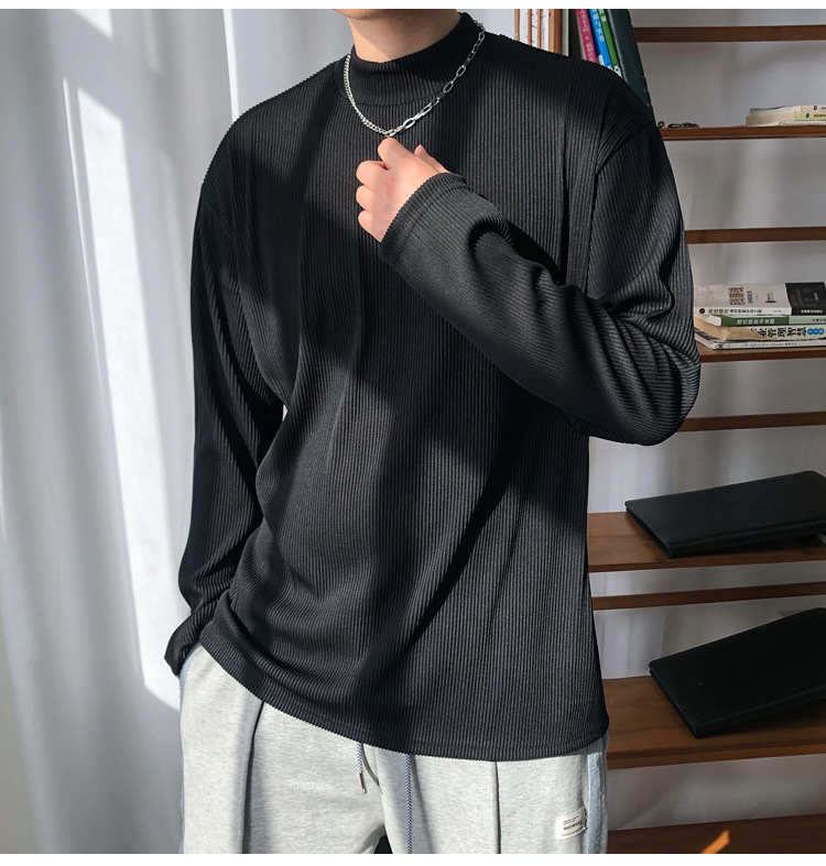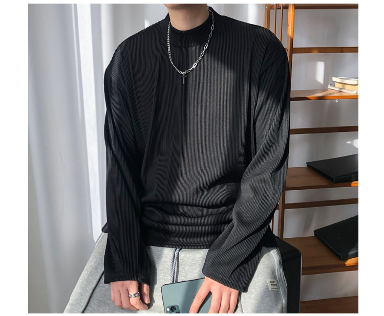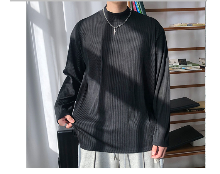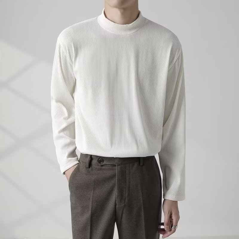 아메리칸 스타일 세미 하이 칼라 주름 티셔츠 남성용 아이스 실크 주름 질감 감각 느슨한 긴 소매 작은 목 내베이스 셔츠 트렌디