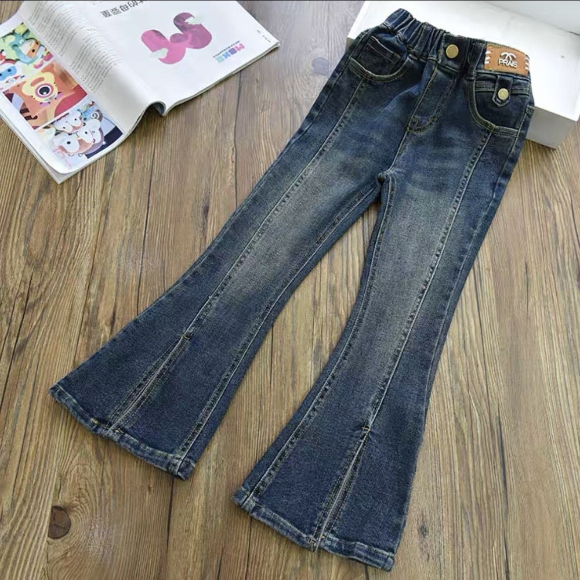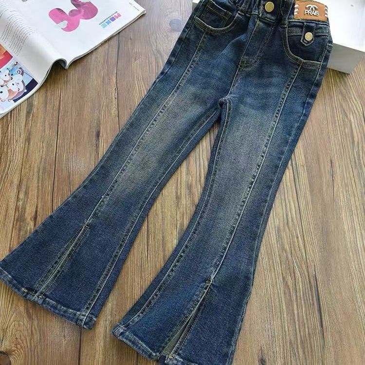 [신간] 여자 스타일리시한 세련된 슬림핏 라벨 스플릿 데님 플레어 바지 대형 어린이 패션 바지 가을