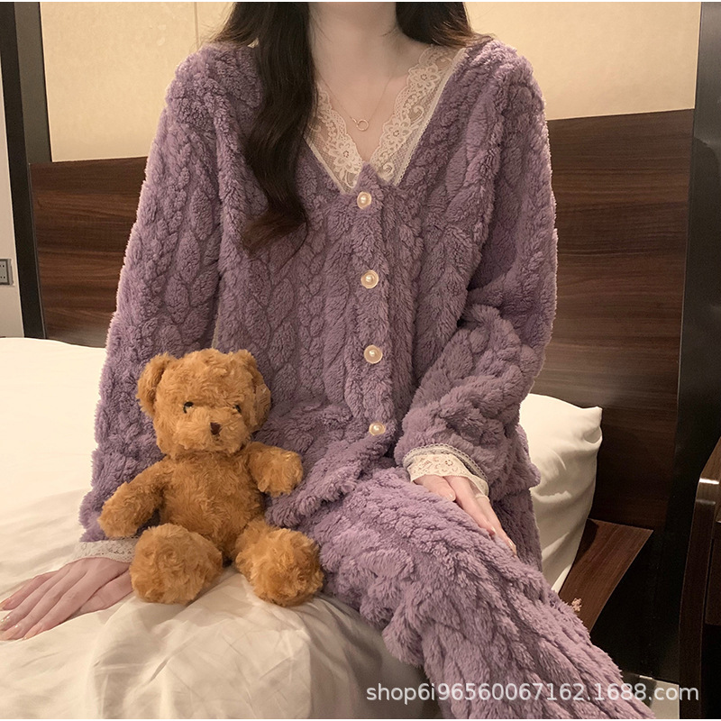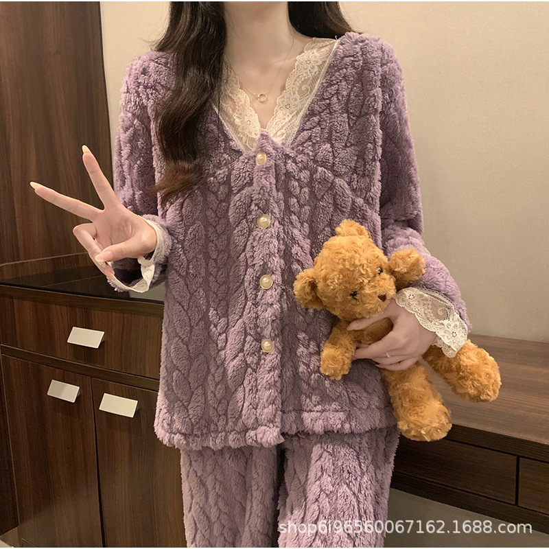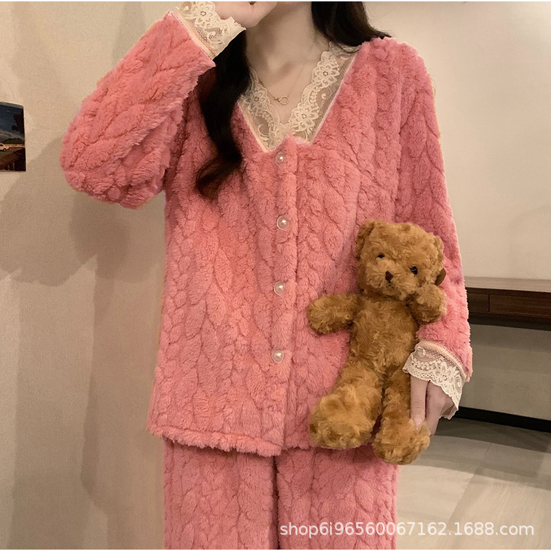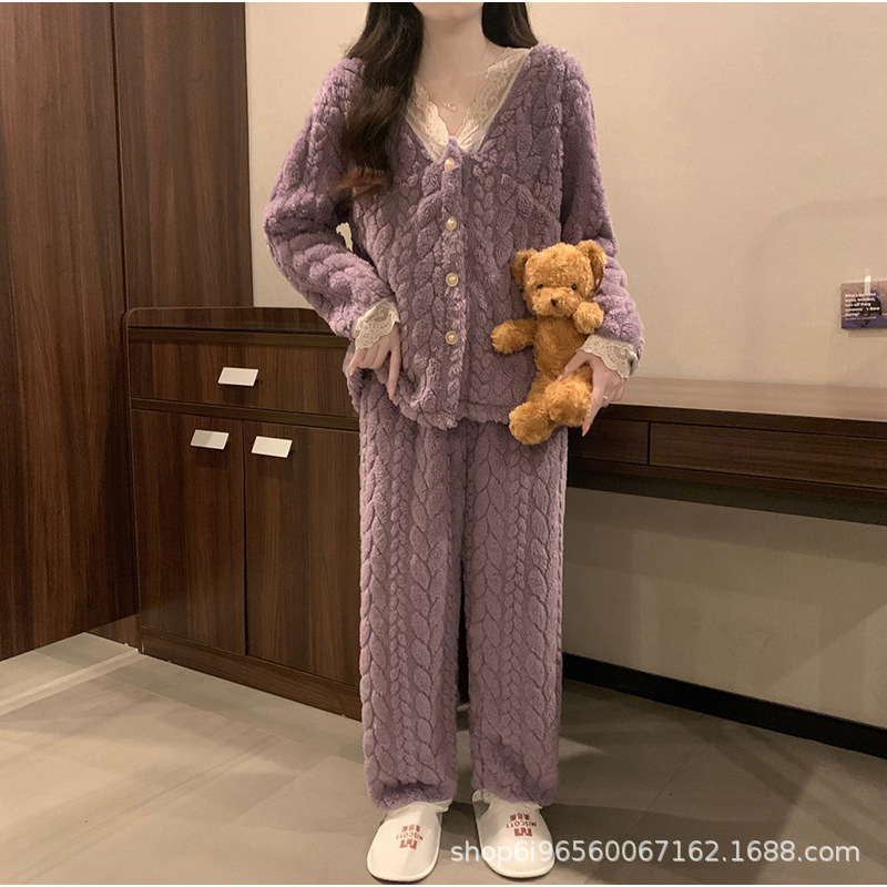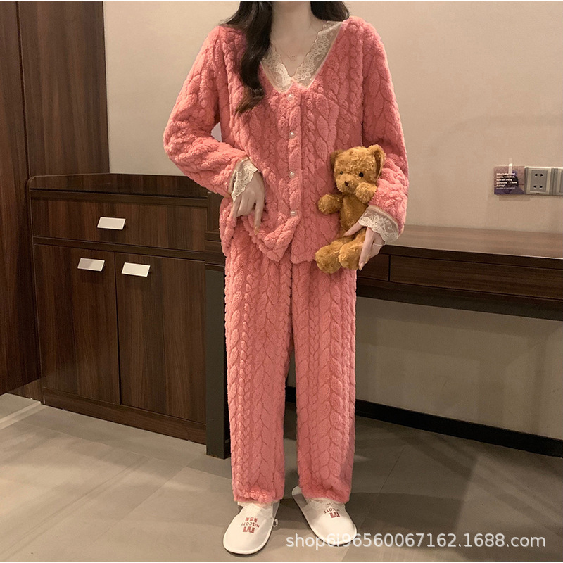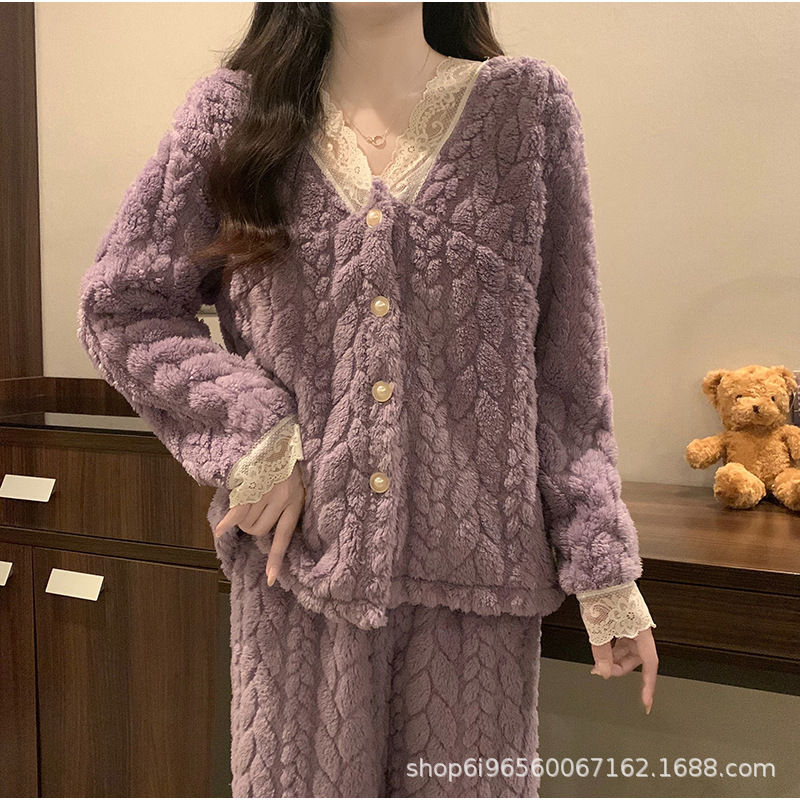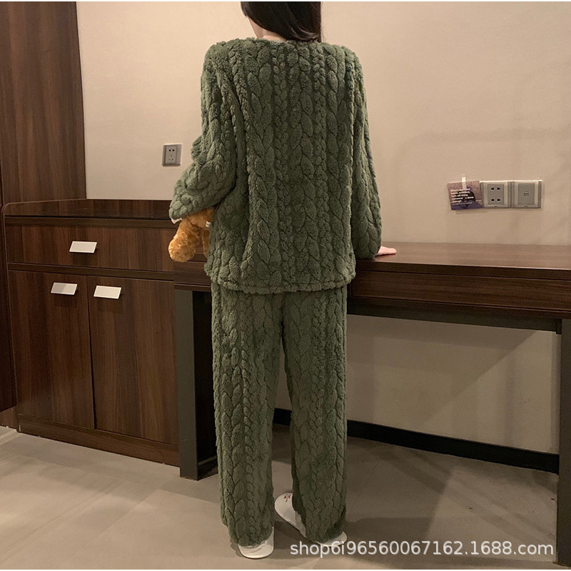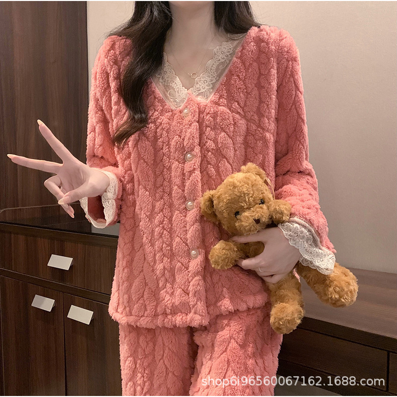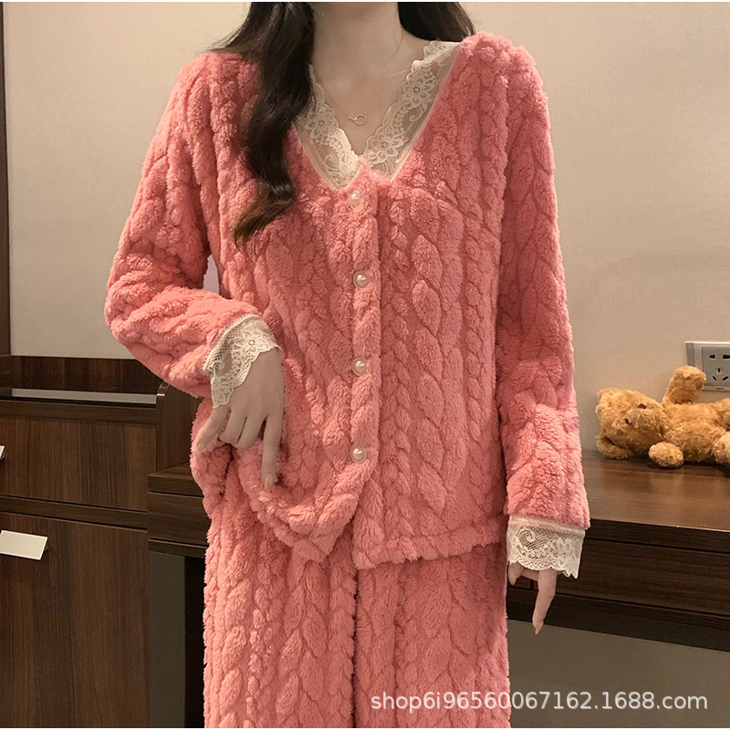 가을과 겨울 잠옷 여성의 2024 산호 양털 기모 두꺼운 따뜻한 테두리 세트 플란넬 홈 의류를 입을 수 있습니다.스토어 가기