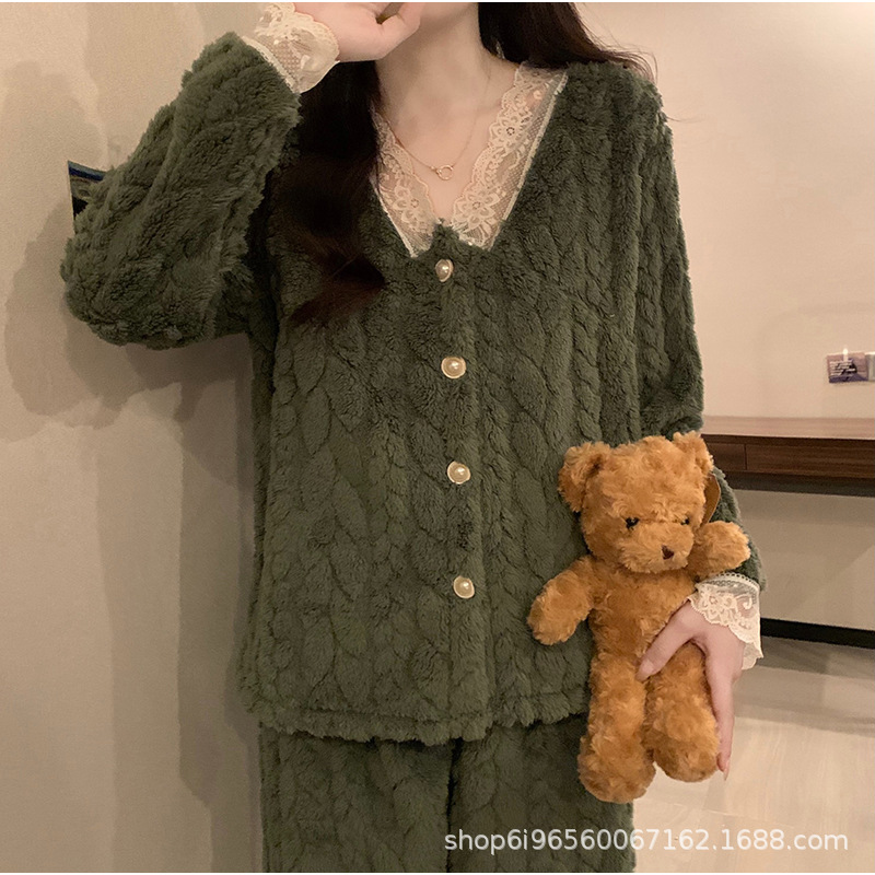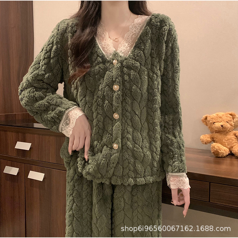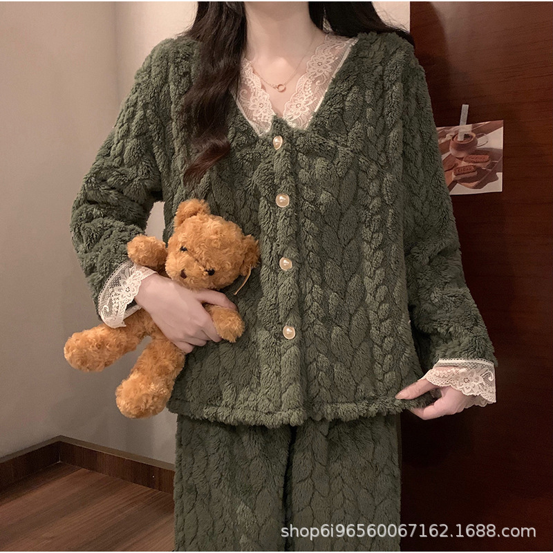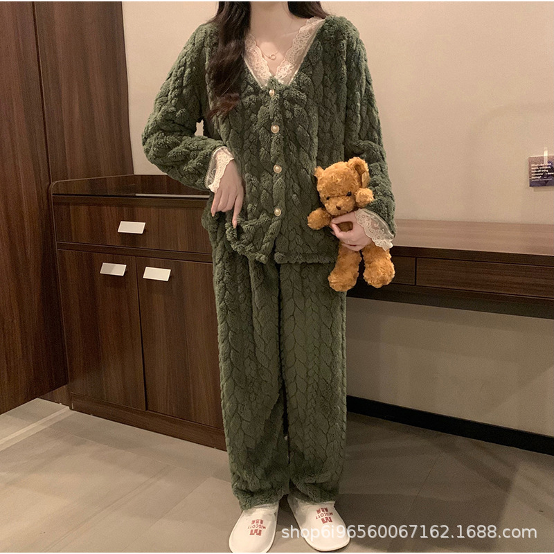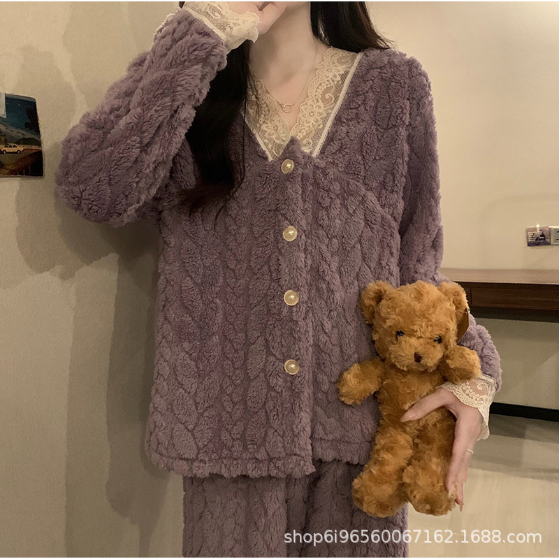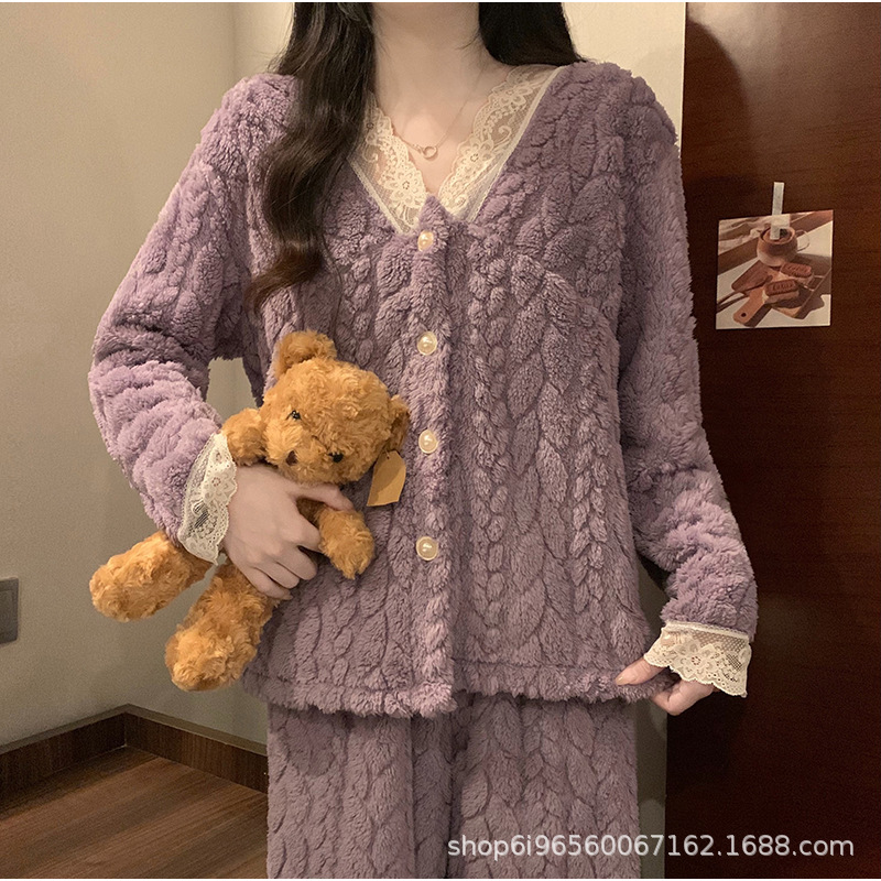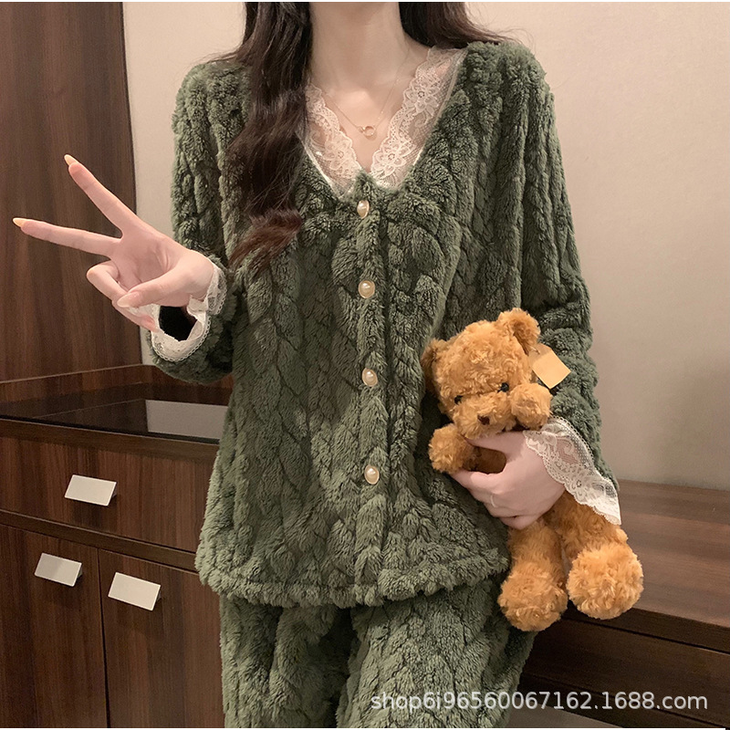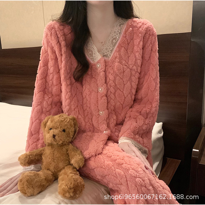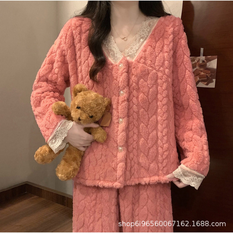 가을과 겨울 잠옷 여성의 2024 산호 양털 기모 두꺼운 따뜻한 테두리 세트 플란넬 홈 의류를 입을 수 있습니다.스토어 가기