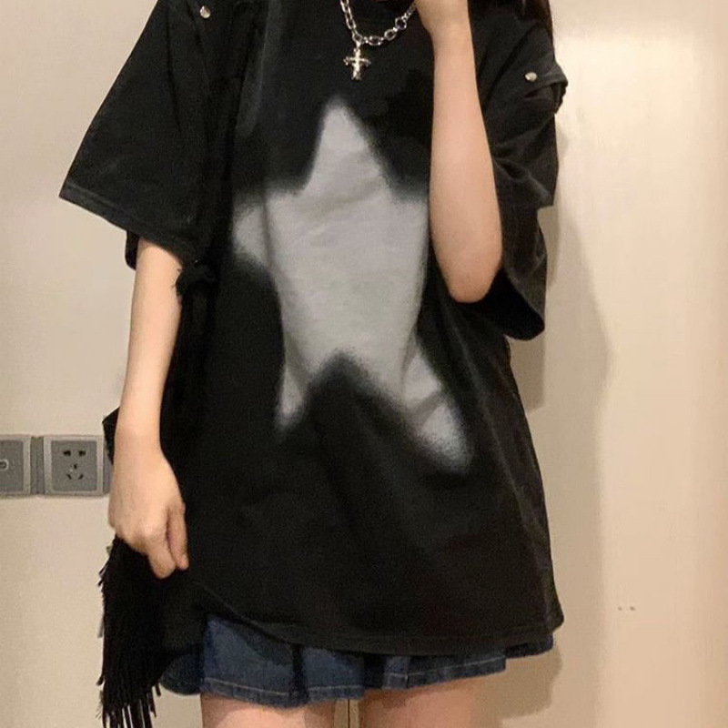 무거운 미국 스타일 국가 패션 라운드 넥 어깨 코튼 셔츠 여성의 여름 폭발 디자인 센스 슬리밍 커플의 탑스토어 가기