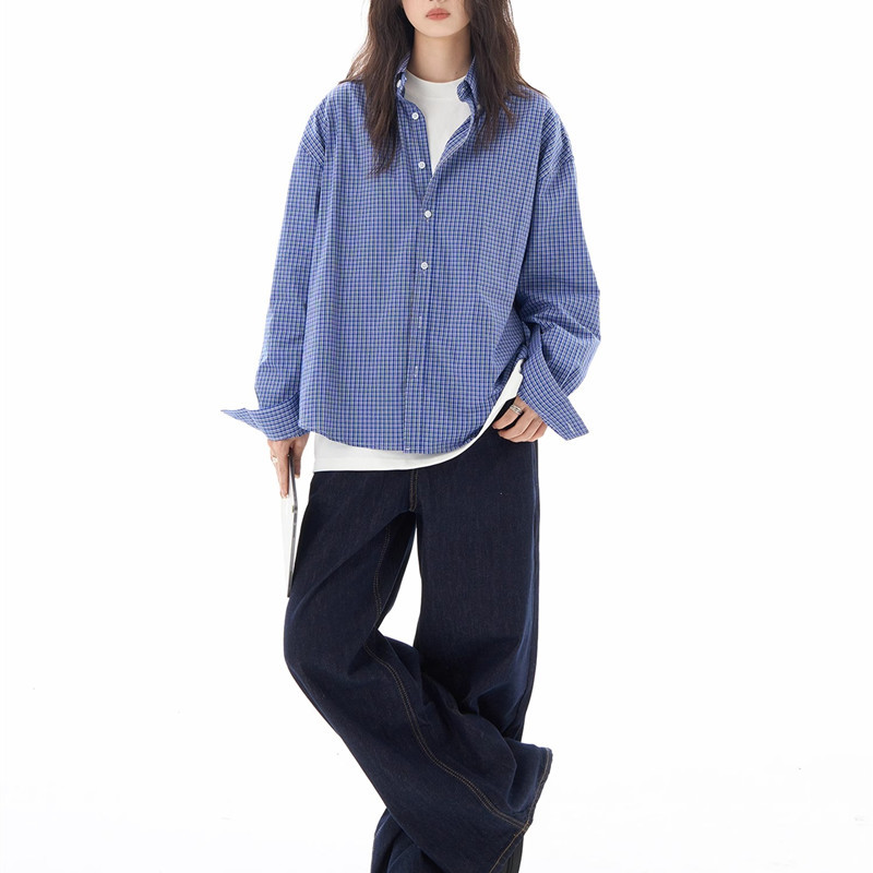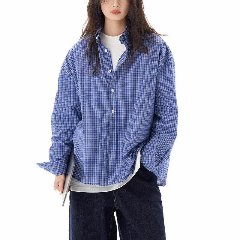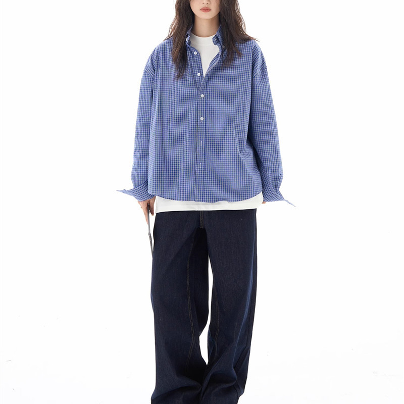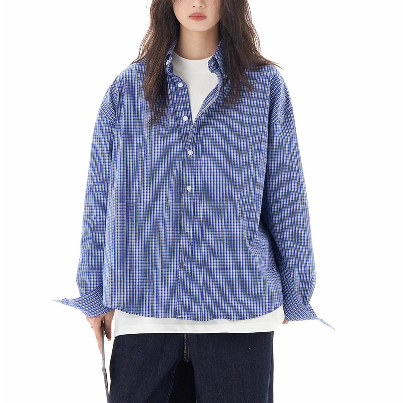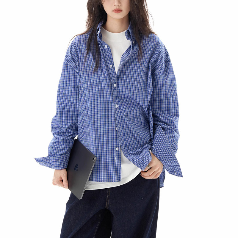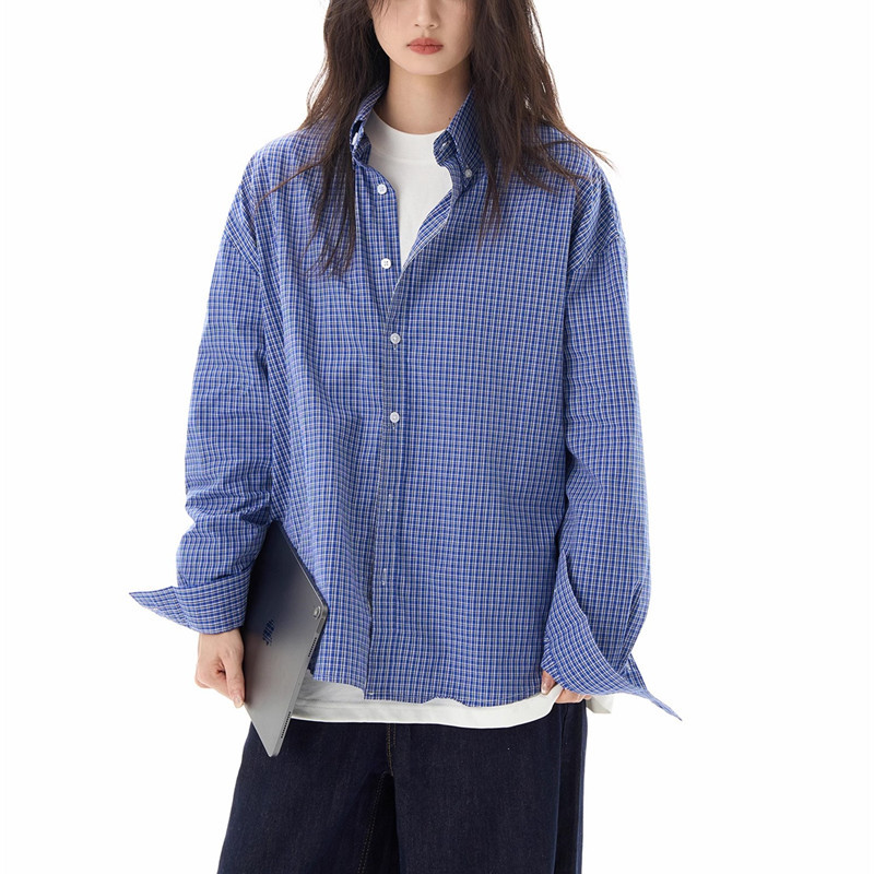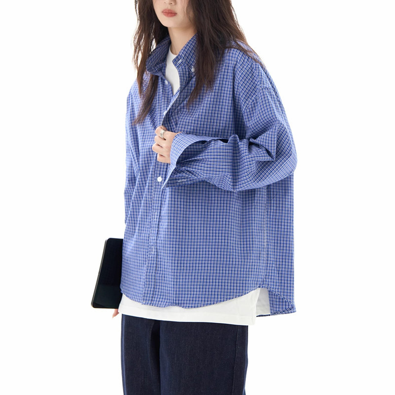 미국 레트로 블루 체크 셔츠 긴팔 남성 및 여성 하이 엔드 센스 캐주얼 루즈 올 매치 커플의 셔츠 재킷 트렌디스토어 가기