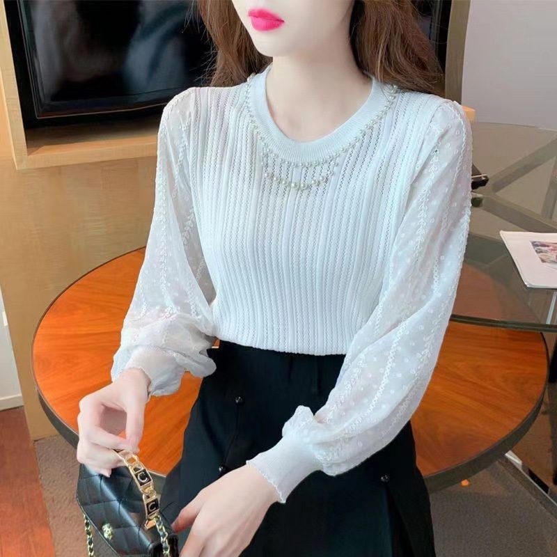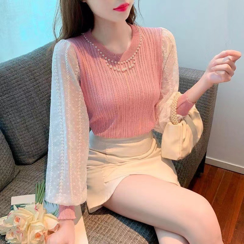 달콤하고 부드러운 크루 넥 비즈 탑 여성용 스프링웨어 슬림 핏 슬리밍 웨스턴 스타일 쉬폰 슬리브 바느질 긴팔 스웨터스토어 가기