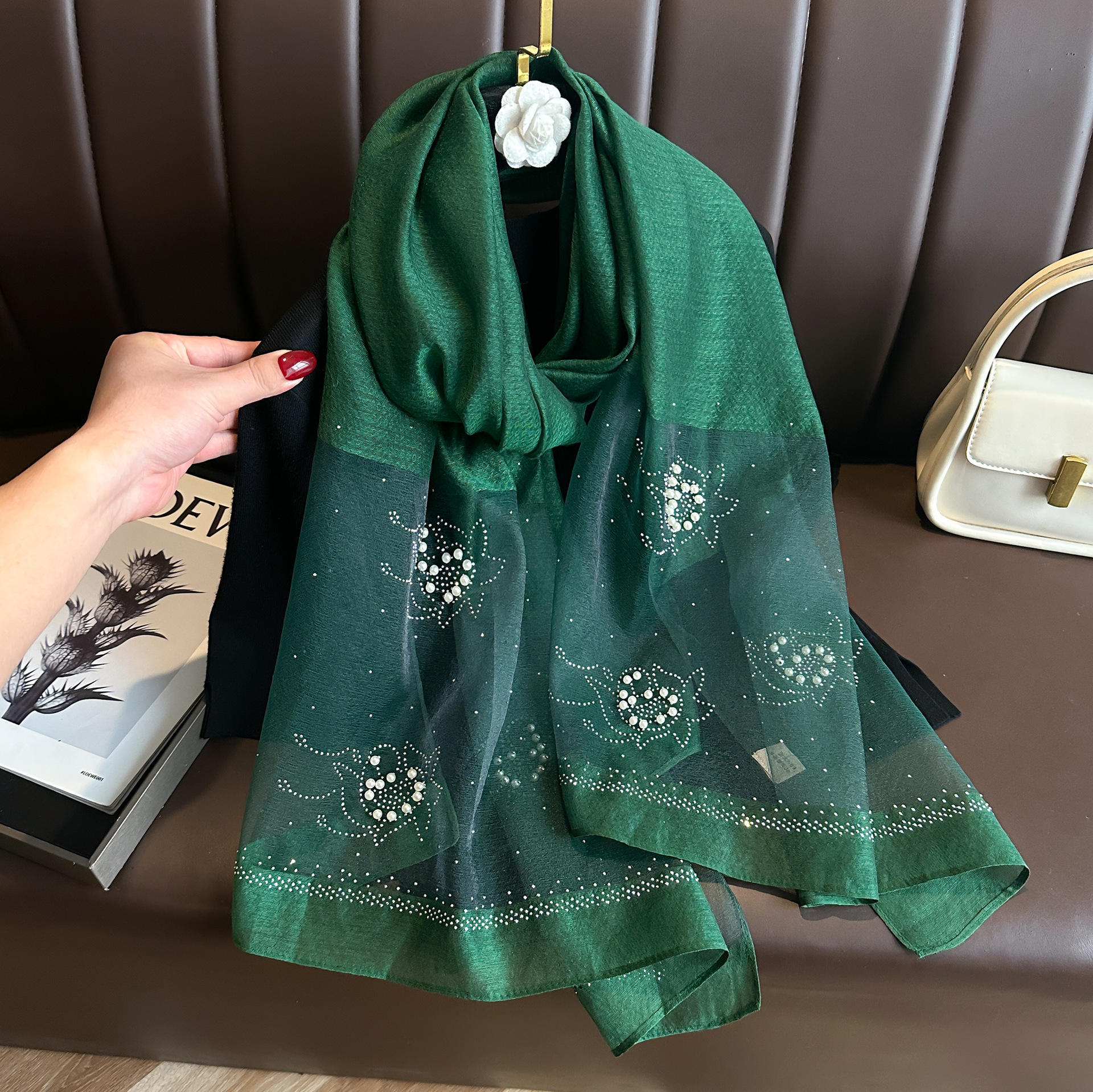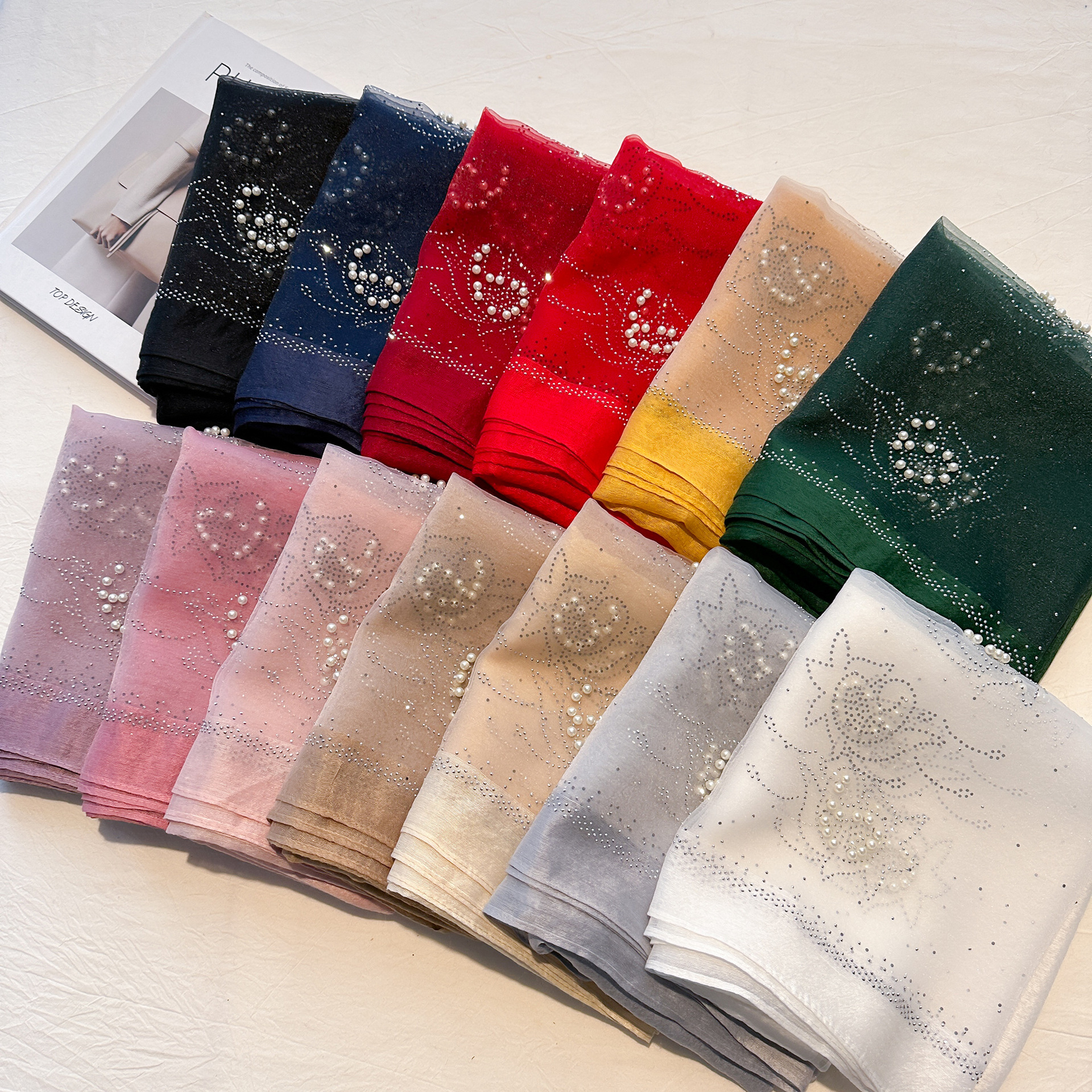 재고 새로운 단색 실크 스카프 모조 다이아몬드 큰 꽃 진주 조커 따뜻한 스카프 목도리 스카프 여성 도매