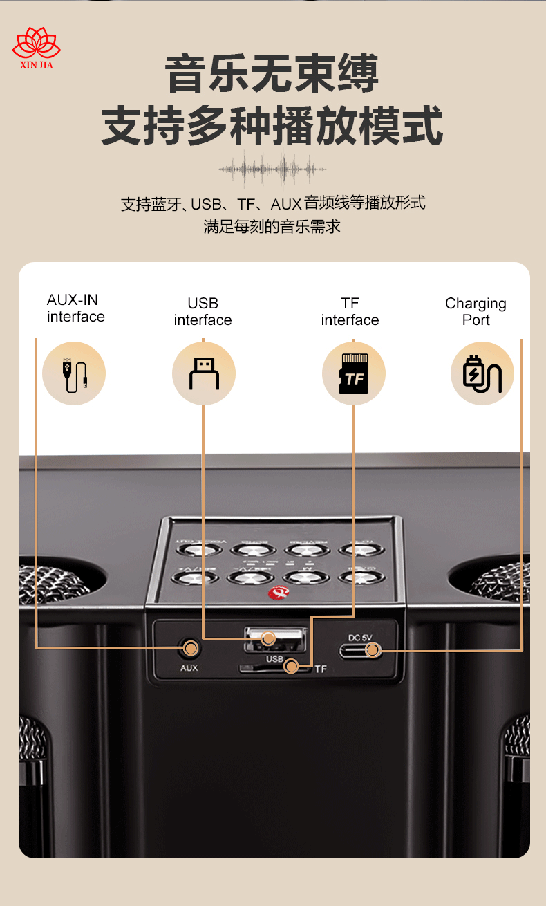 支持通过AUX音频口连接电视,在家就能唱KTV;
