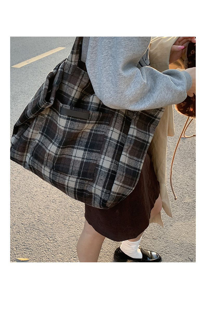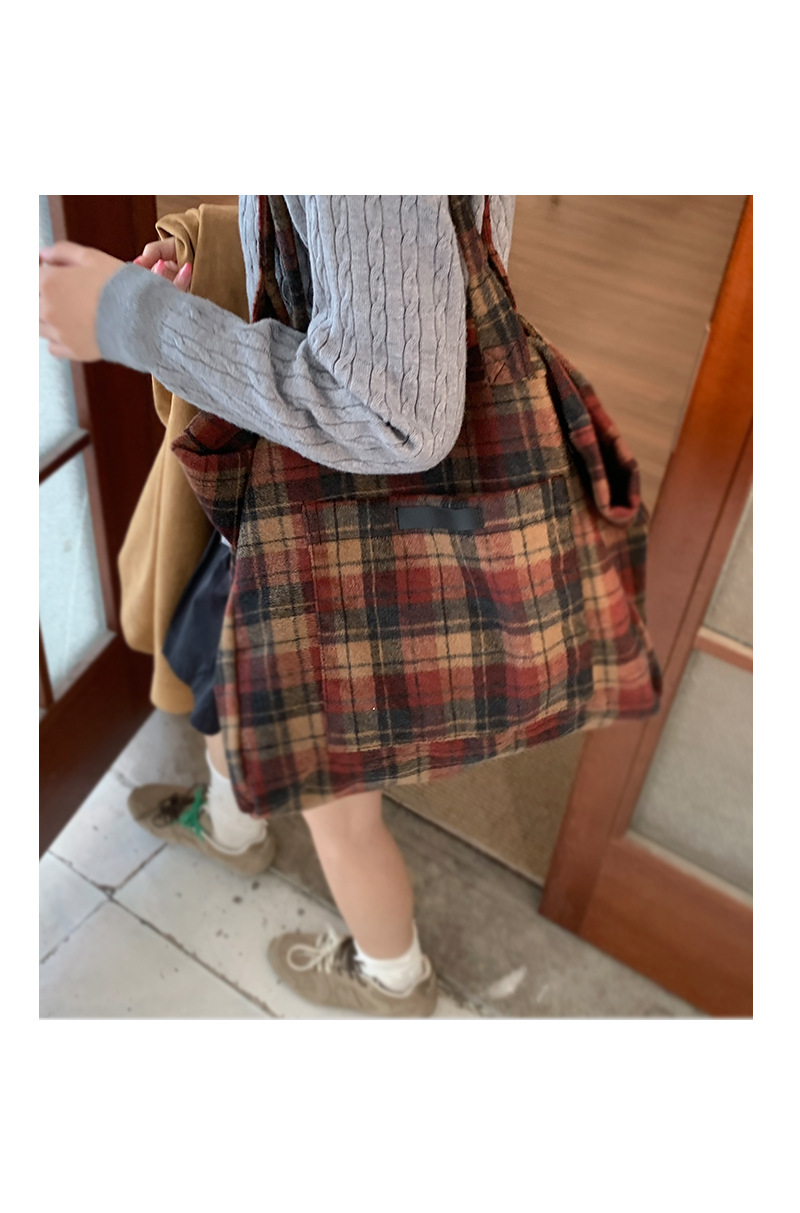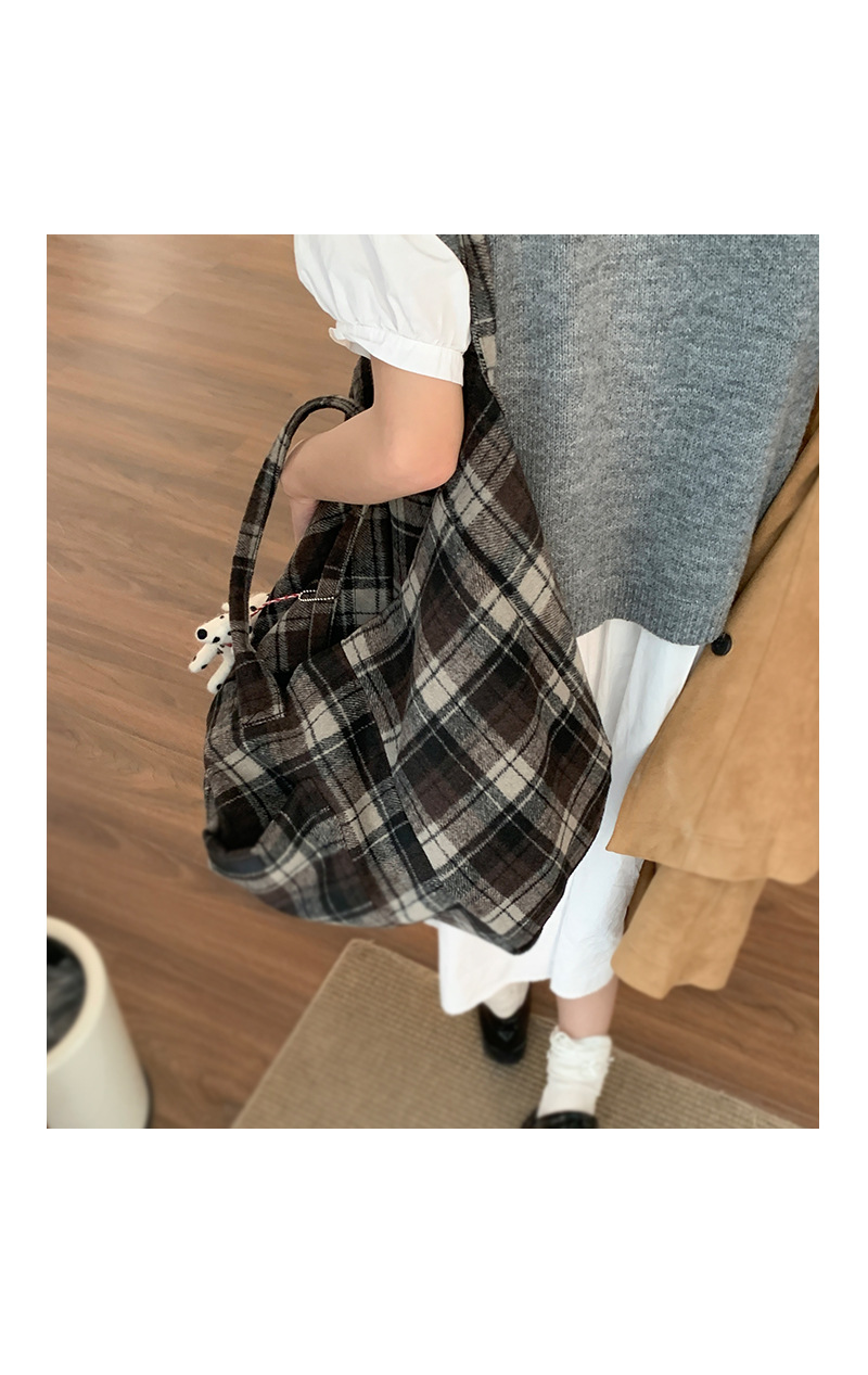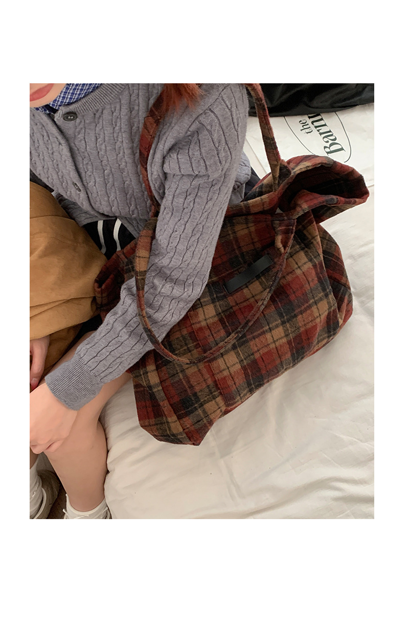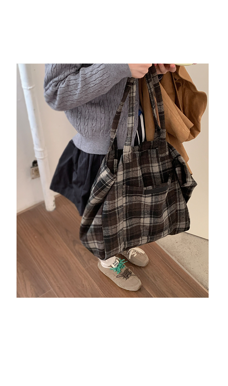 가을과 겨울 모직 격자 무늬 대형 가방 여성의 2024 새로운 한국 스타일 토트 백 대학 스타일 캐주얼 대용량 어깨 가방