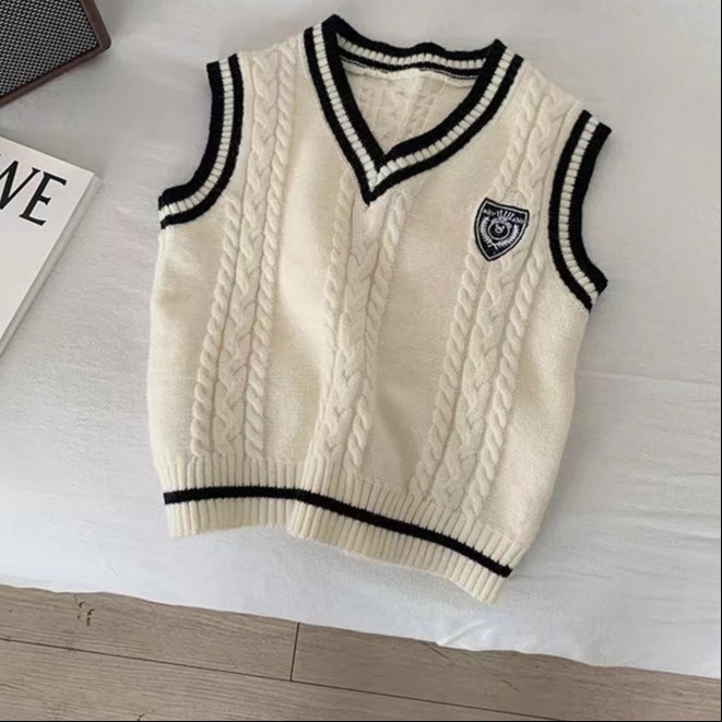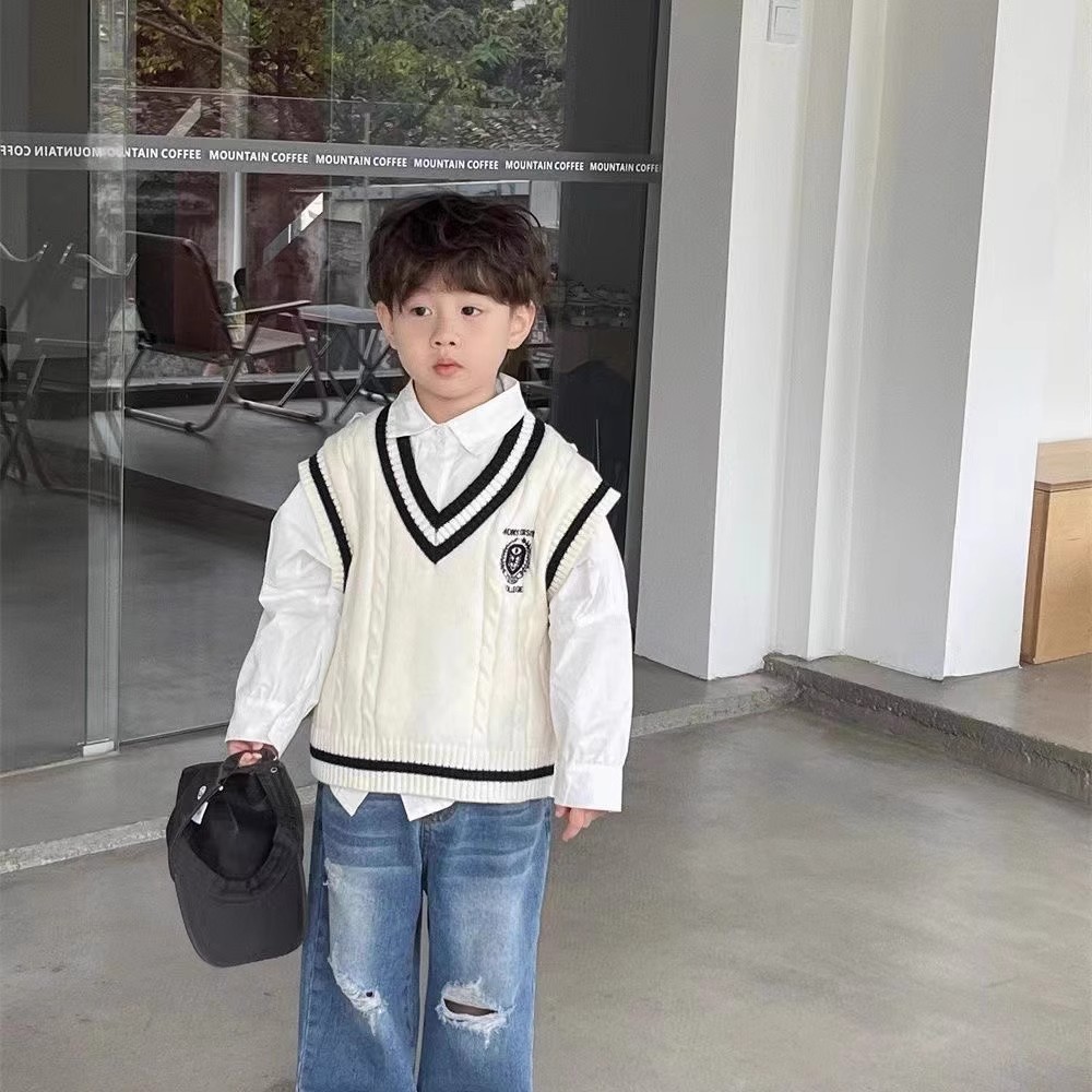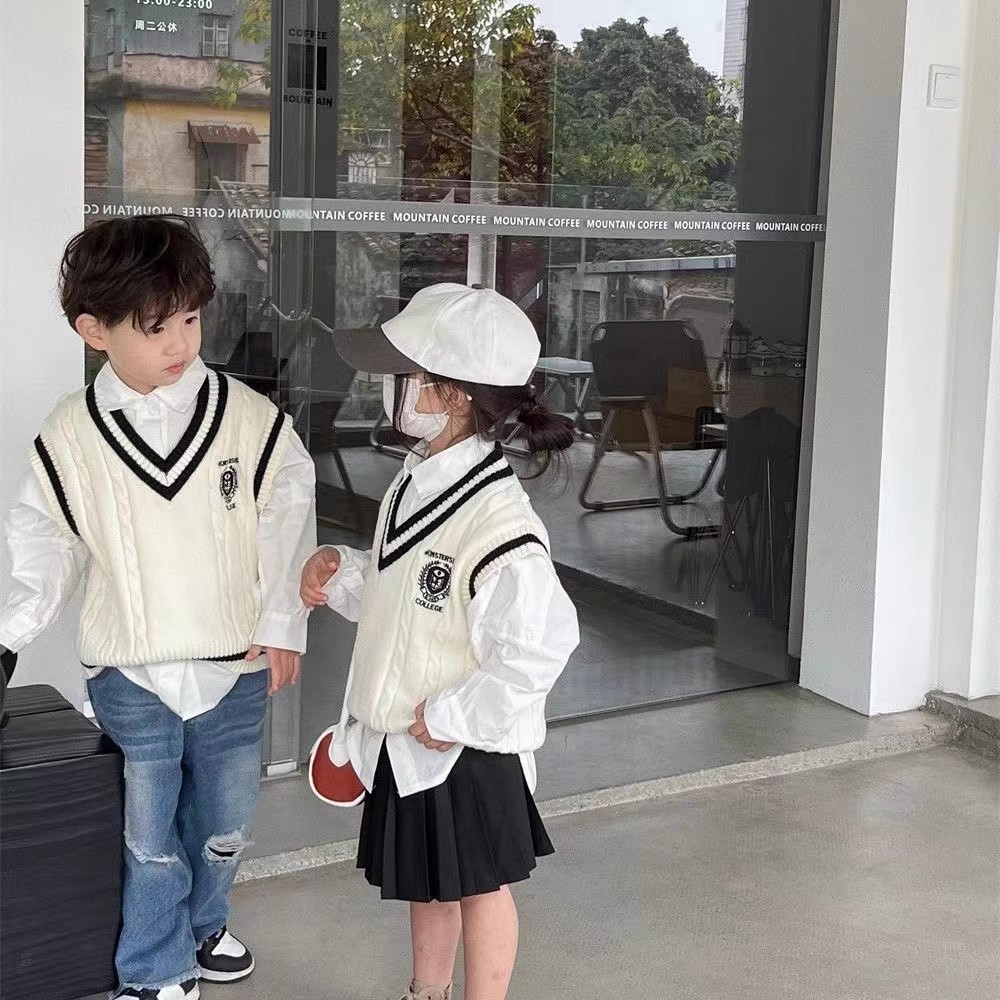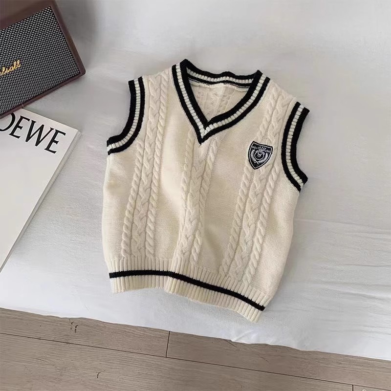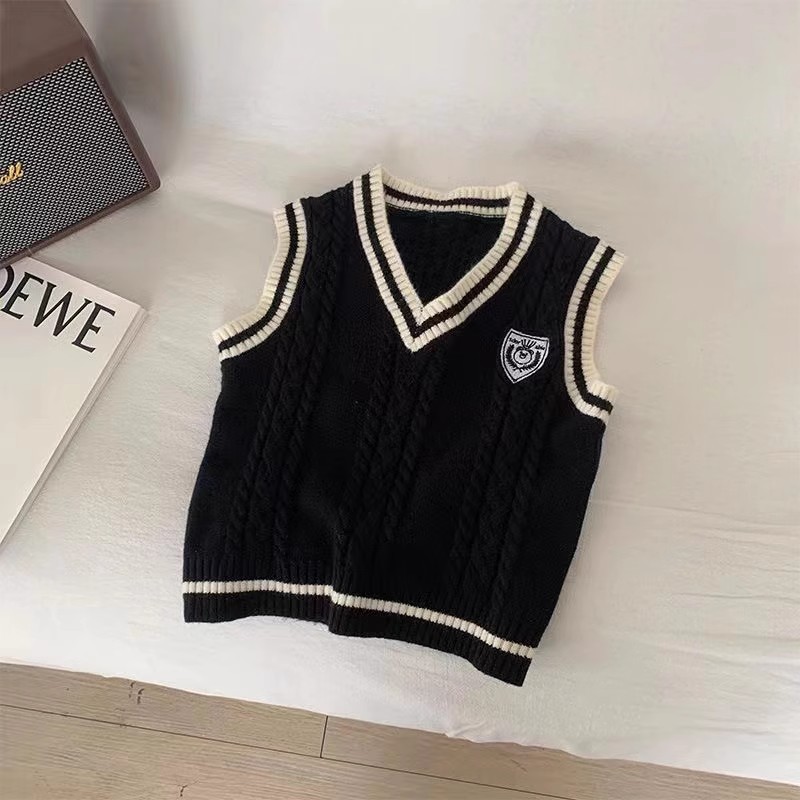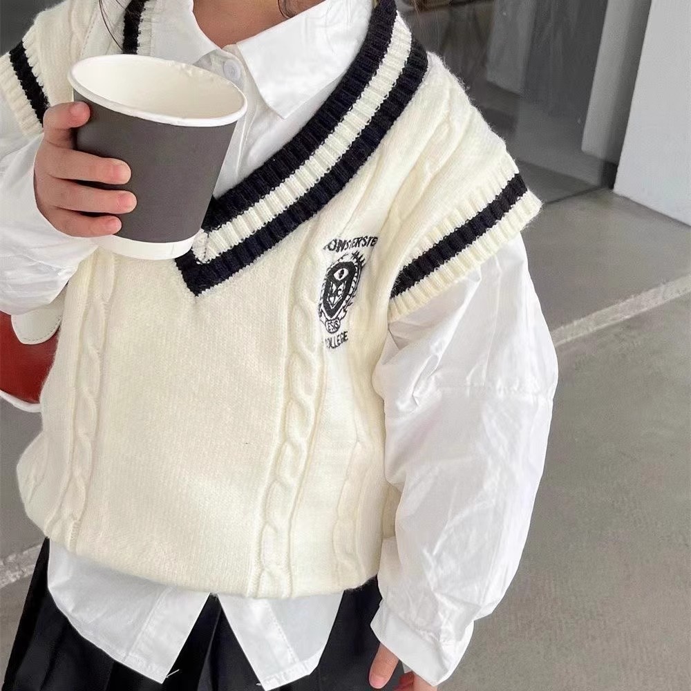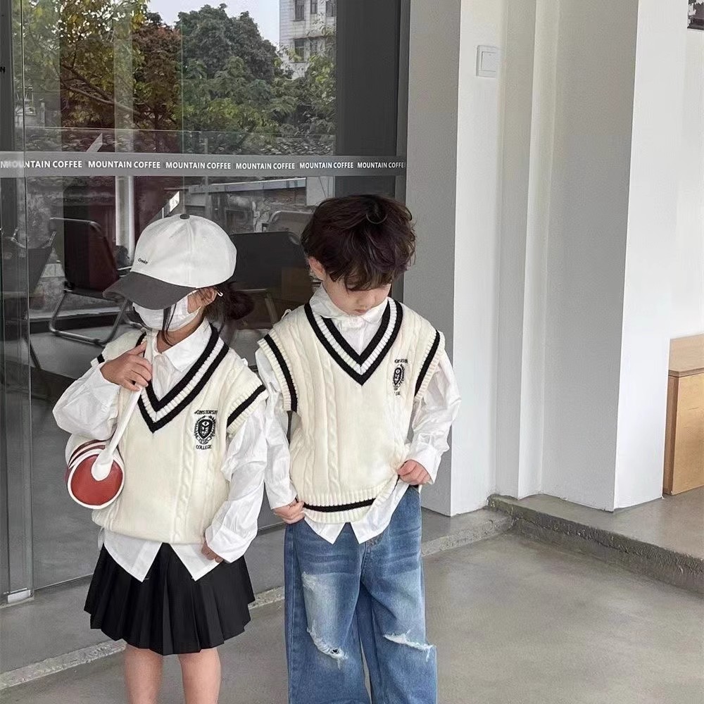 중소형 소년 소녀 대학 스타일 니트 조끼 가을 새 어린이 서양식 대비 컬러 외모 소매 스웨터 조끼스토어 가기