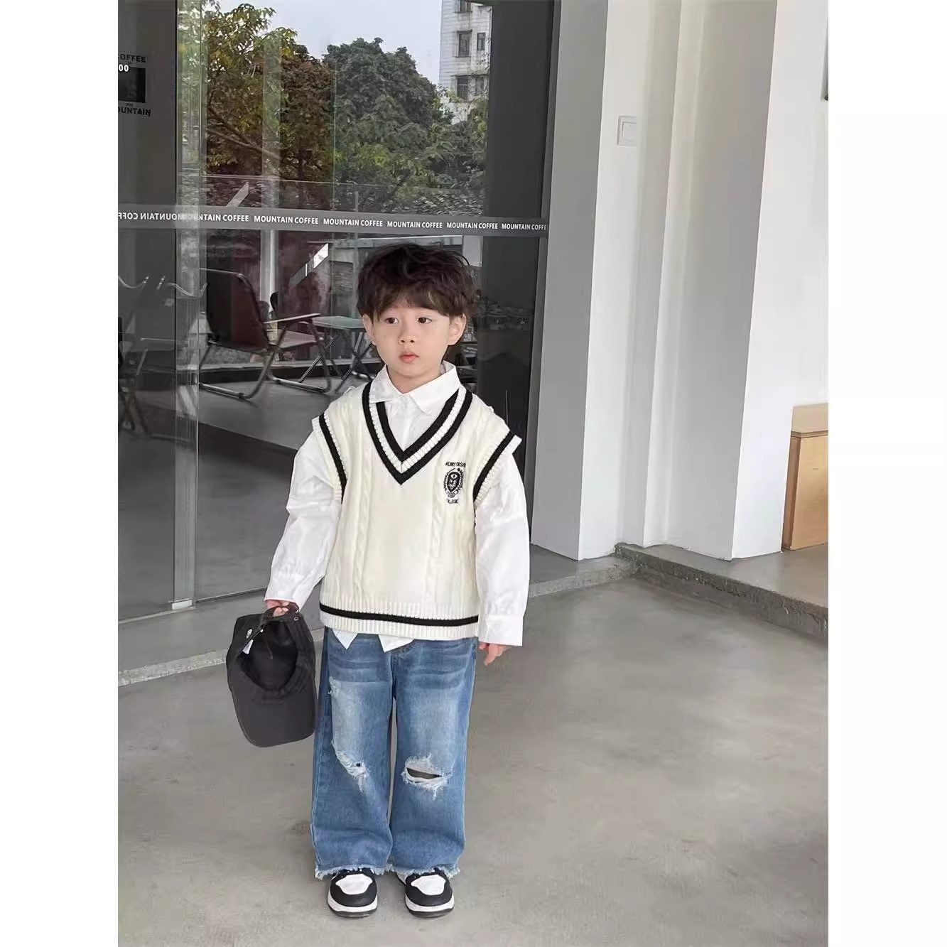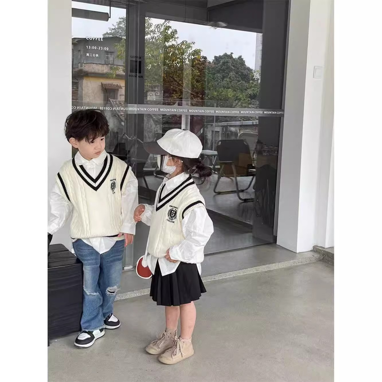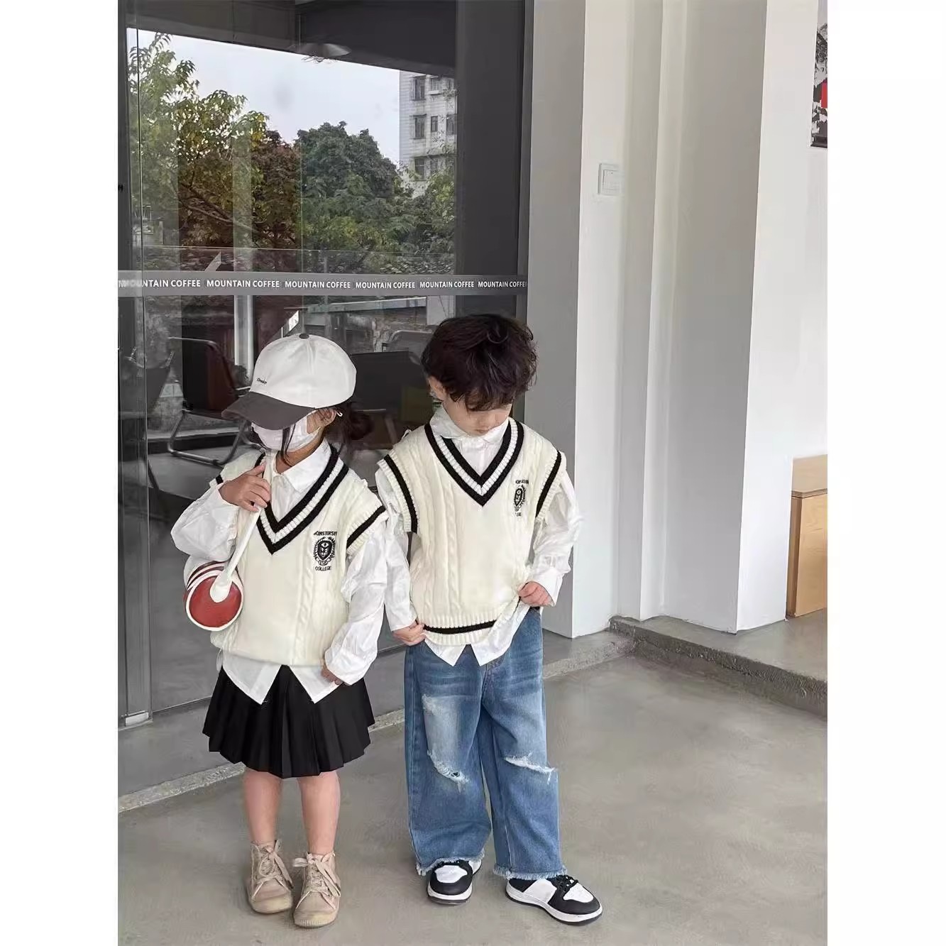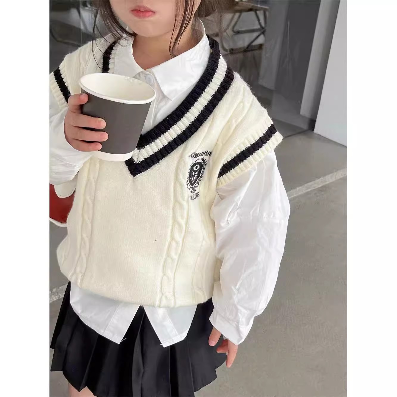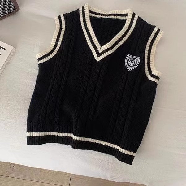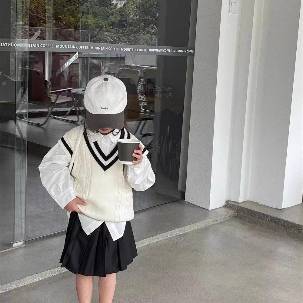 중소형 소년 소녀 대학 스타일 니트 조끼 가을 새 어린이 서양식 대비 컬러 외모 소매 스웨터 조끼스토어 가기
