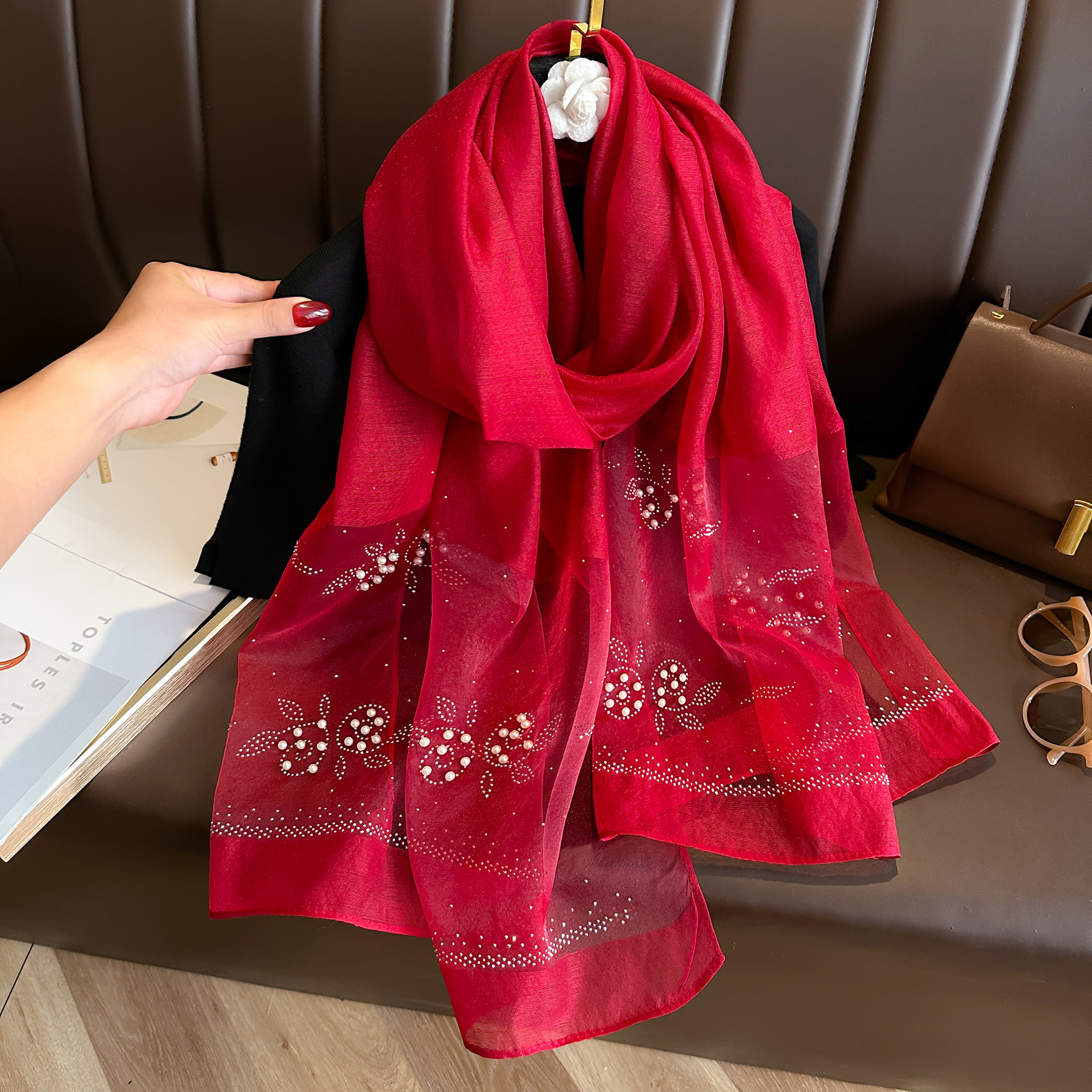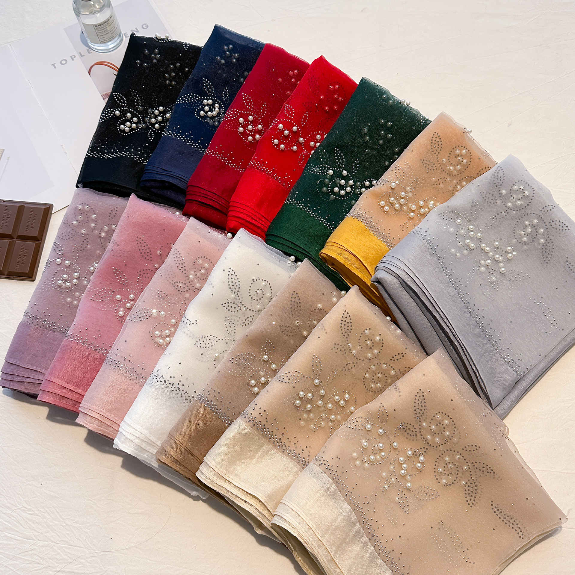 봄과 가을 새로운 단색 실크 스카프 뜨거운 드릴링 꽃 진주 조커 따뜻한 목 목도리 스카프 여성 도매