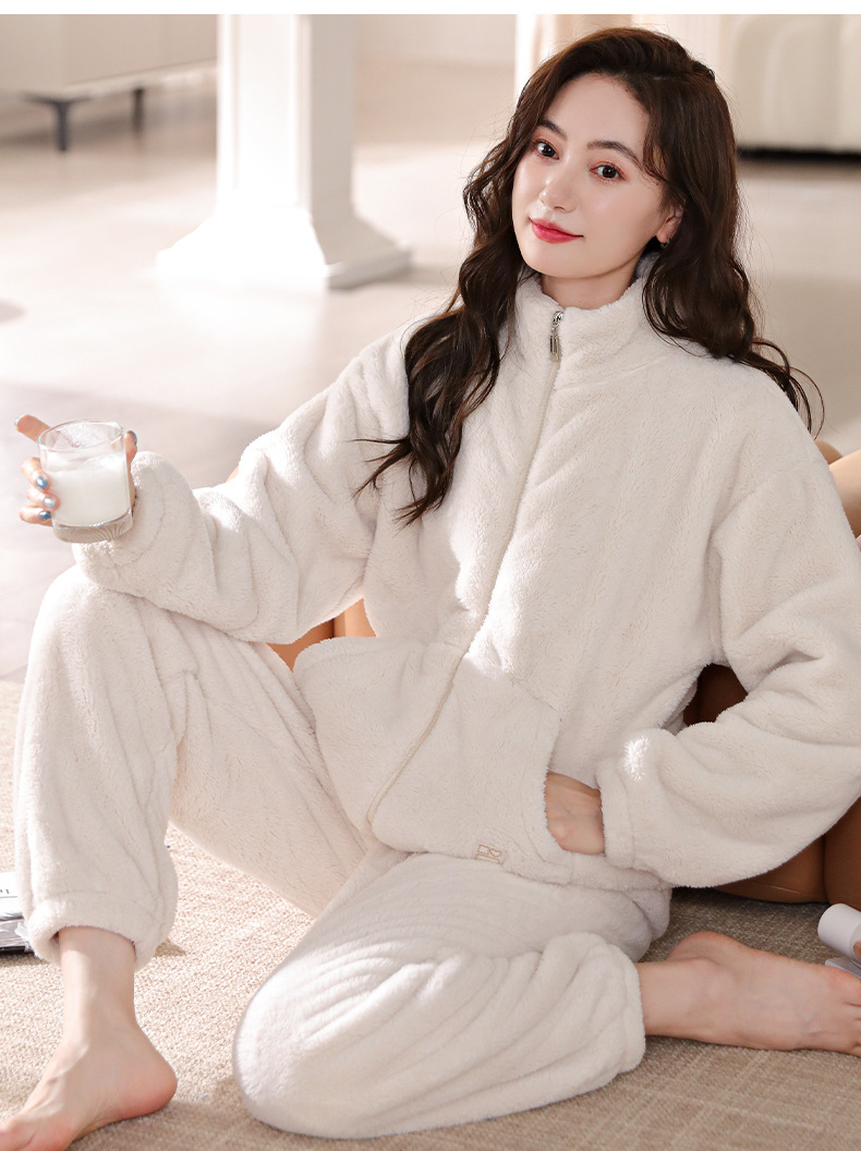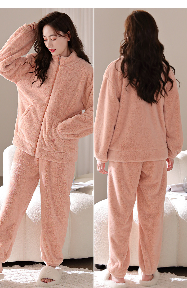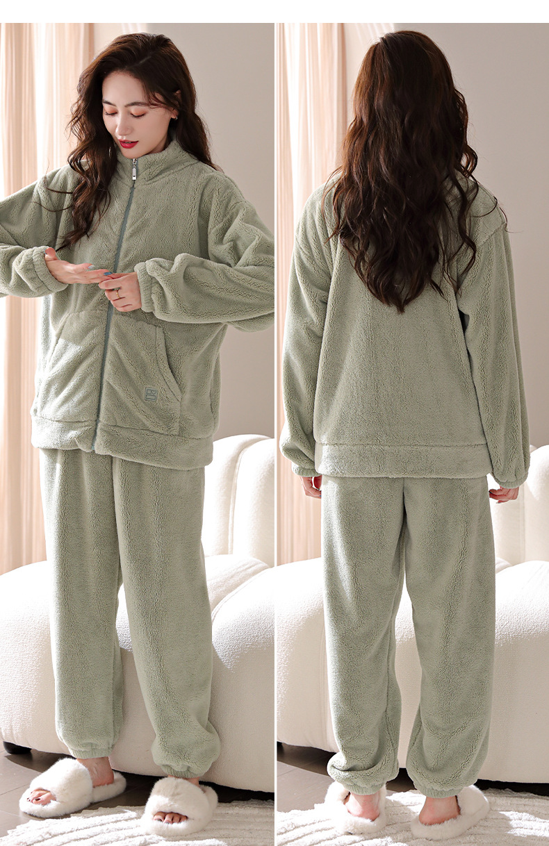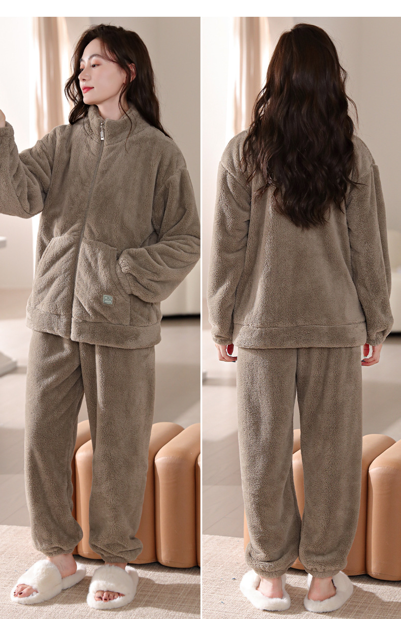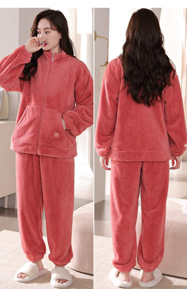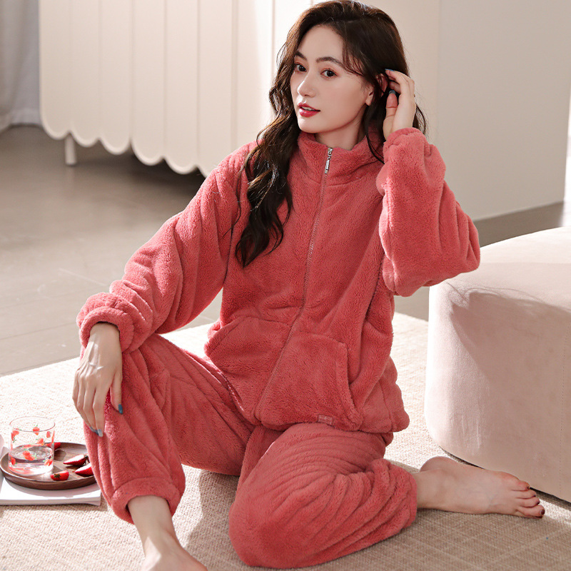 겨울 플란넬 따뜻한 잠옷 여성용 긴팔 바지 지퍼 홈 옷 간단한 캐주얼 여성 투피스 세트