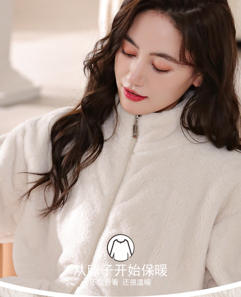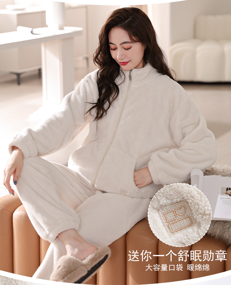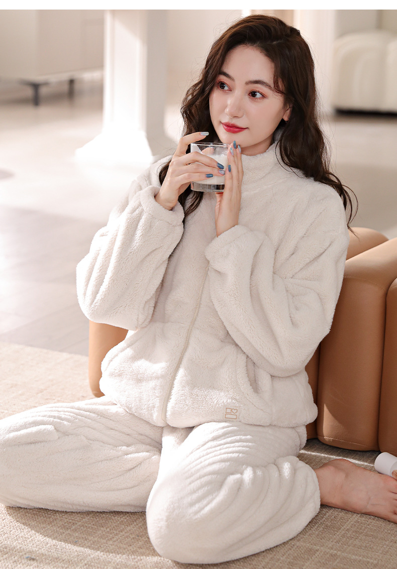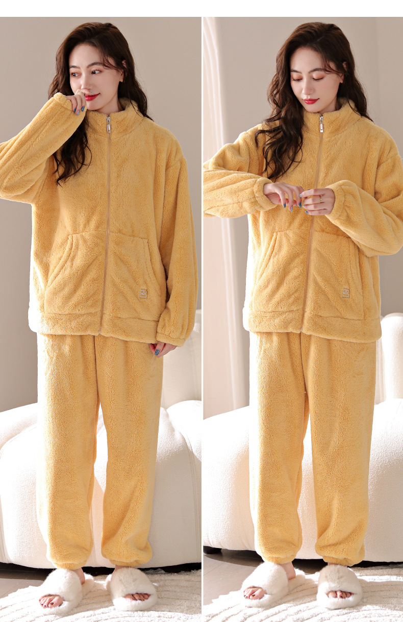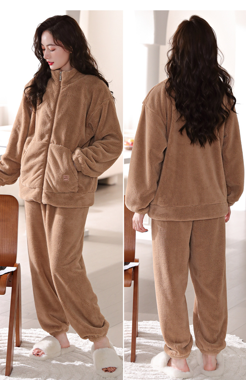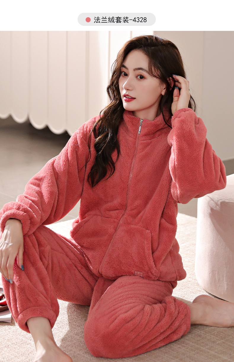 겨울 플란넬 따뜻한 잠옷 여성용 긴팔 바지 지퍼 홈 옷 간단한 캐주얼 여성 투피스 세트