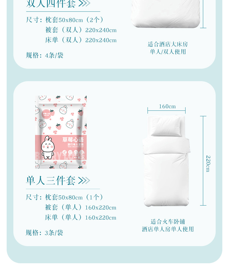 딸기 심장 언어 단일 여행 세트 3 조각 세트 휴대용 일회용 침대 시트 베개 퀼트 커버 여행 침구