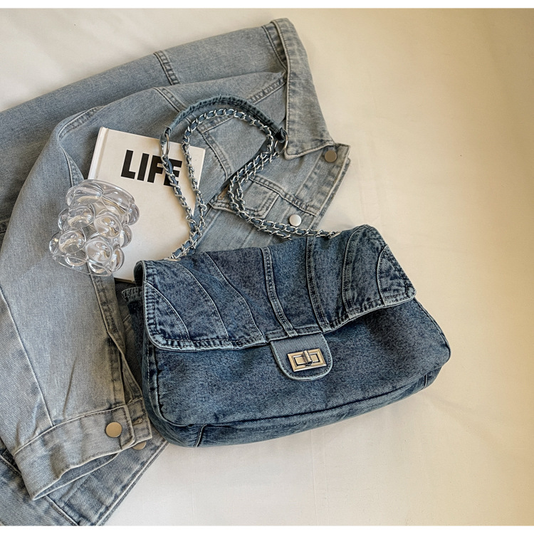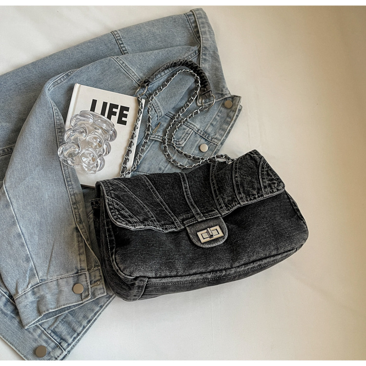세탁 된 데님 가방 여성의 2024 새로운 유행 올 매치 체인 언더암 가방 대용량 통근 숄더 토트 백