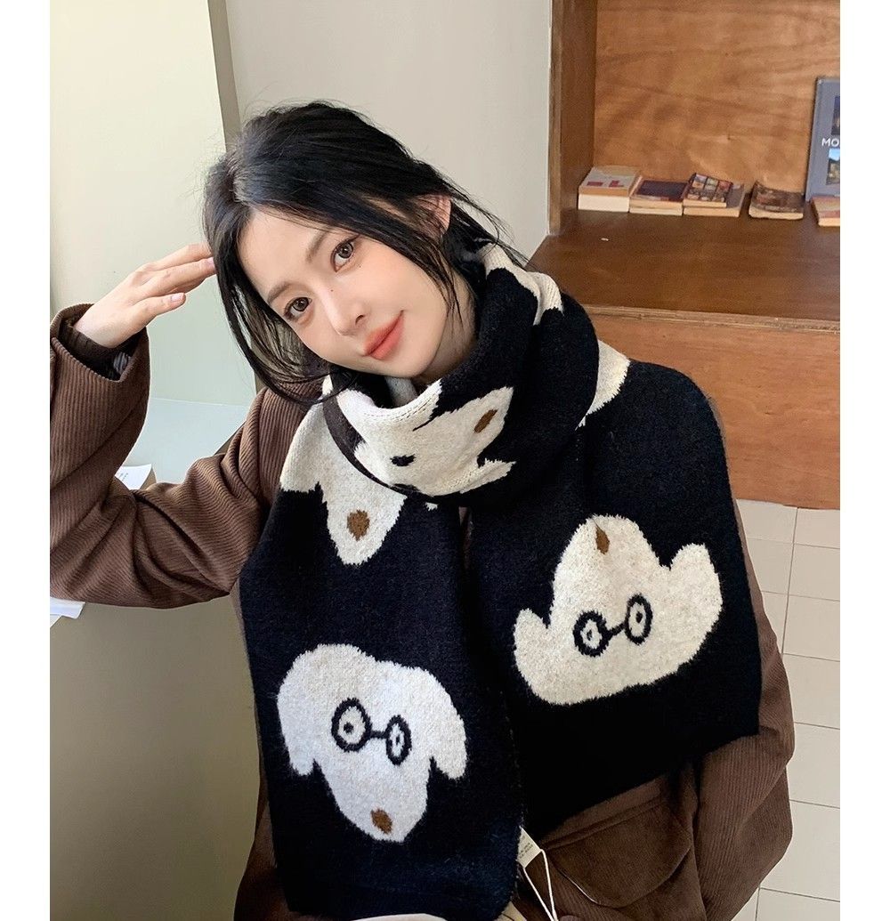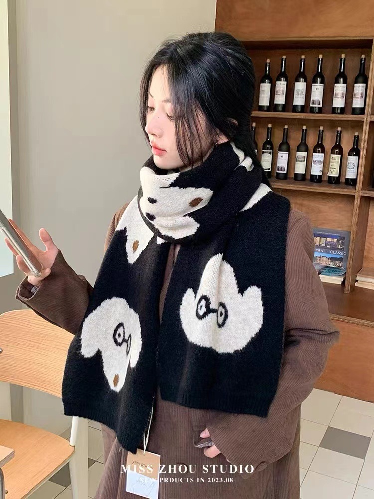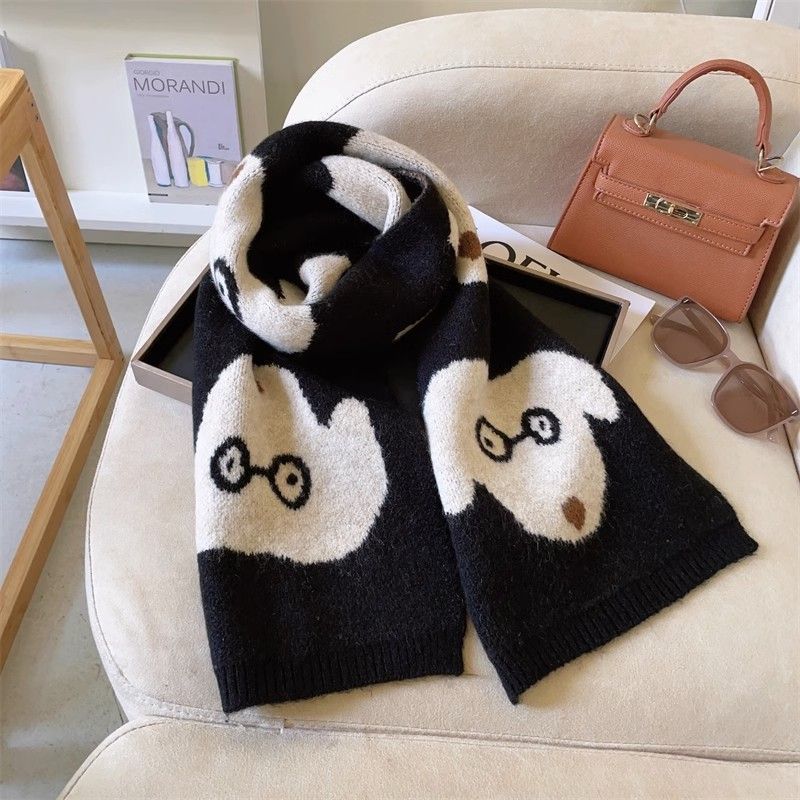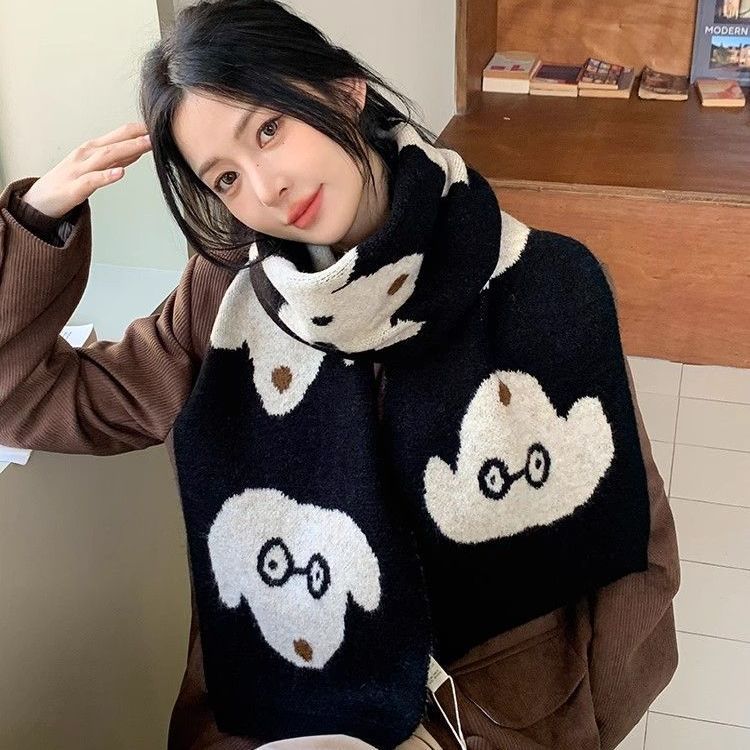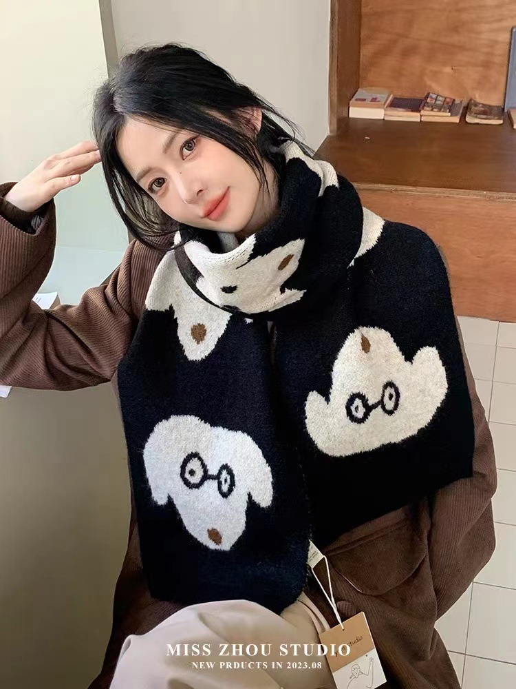 2024 새로운 귀여운 안경 강아지 패턴 학생 커플 쇼핑 조커 두꺼운 가을과 겨울 소녀 스카프 도매