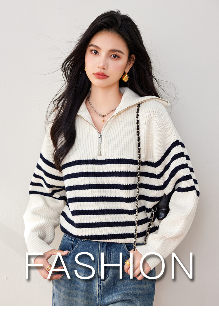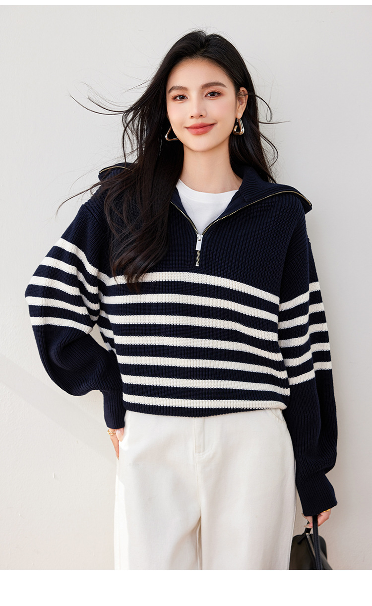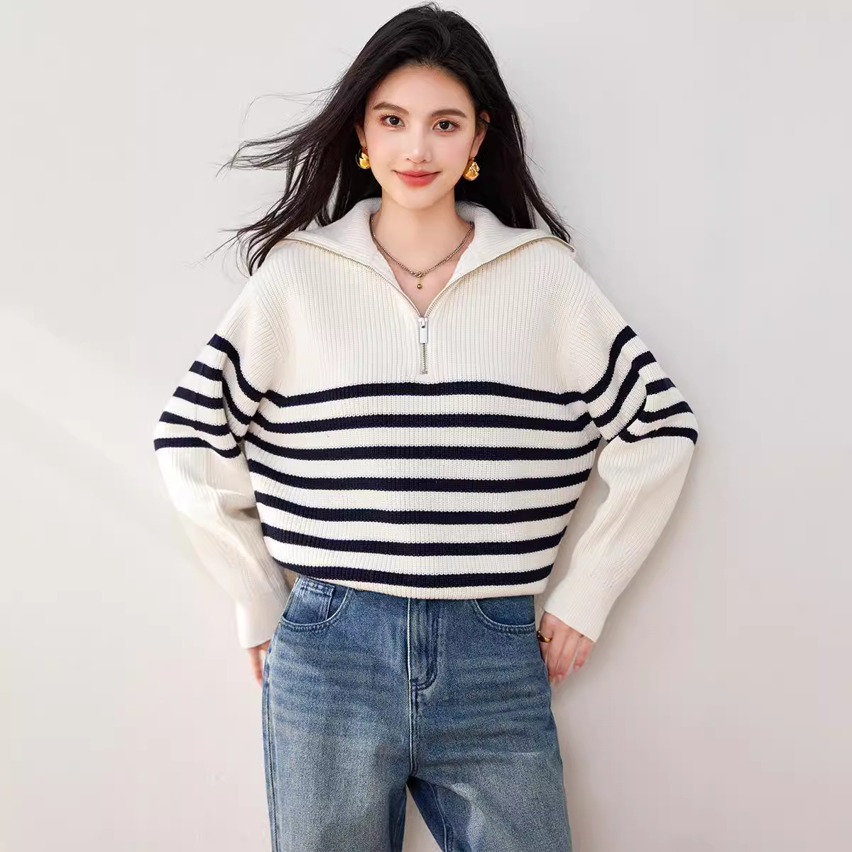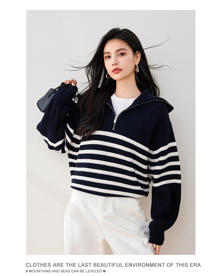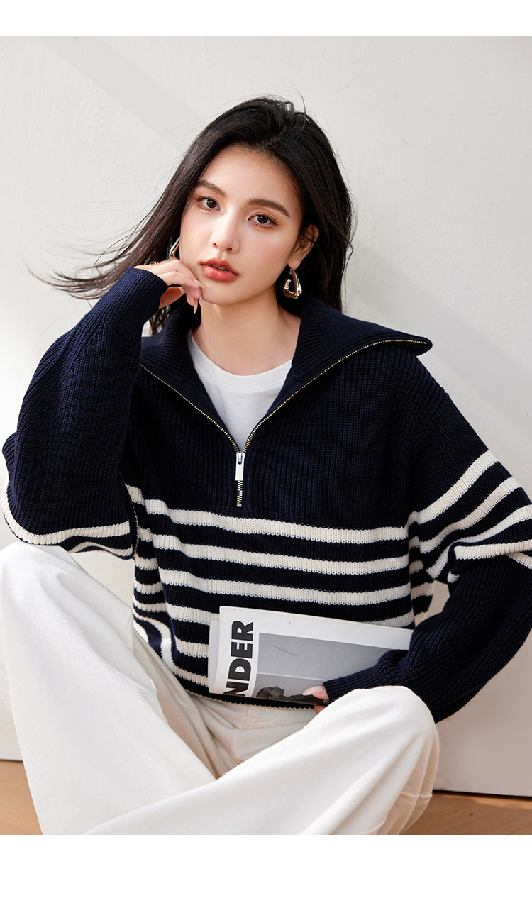 2024 가을과 겨울 새로운 한국 스타일 대학 해군 칼라 캐주얼 패션 터틀넥 옷깃 지퍼 디자인 여성용 니트 스웨터스토어 가기