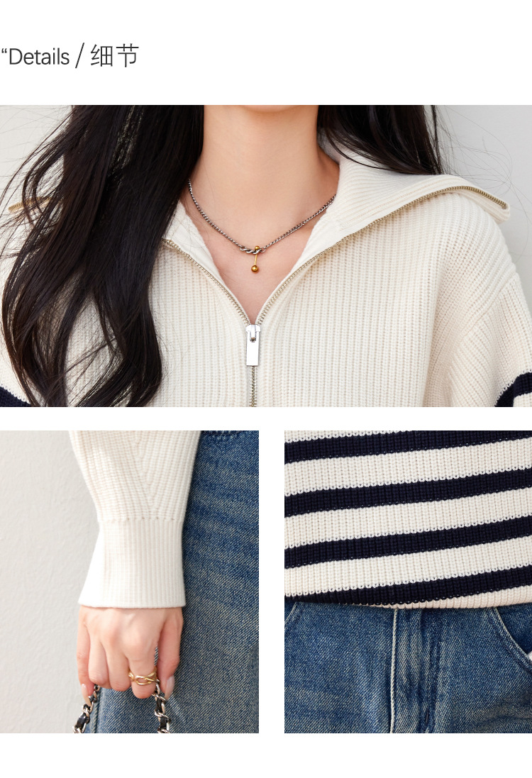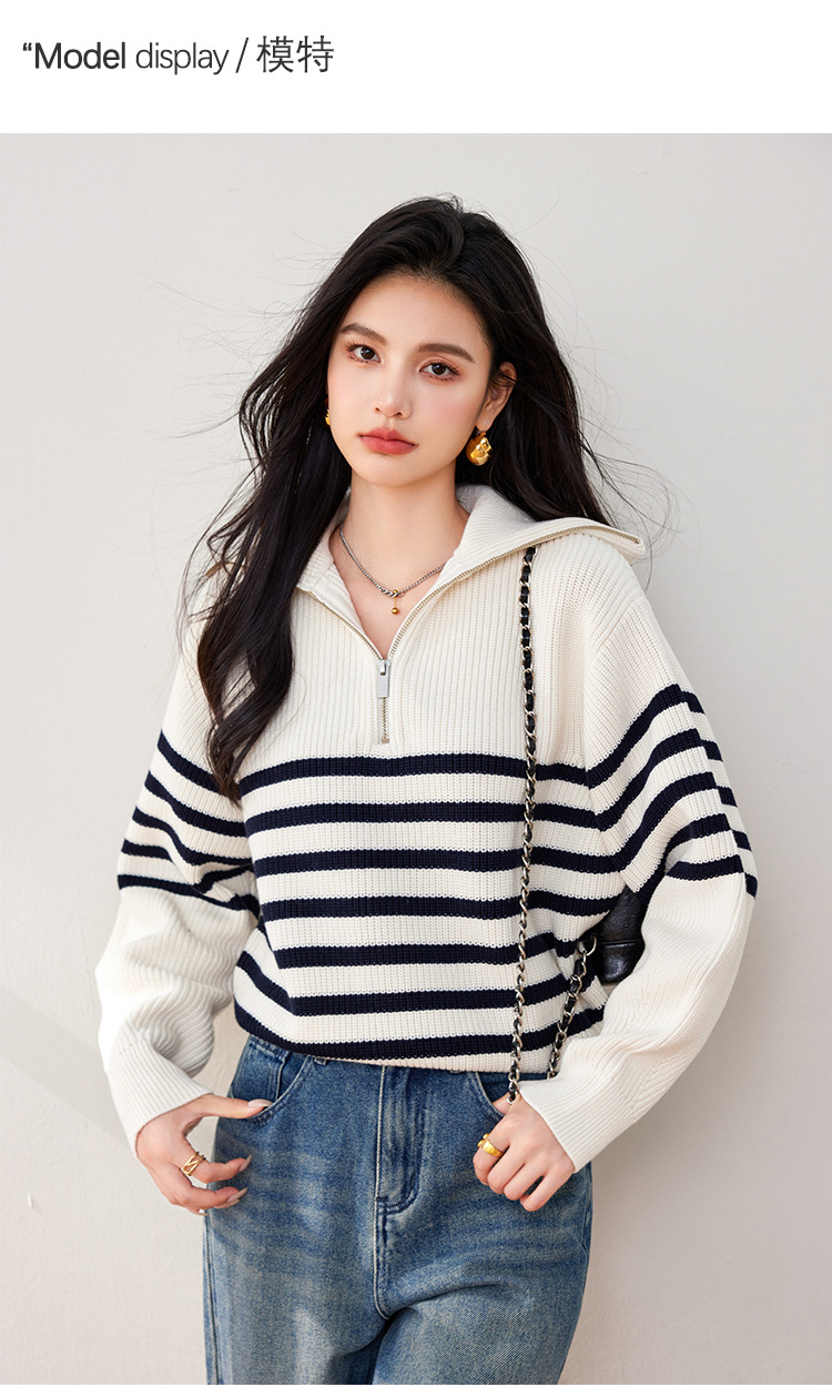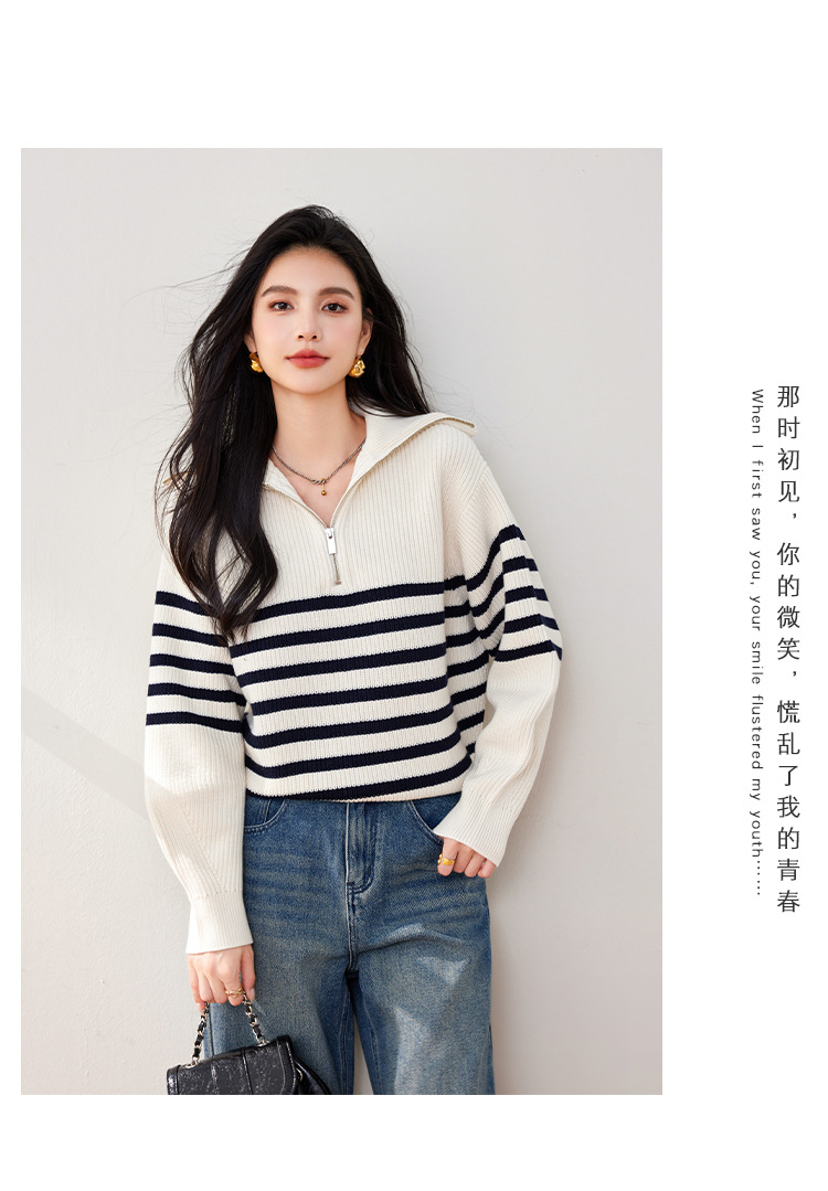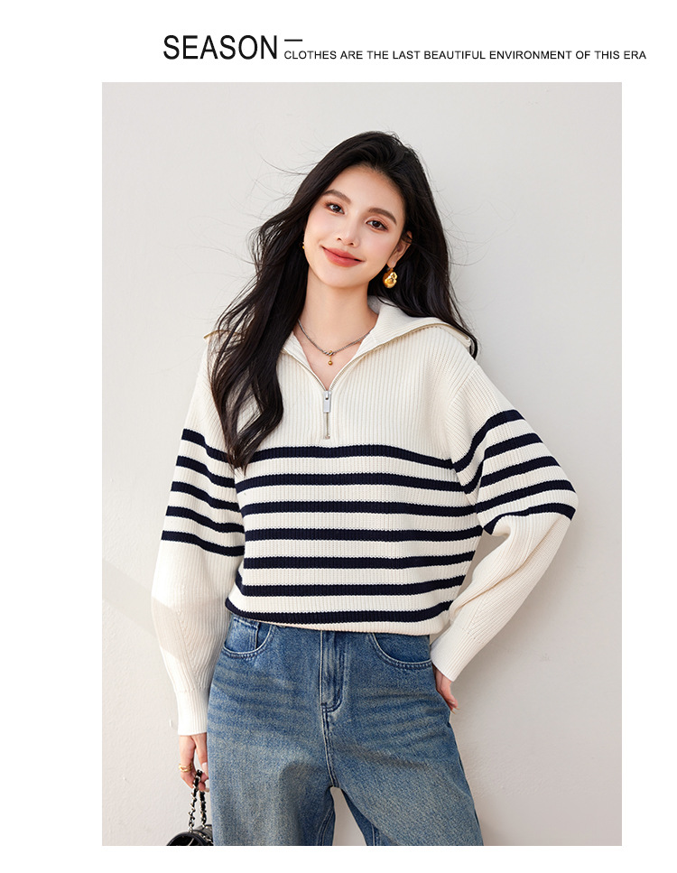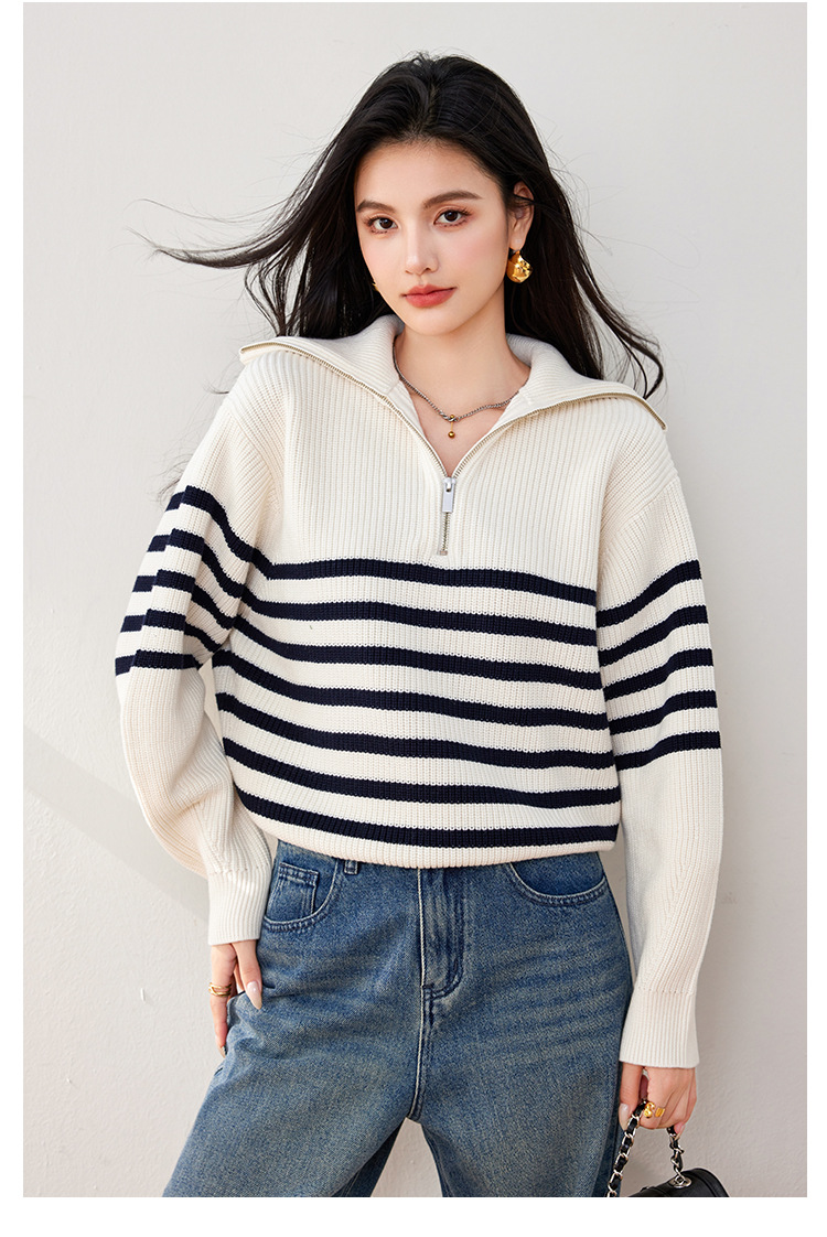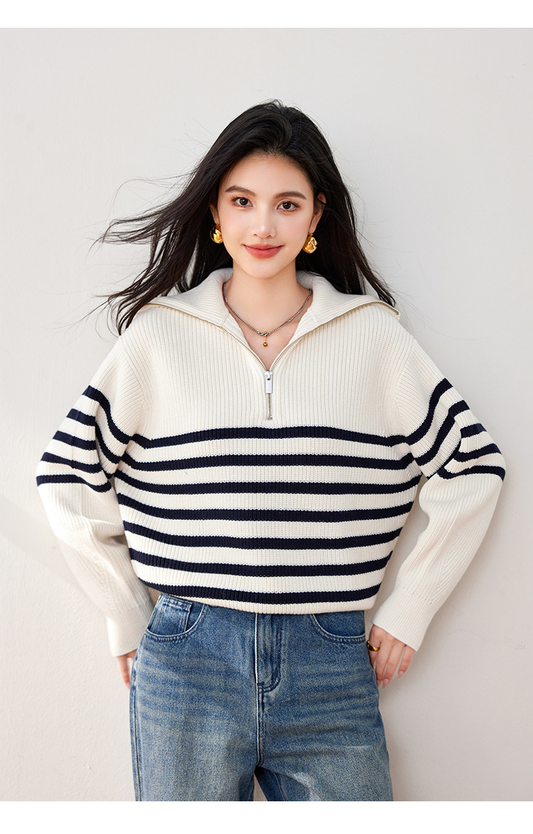 2024 가을과 겨울 새로운 한국 스타일 대학 해군 칼라 캐주얼 패션 터틀넥 옷깃 지퍼 디자인 여성용 니트 스웨터스토어 가기