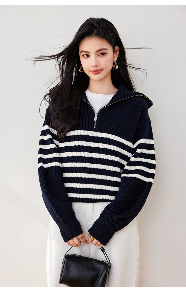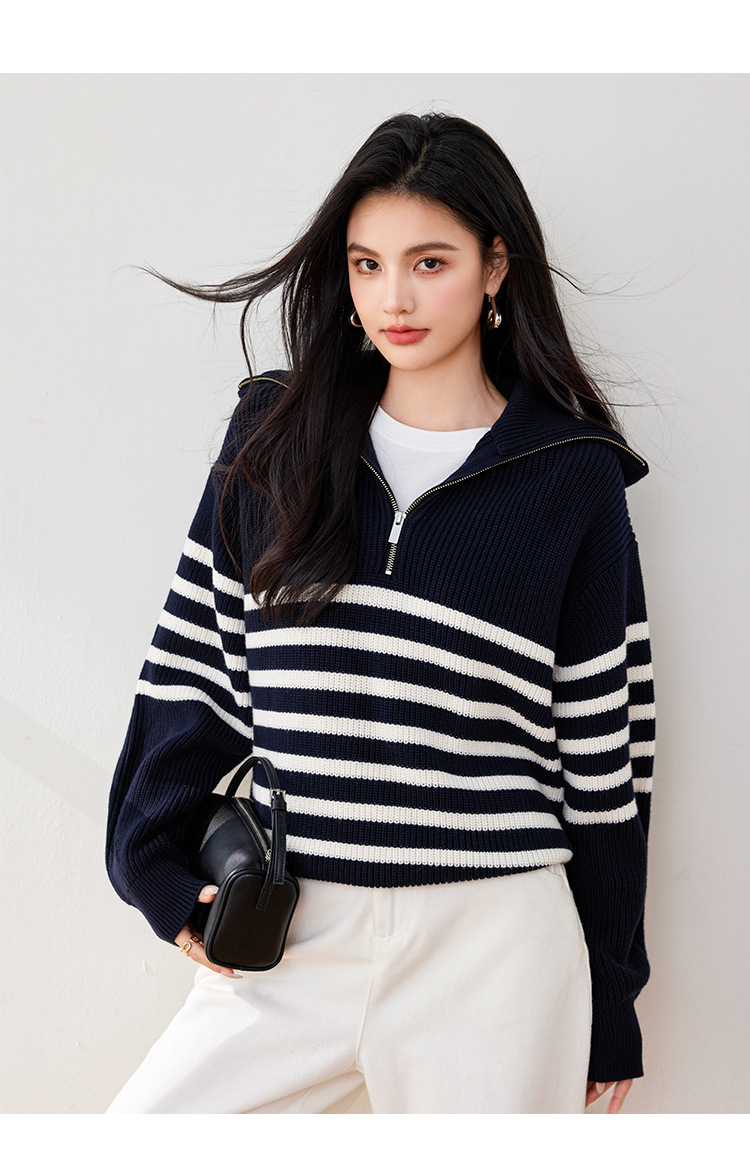 2024 가을과 겨울 새로운 한국 스타일 대학 해군 칼라 캐주얼 패션 터틀넥 옷깃 지퍼 디자인 여성용 니트 스웨터