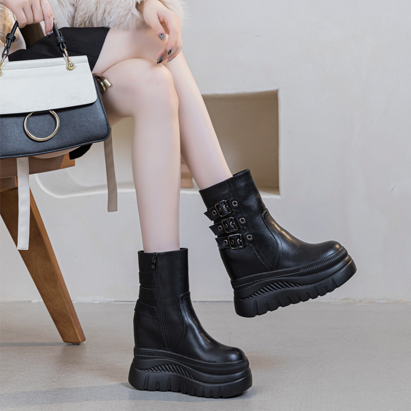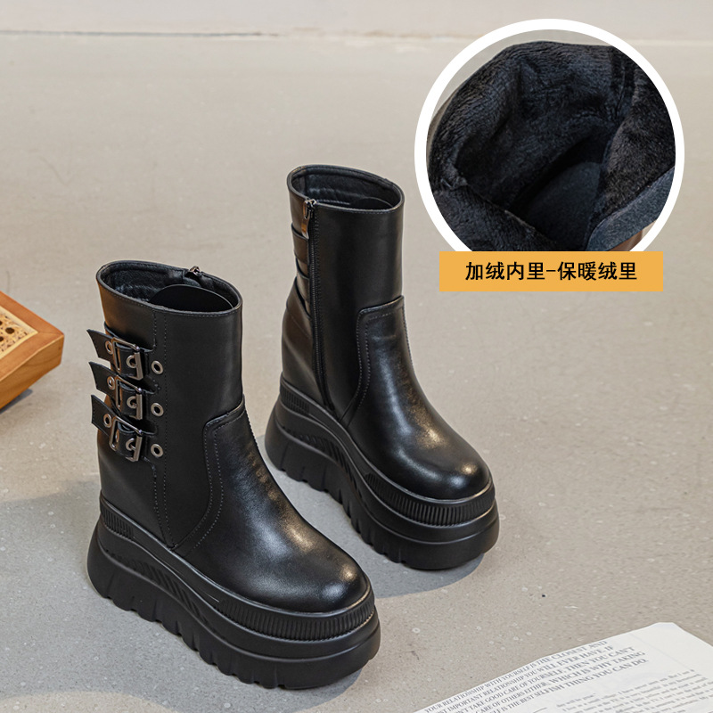 초하이힐 두꺼운 밑창 중간 길이 여성 가죽 부츠 2025 가을 겨울 신상 단색 벨트 버클 내장 키높이 숏부츠 트렌디