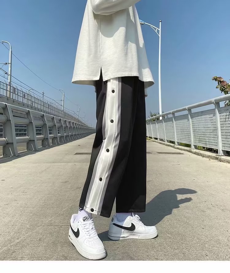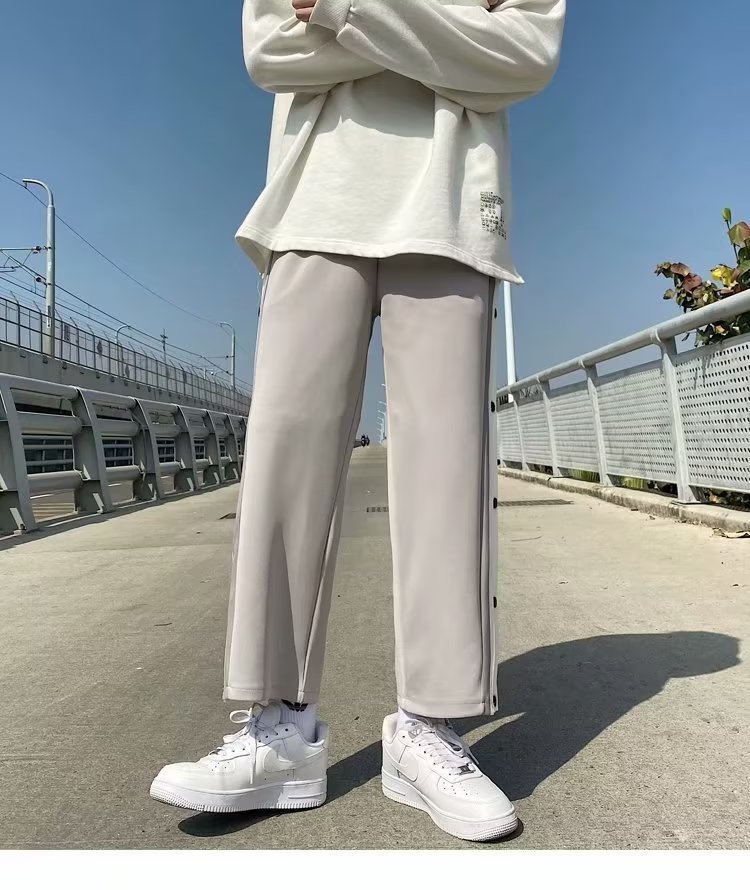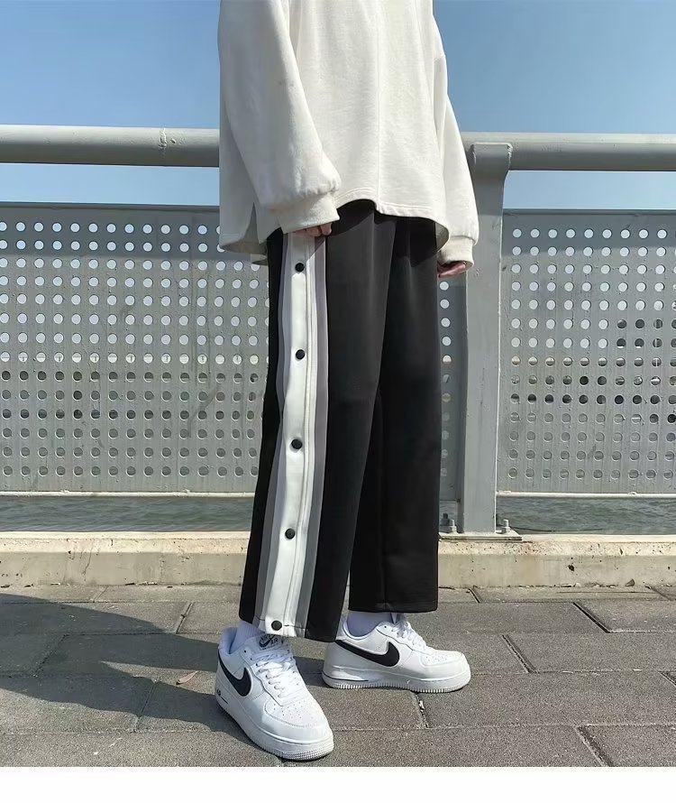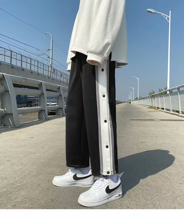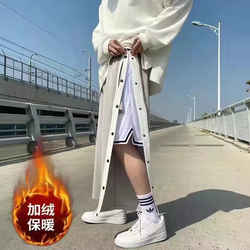 스트레이트 브레스트 바지 남자 가을과 겨울 사이드 행 풀 오픈 버클 초 오프 농구 스포츠 팬츠 겨울 기모 넓은 다리 캐주얼 바지