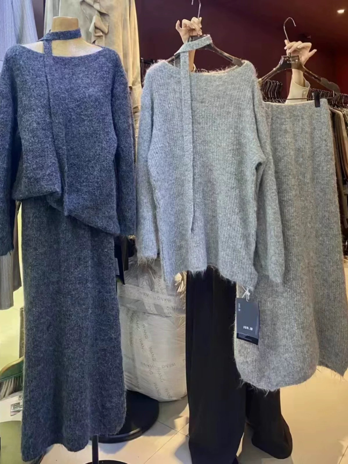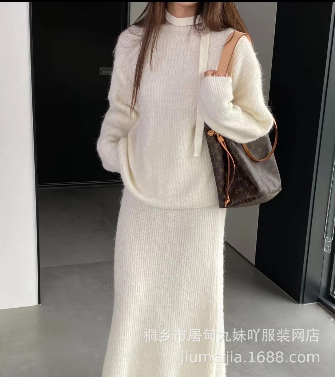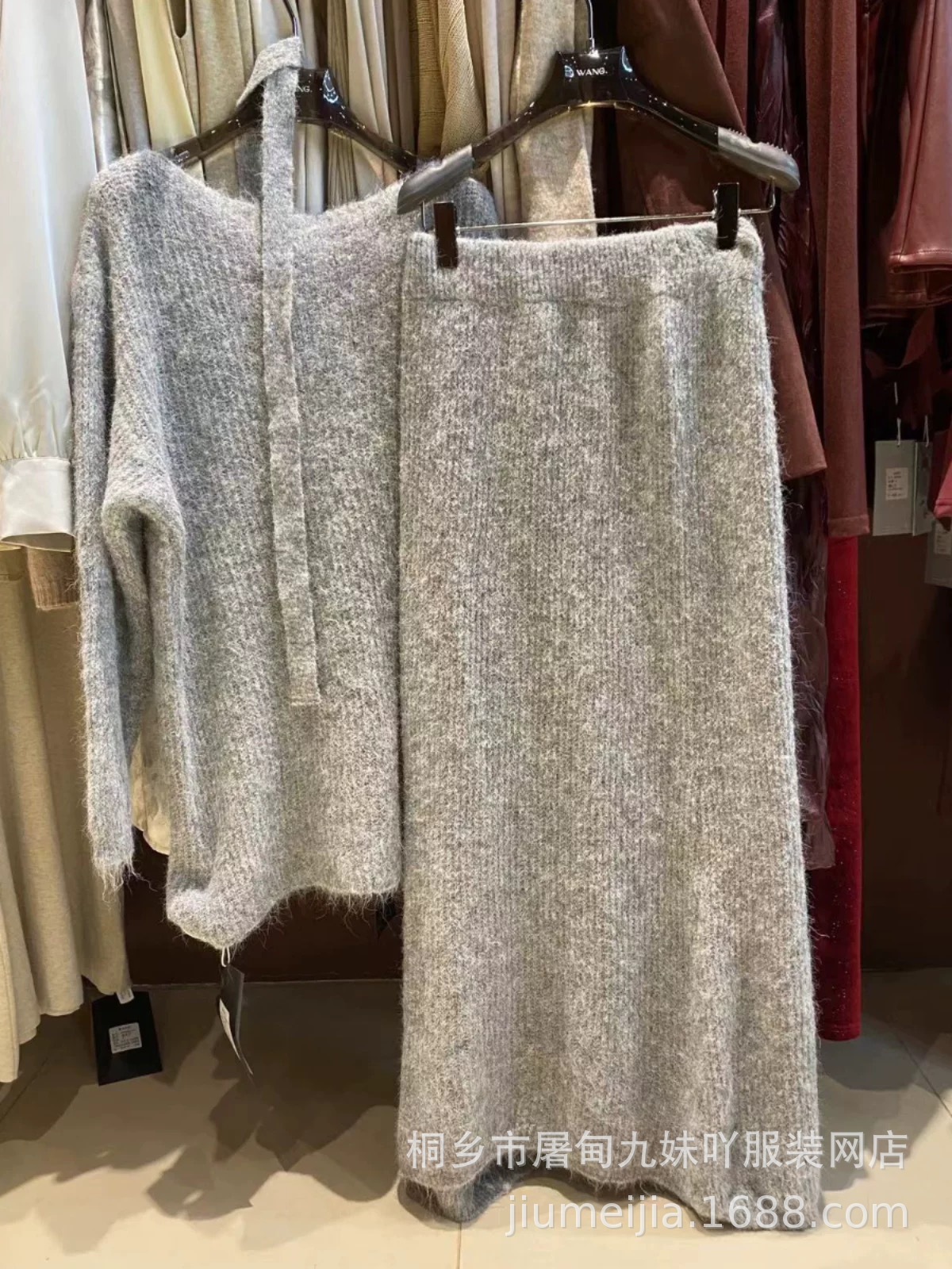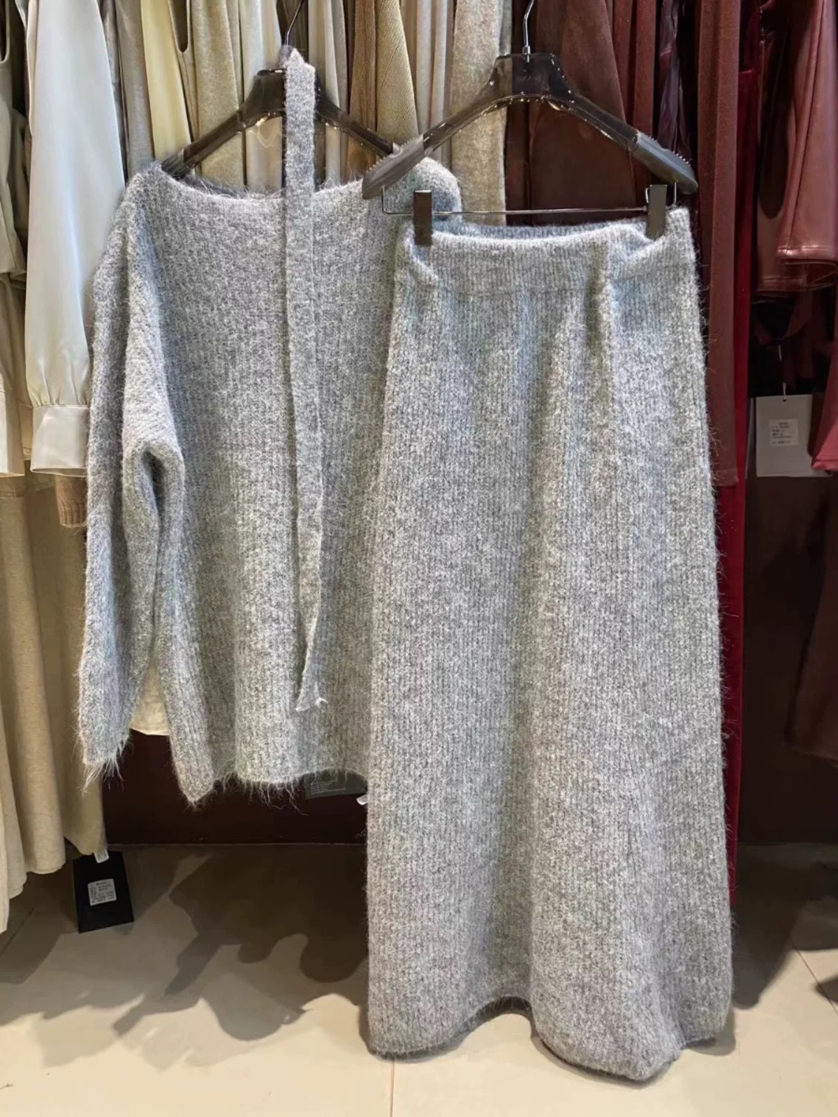 2025 가을 겨울 신상 패션 심플하고 여유로운 울 니트 탑과 하이웨이스트 미디 스커트 투피스 세트 여성용스토어 가기