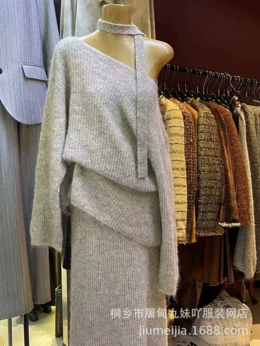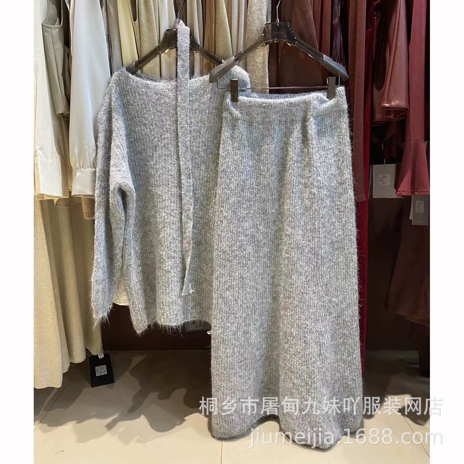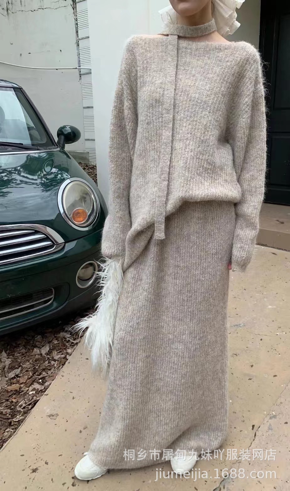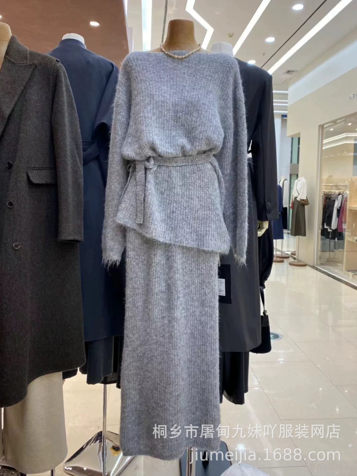 2025 가을 겨울 신상 패션 심플하고 여유로운 울 니트 탑과 하이웨이스트 미디 스커트 투피스 세트 여성용스토어 가기