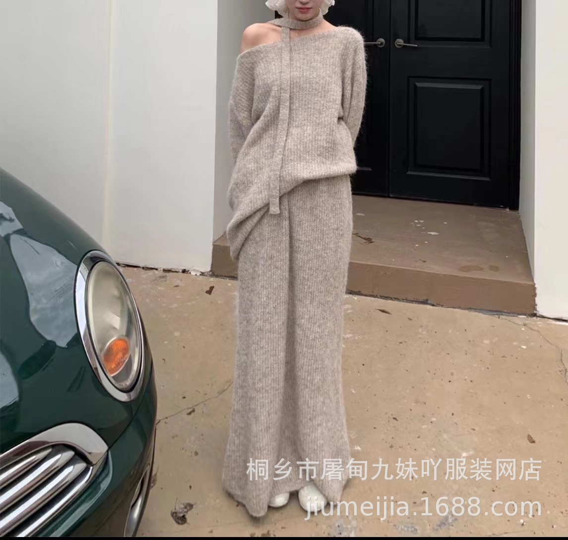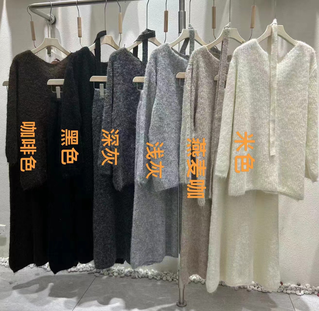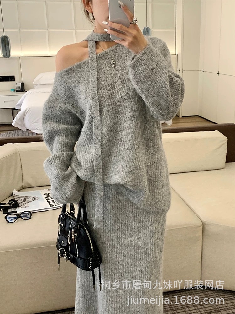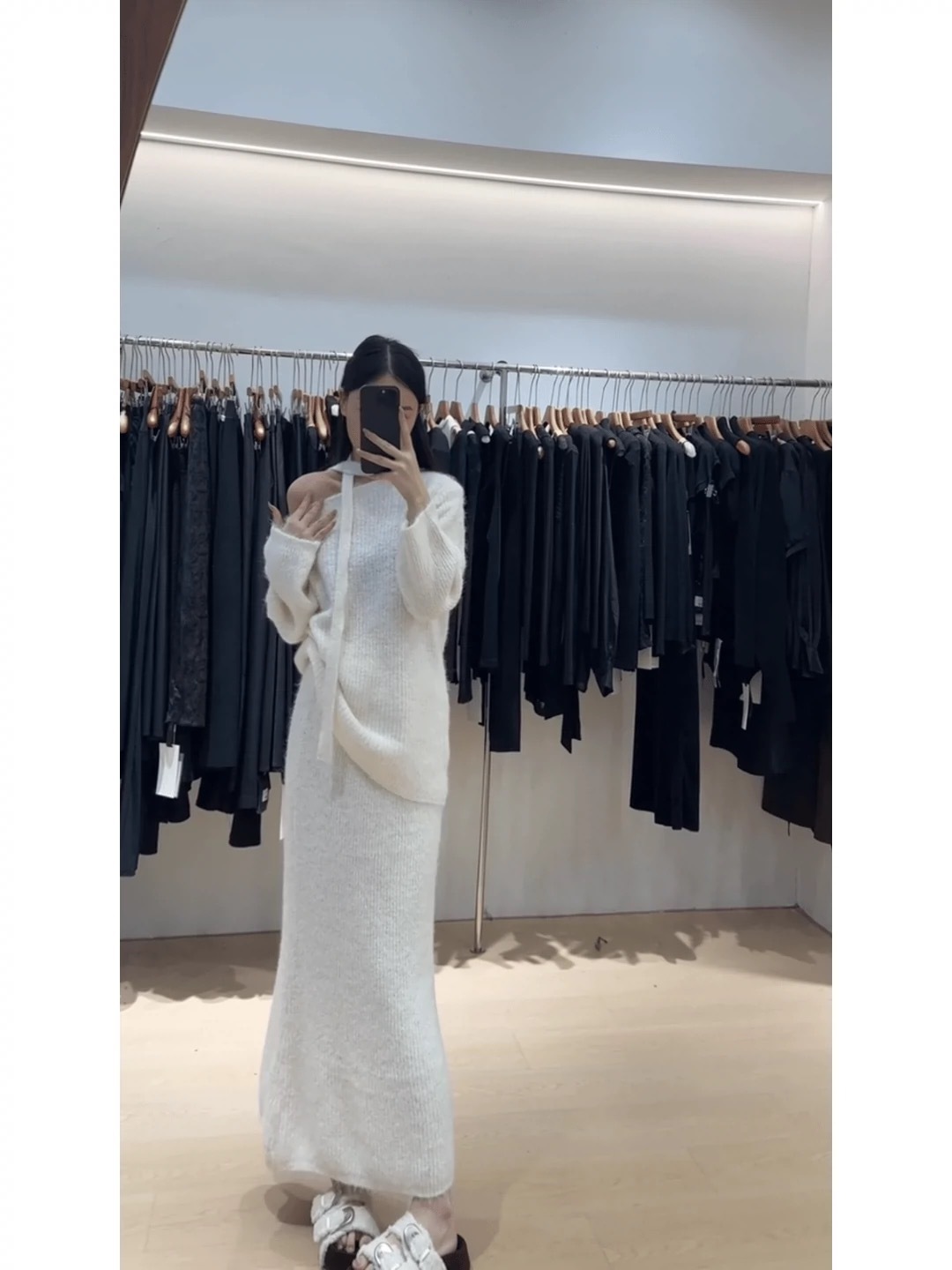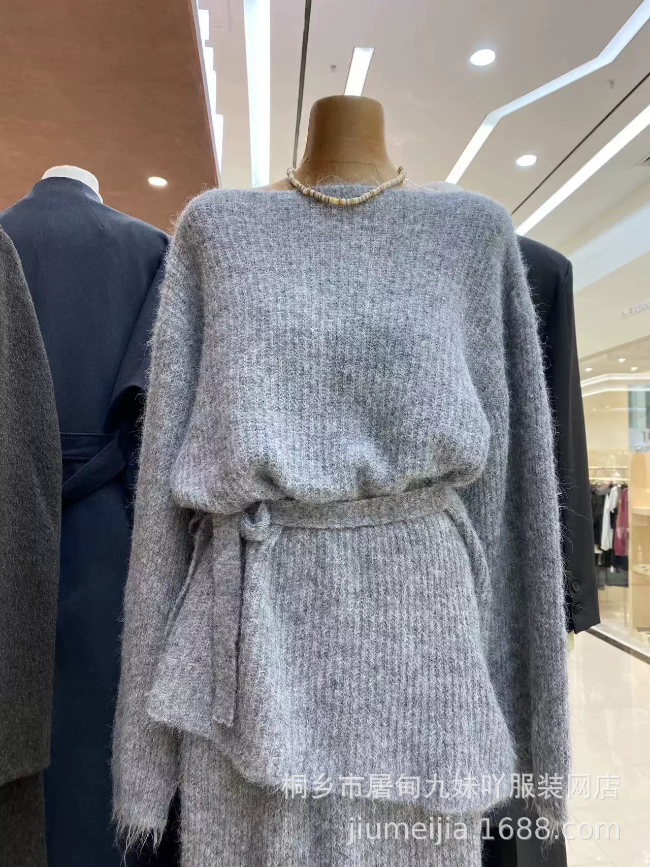 2025 가을 겨울 신상 패션 심플하고 여유로운 울 니트 탑과 하이웨이스트 미디 스커트 투피스 세트 여성용스토어 가기