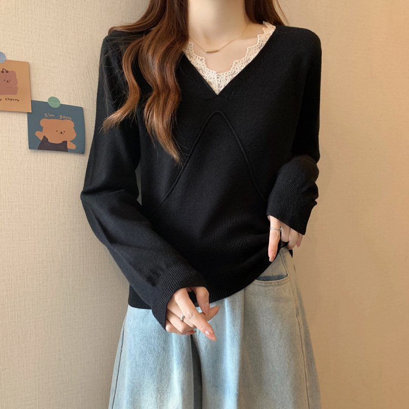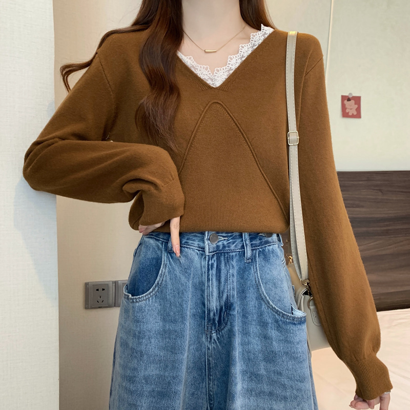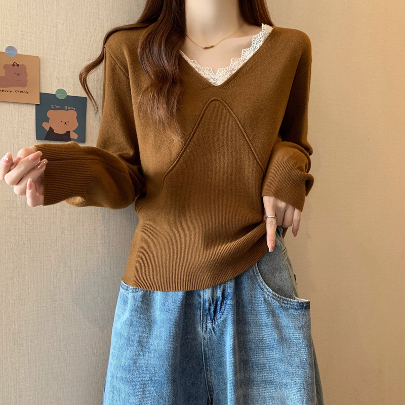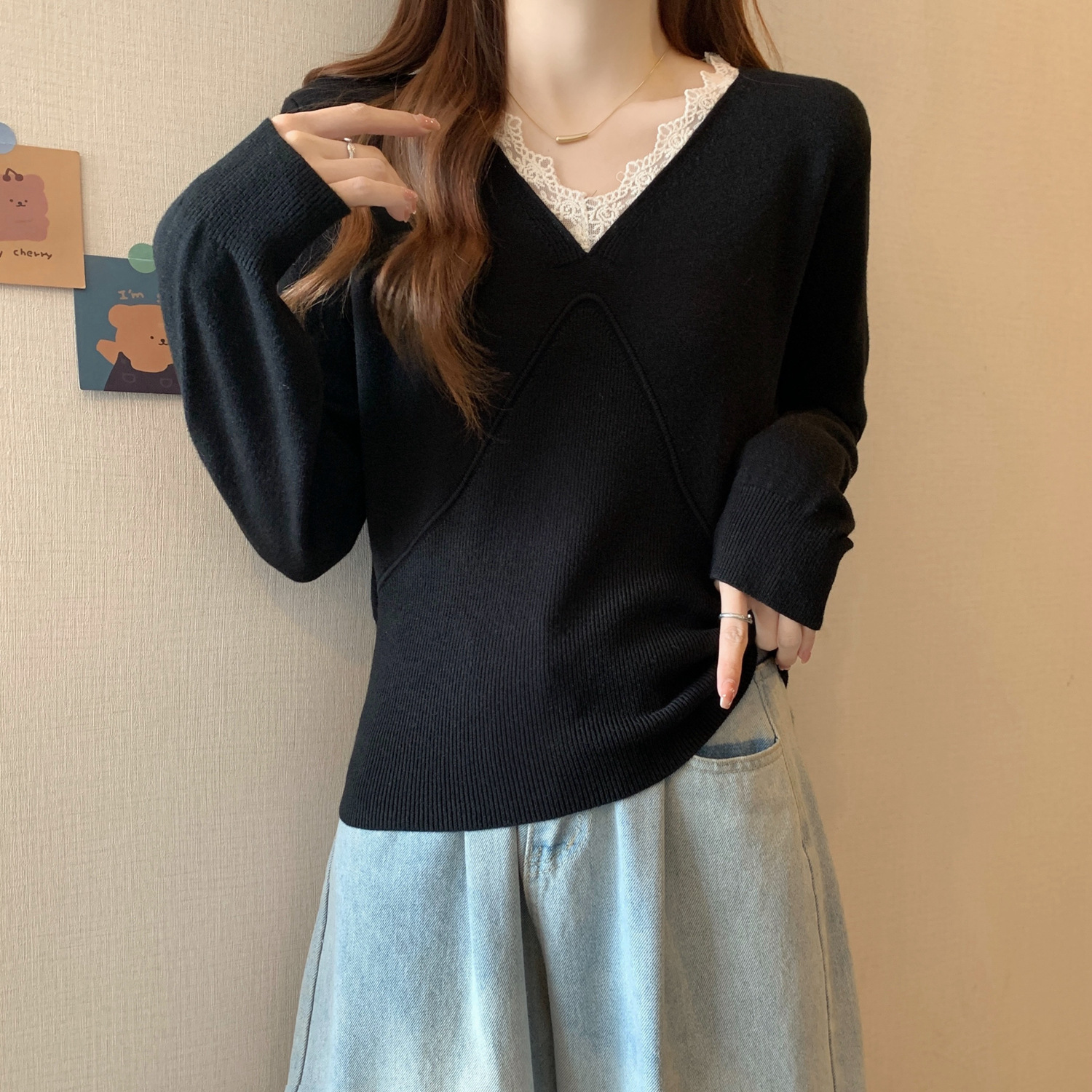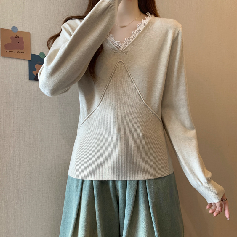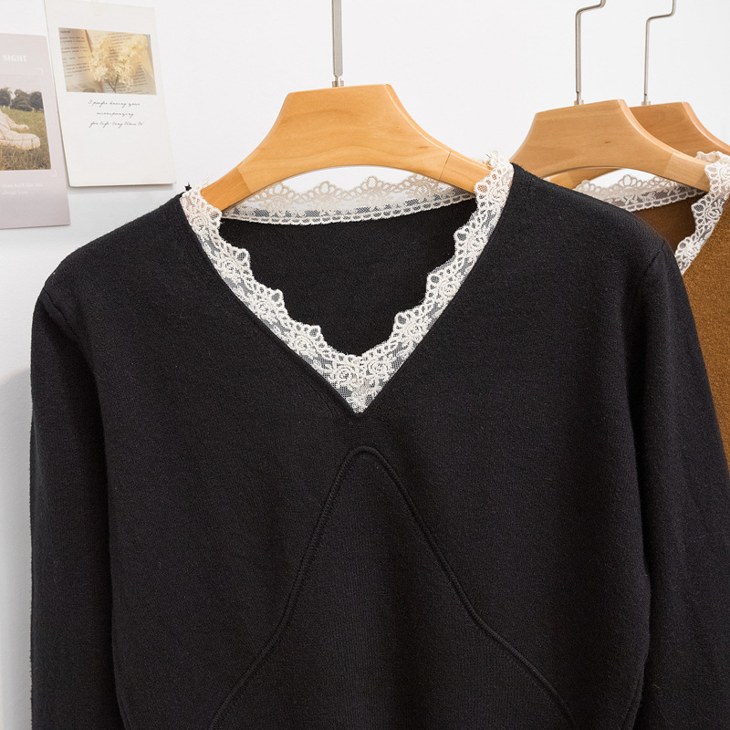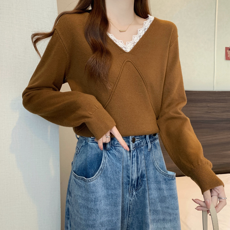 리얼 샷 ~ 플러스 사이즈 여성 통통녀 레이스 v-neck 가을과 겨울 2023 느슨한 슬림 새로운 스웨터 풀오버 스웨터