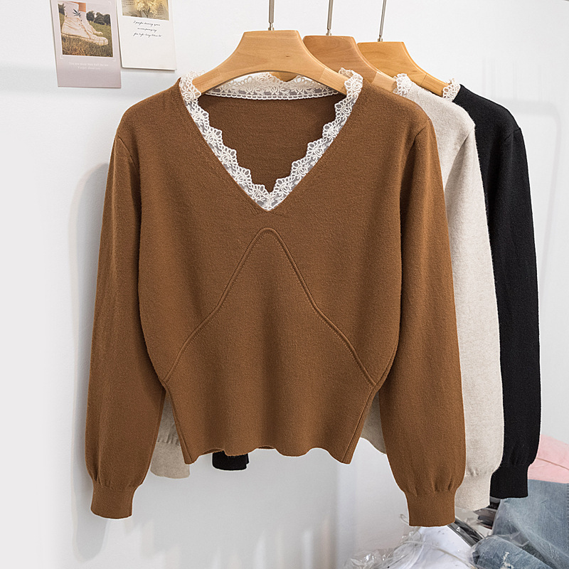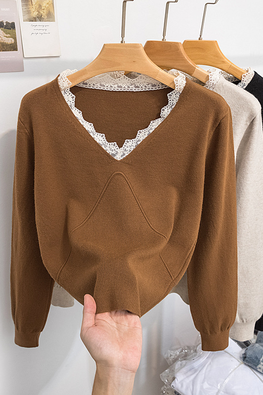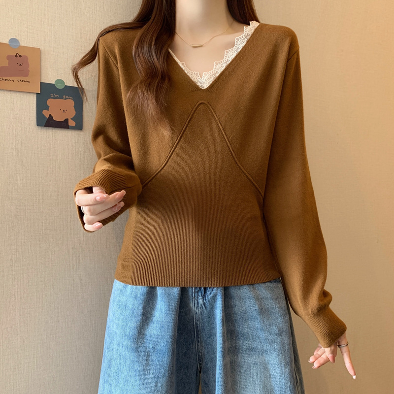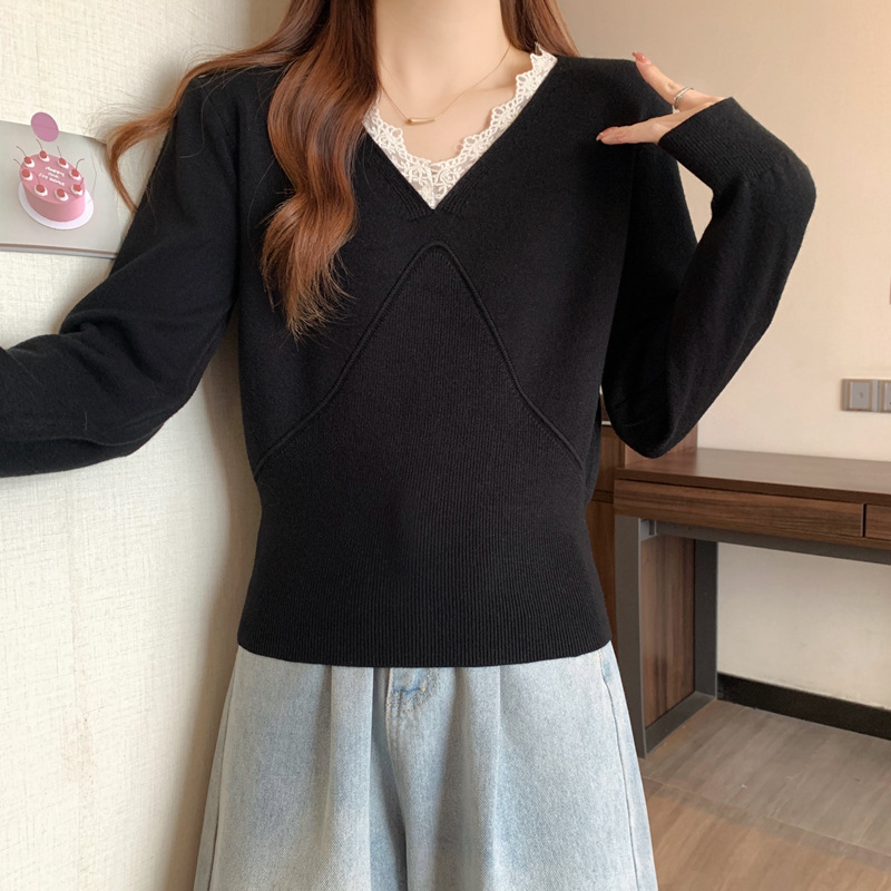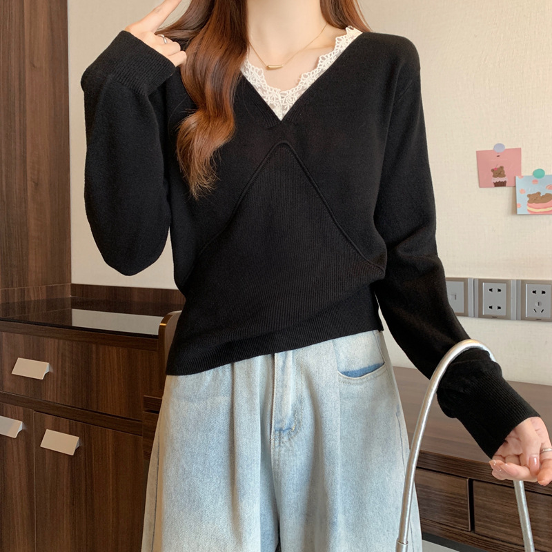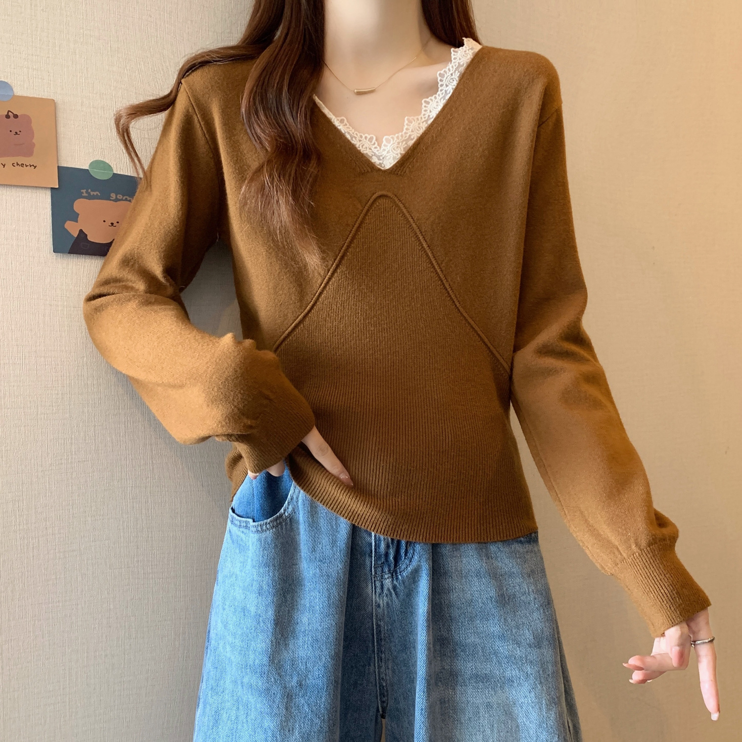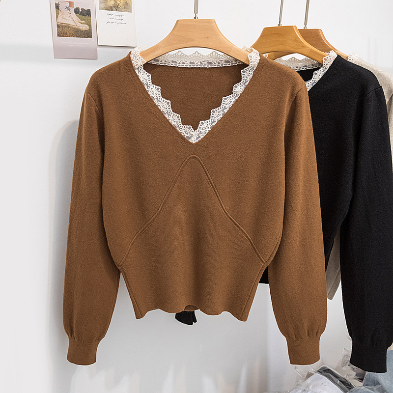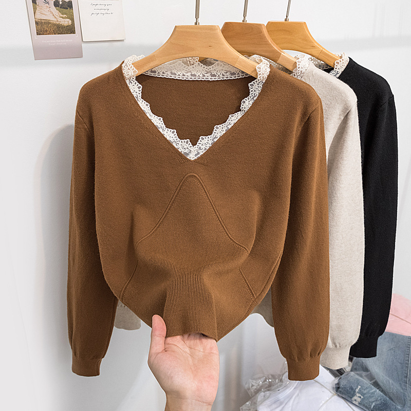 리얼 샷 ~ 플러스 사이즈 여성 통통녀 레이스 v-neck 가을과 겨울 2023 느슨한 슬림 새로운 스웨터 풀오버 스웨터
