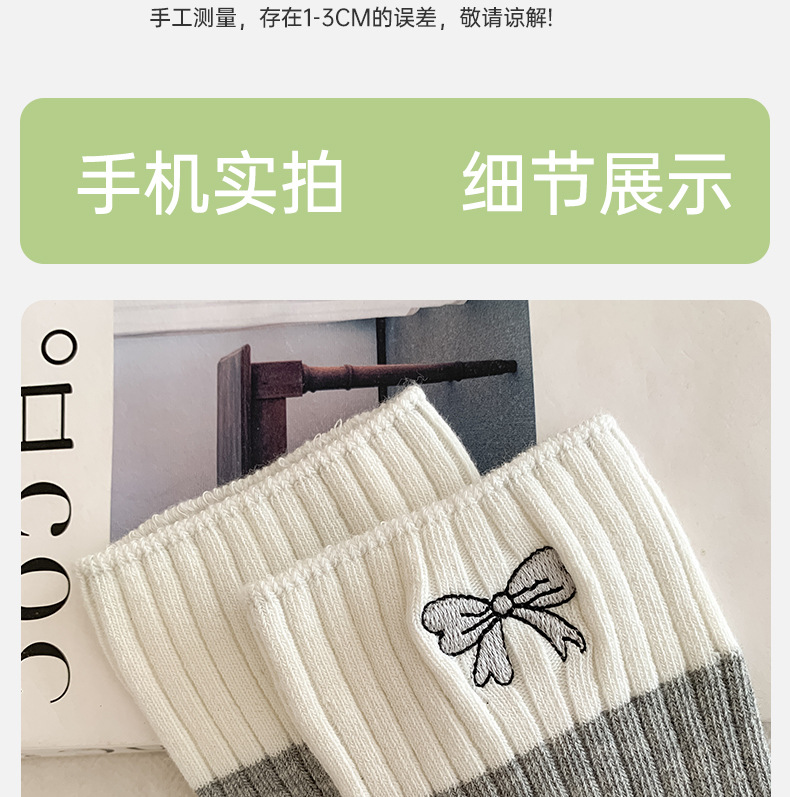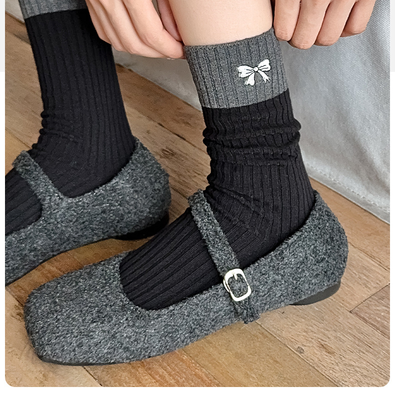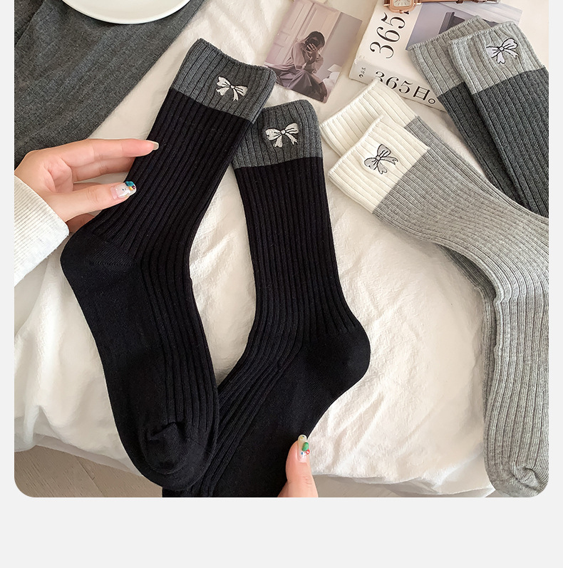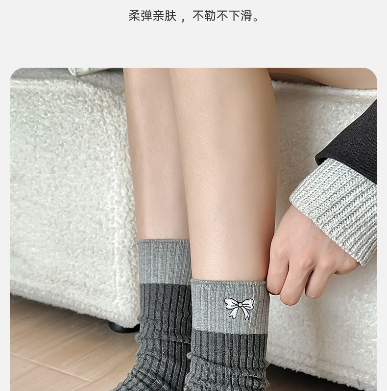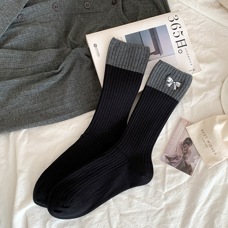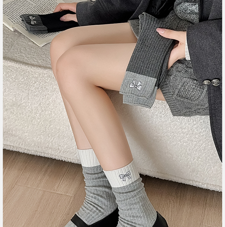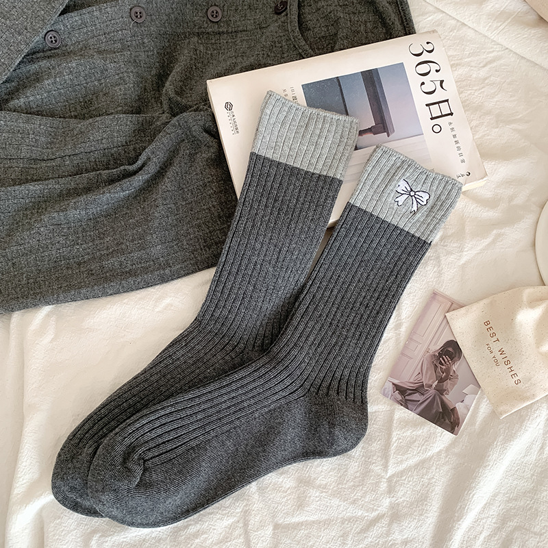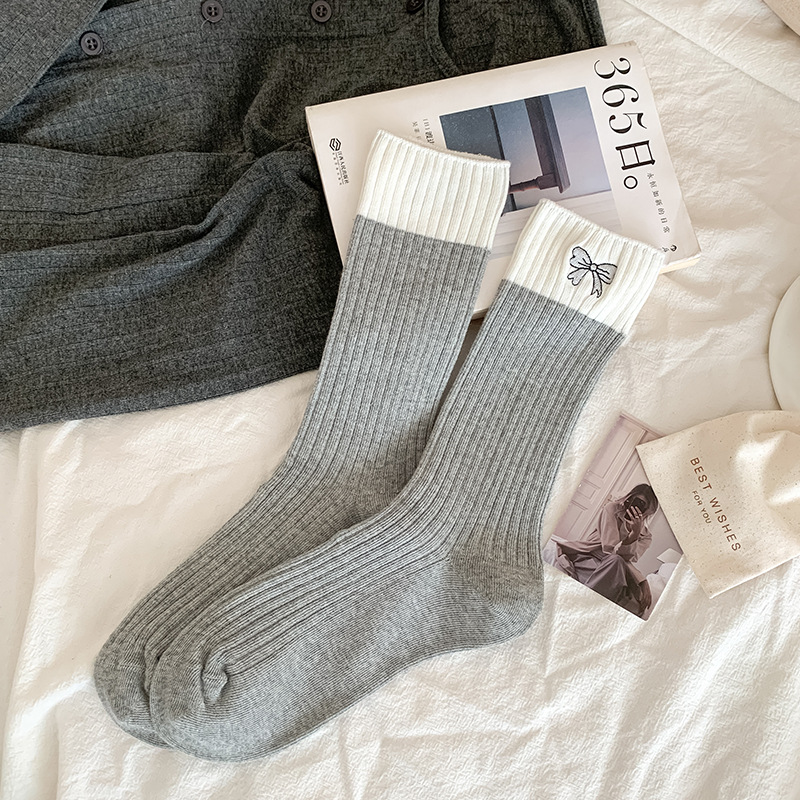 회색 양말 여성용 가을 겨울 순면 중목 양말 리본 자수 배색 여성 양말 항균 방취 롤업 양말 롱 양말스토어 가기