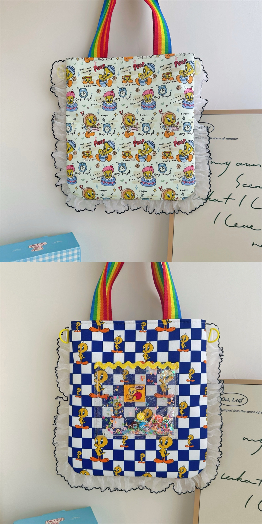 주름 레이스 레인보우 스트랩 대용량 만화 수제 어깨 가방 크로스 바디 가방 소녀 가방 AB 표면스토어 가기