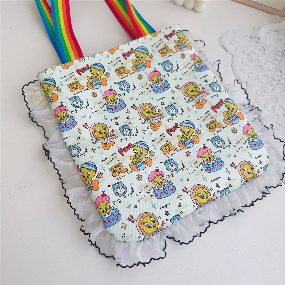주름 레이스 레인보우 스트랩 대용량 만화 수제 어깨 가방 크로스 바디 가방 소녀 가방 AB 표면