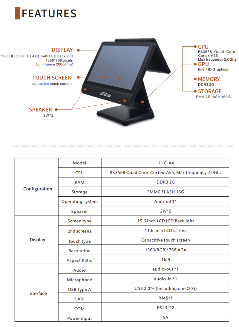 Junhong 15.6 인치 케이터링 테이크 아웃 금전 등록기 주문 기계 터치 스크린 지능형 금전 등록기 올인원 공장 국경 도매