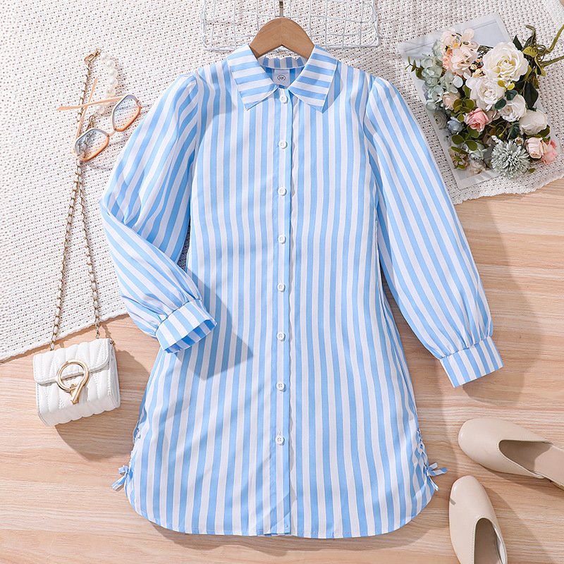 새끼 어린 이용 치마 대외 무역 소녀 아동복 2025 봄 새로운 아마존 캐주얼 스트라이프 긴 소매 중간 길이 셔츠 원피스