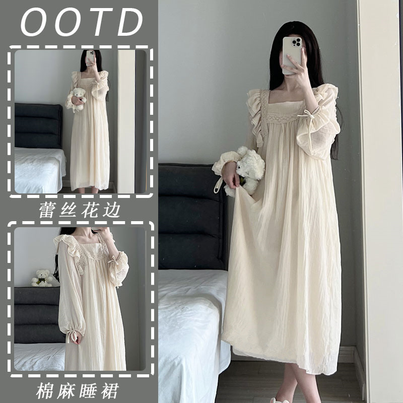 긴 소매 나이트가운 여성의 봄과 가을 새로운 달콤한 솔리드 컬러 하이 그레이드 레이스 레이스 러플 파자마 스커트 홈 의류스토어 가기