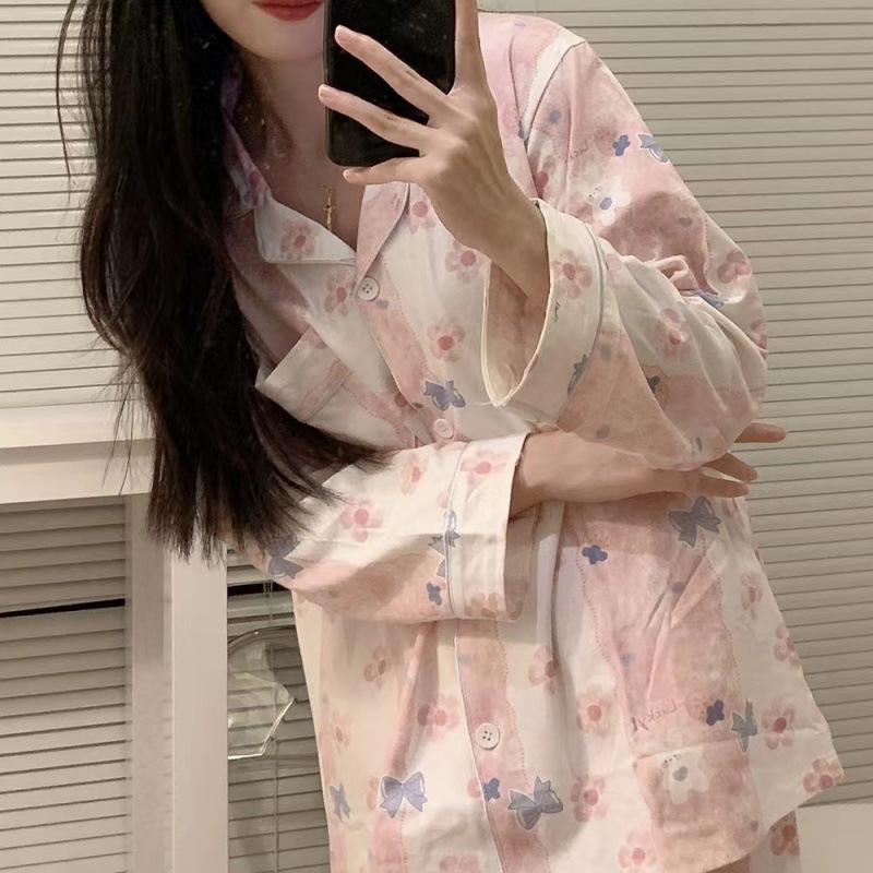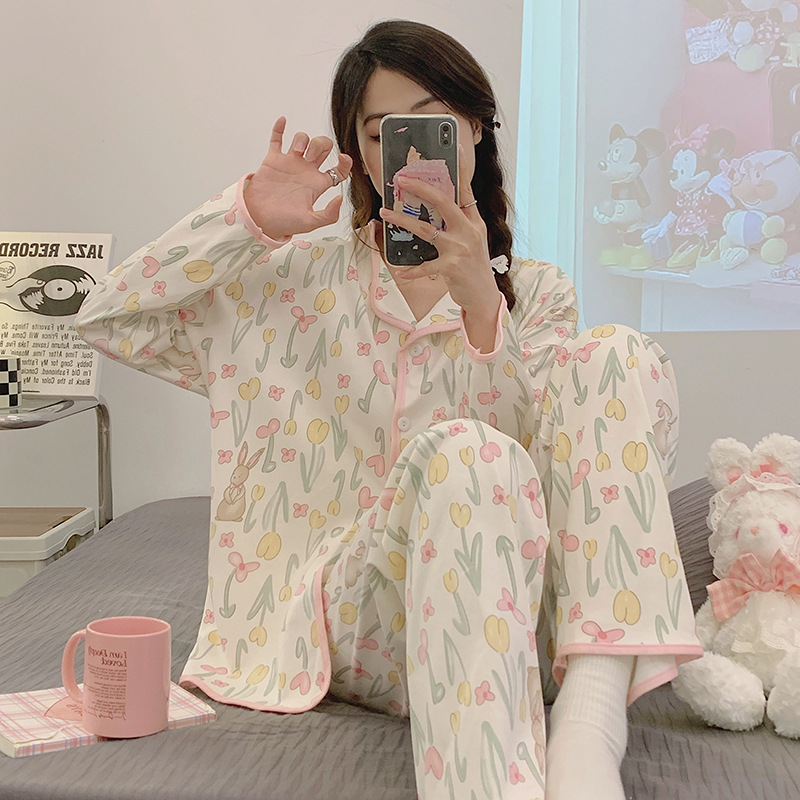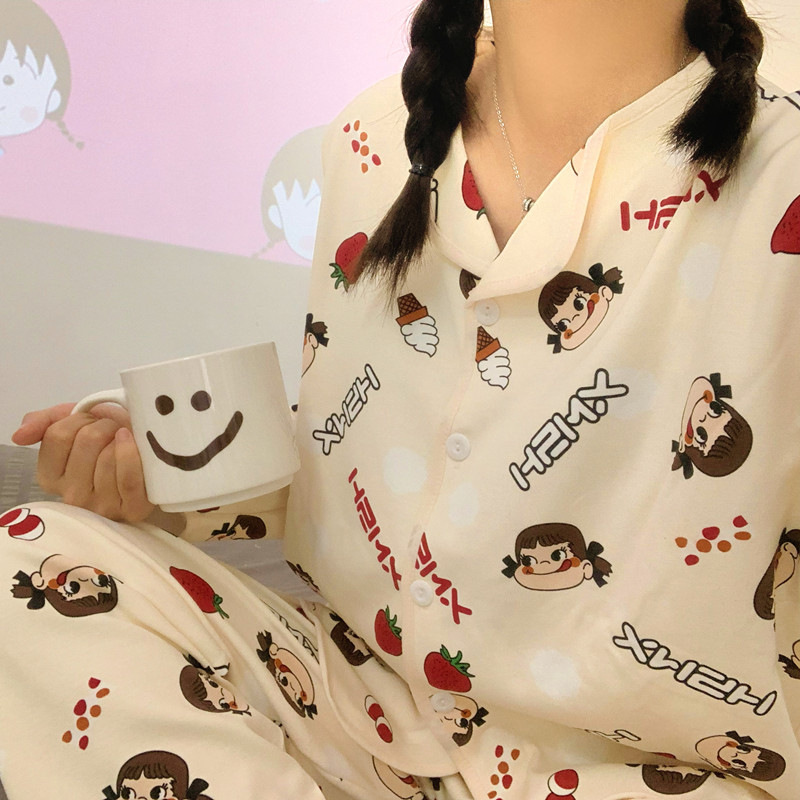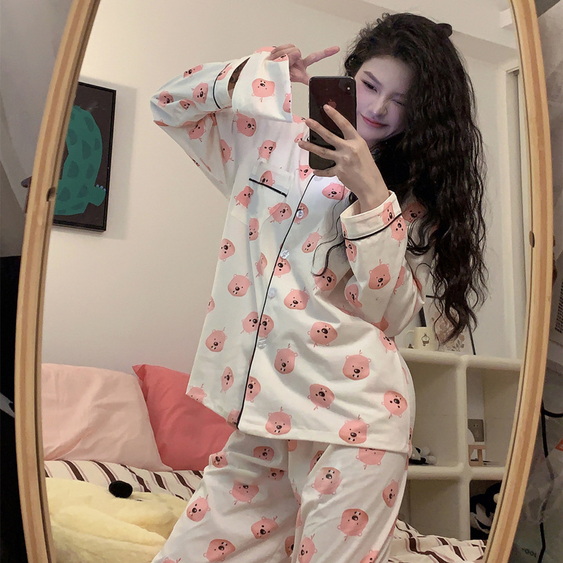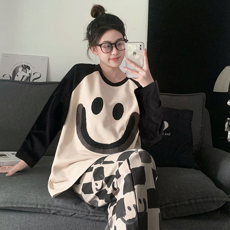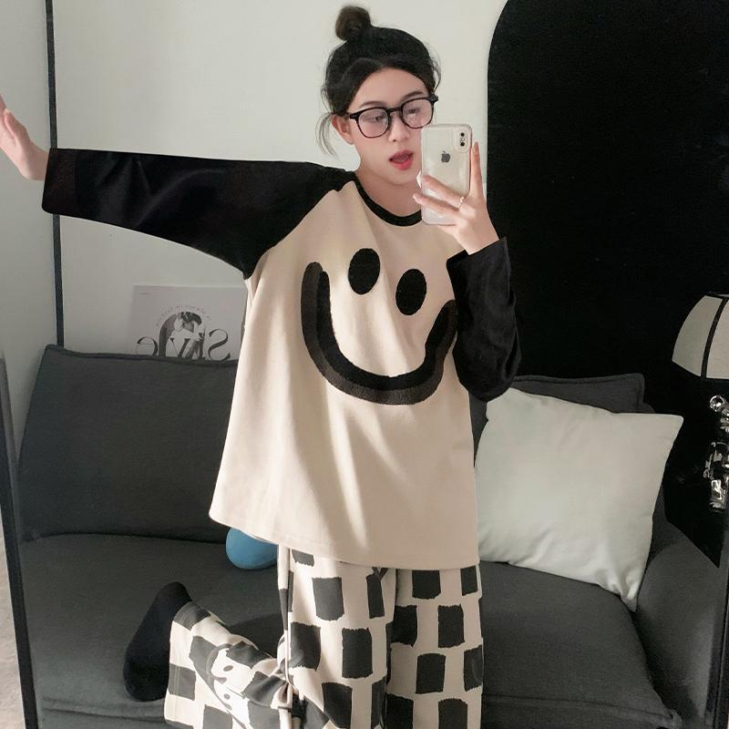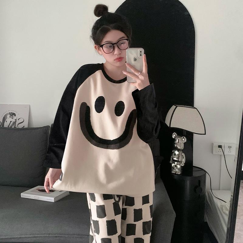 가을 겨울 잠옷 여성용 긴팔 바지 크루 넥 풀오버 한국 스타일 소녀 만화 스마일리 홈 옷 간단한 세트스토어 가기