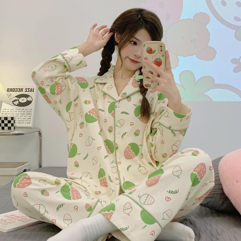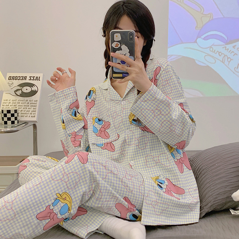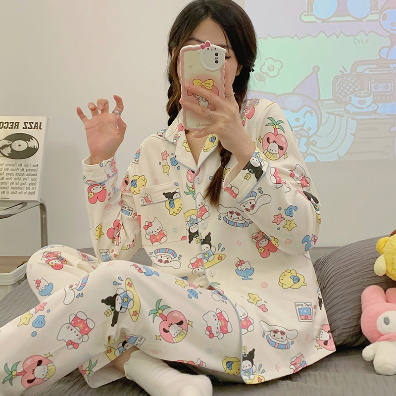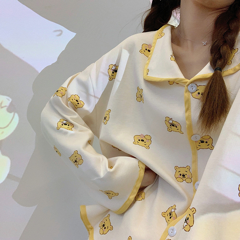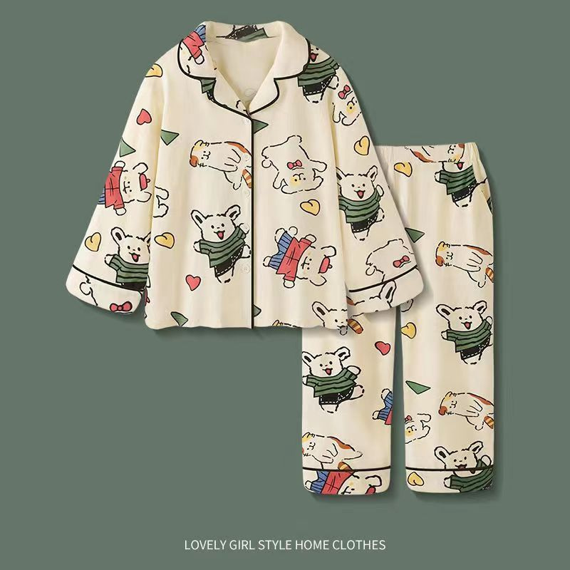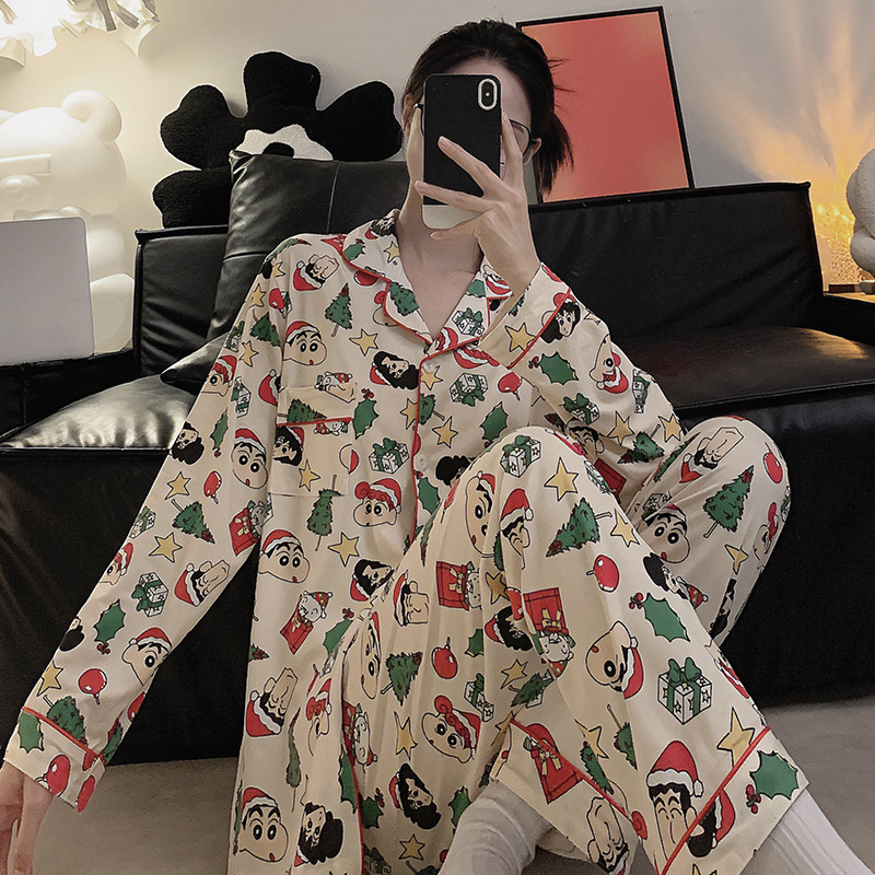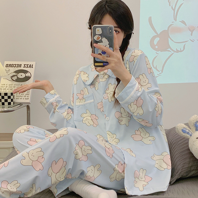 가을 겨울 잠옷 여성용 긴팔 바지 크루 넥 풀오버 한국 스타일 소녀 만화 스마일리 홈 옷 간단한 세트스토어 가기