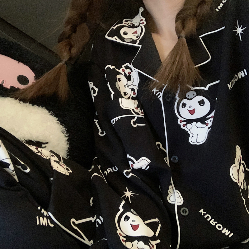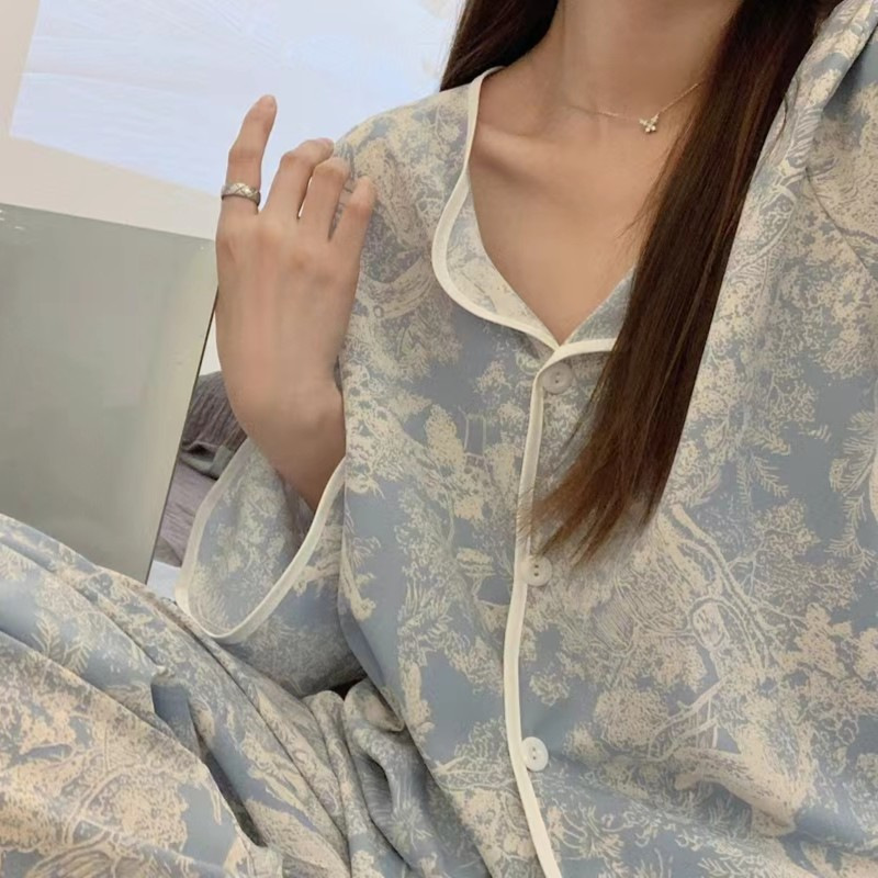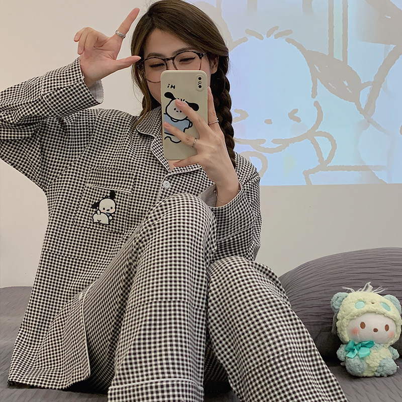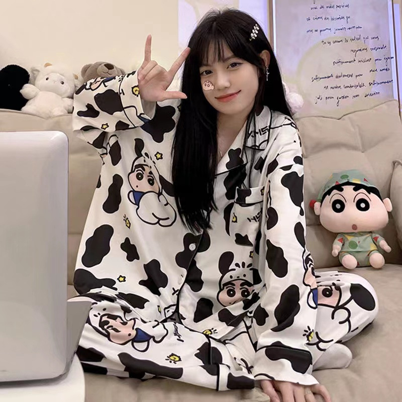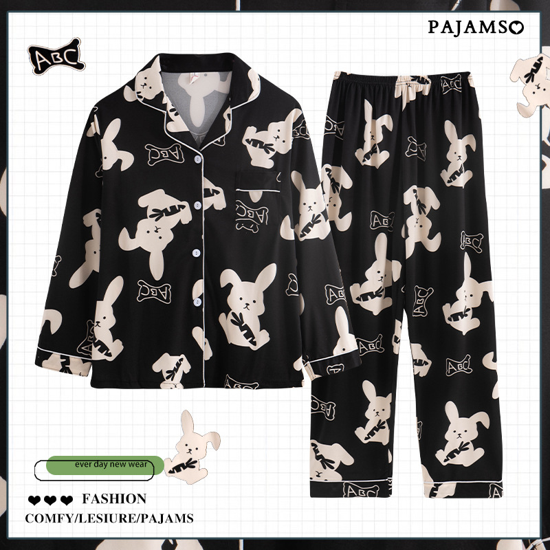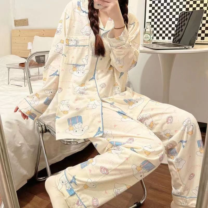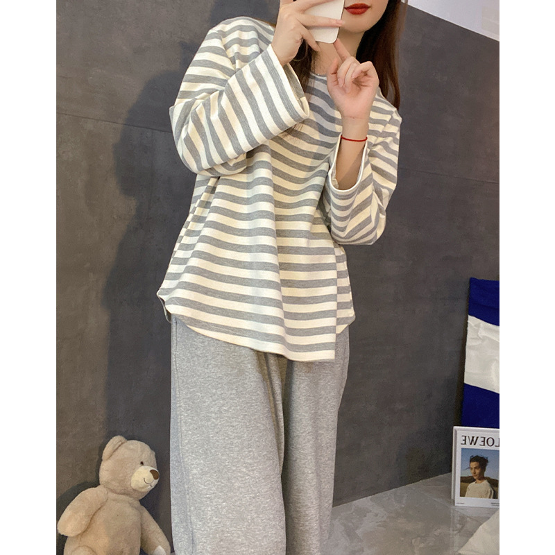 가을 겨울 잠옷 여성용 긴팔 바지 크루 넥 풀오버 한국 스타일 소녀 만화 스마일리 홈 옷 간단한 세트스토어 가기